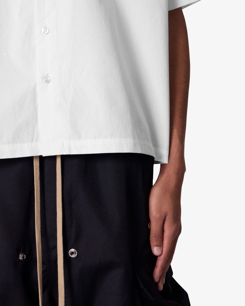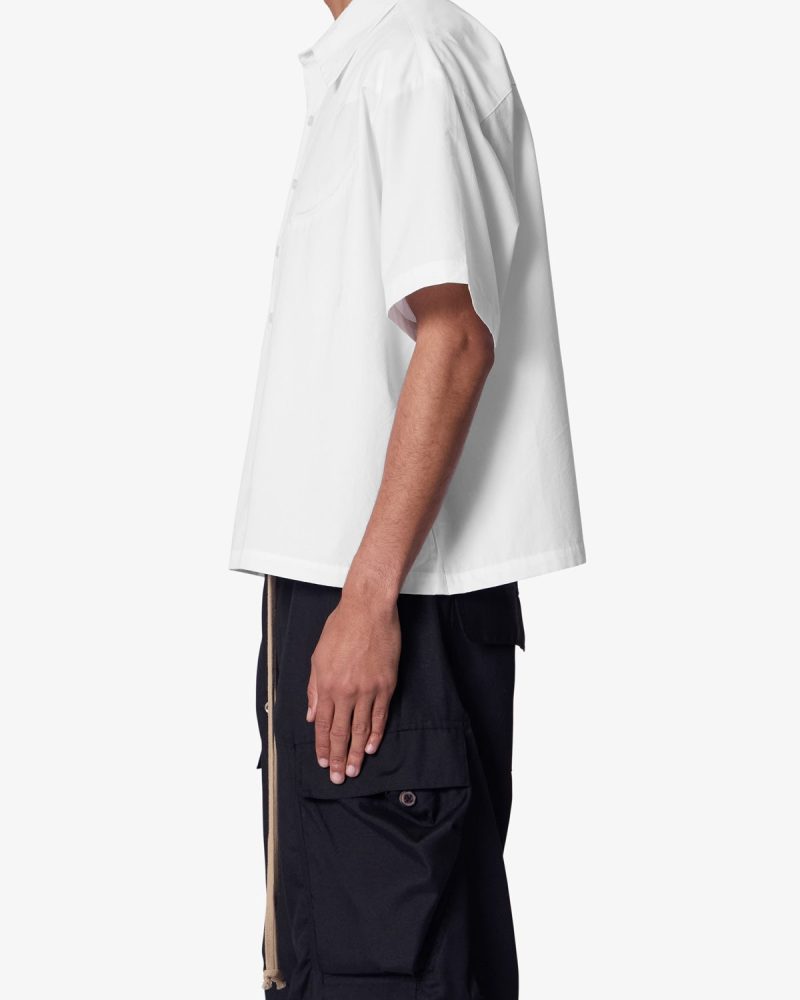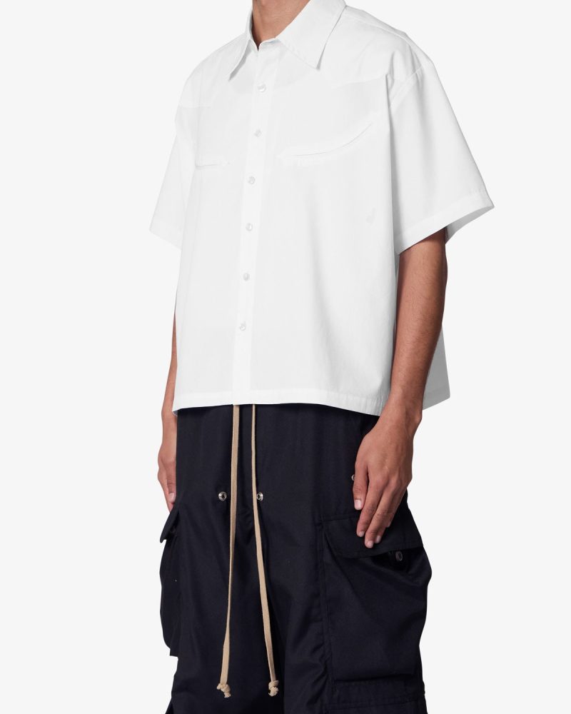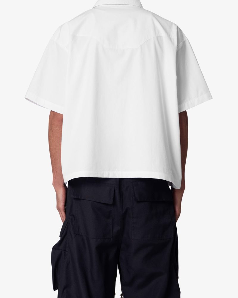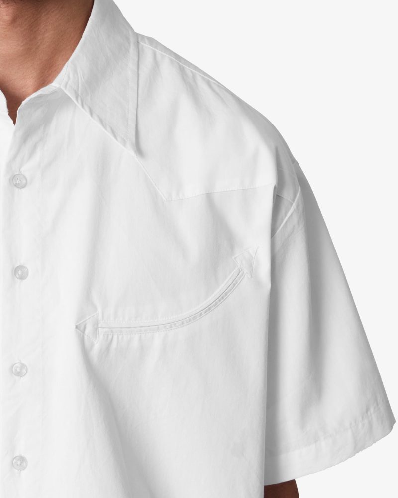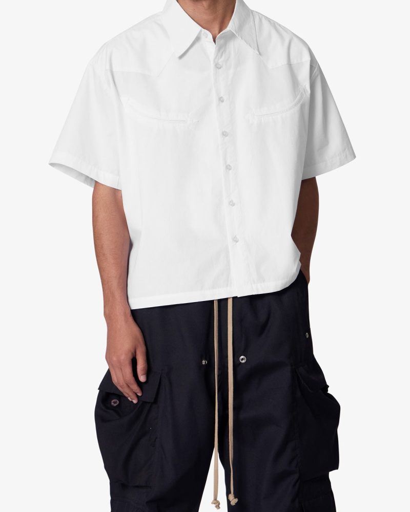 the Western Button Up Shirt is made from a 100% cotton fabric. The relaxed-fit shirt features a button placket. a flat and cropped hem. and is finished with smile pockets on the chest.