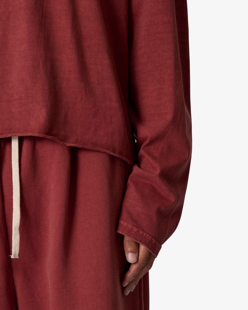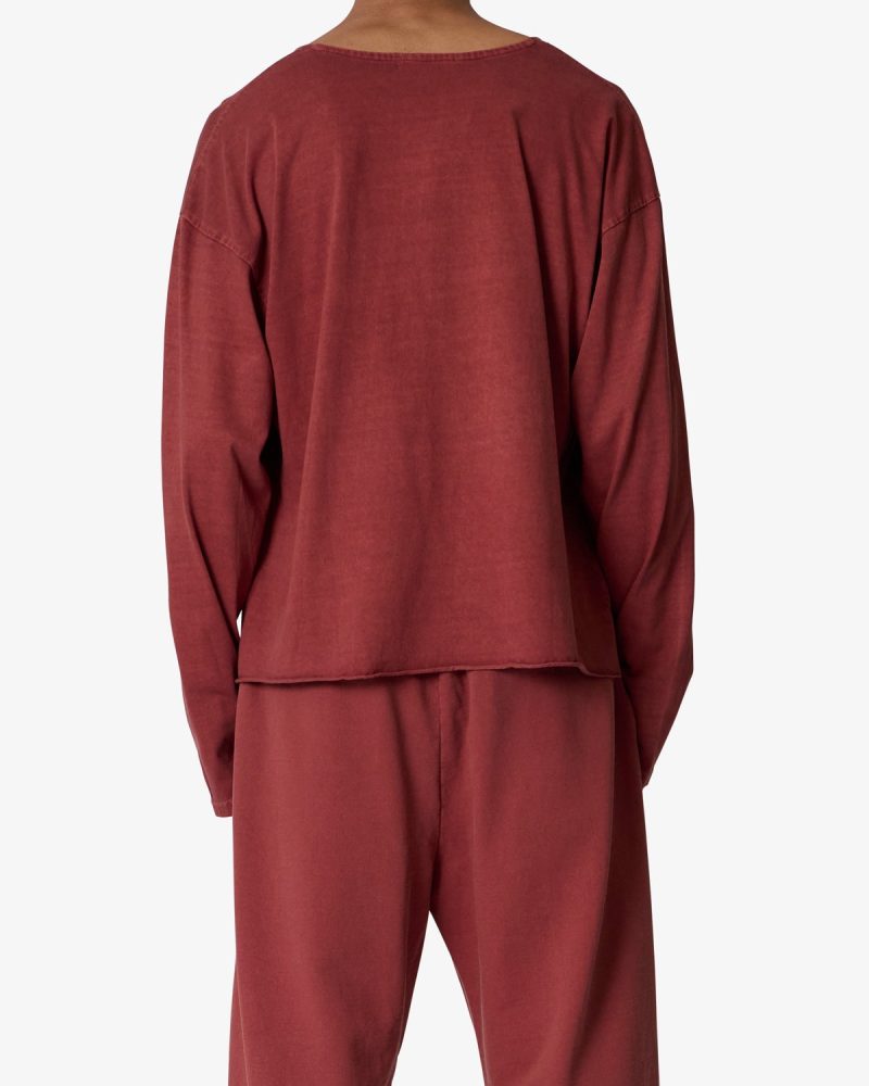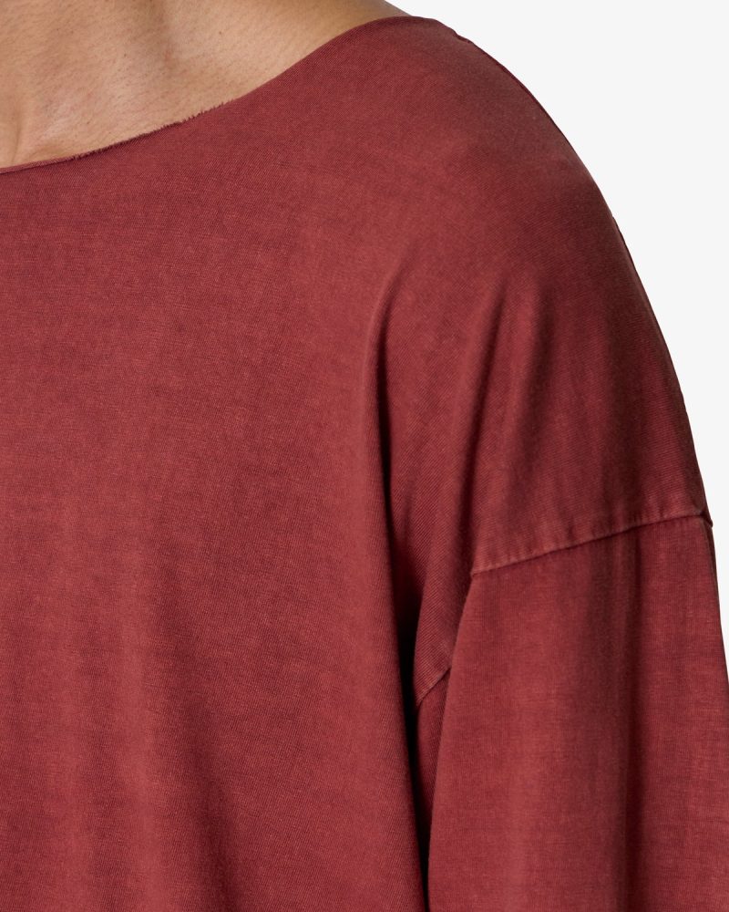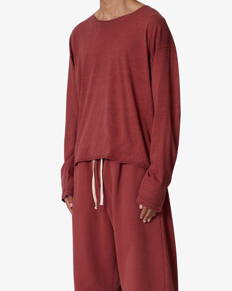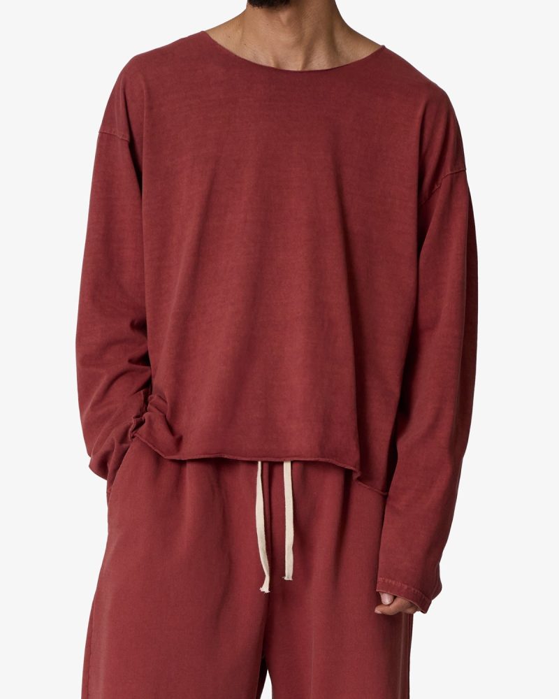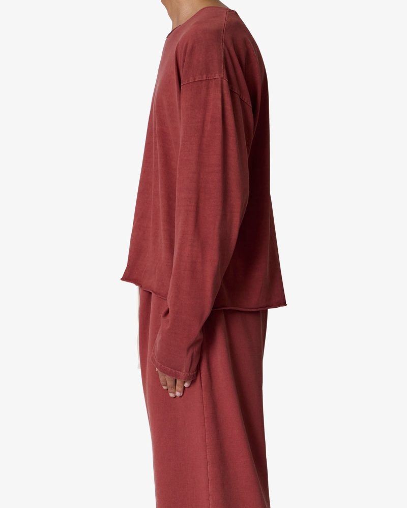 the Long Sleeve Tee features a relaxed fit with a dropped shoulder design. standard hem detail at the wrists. raw edge at the collar and bottom opening. and is finished in a garment washed cotton fabric.