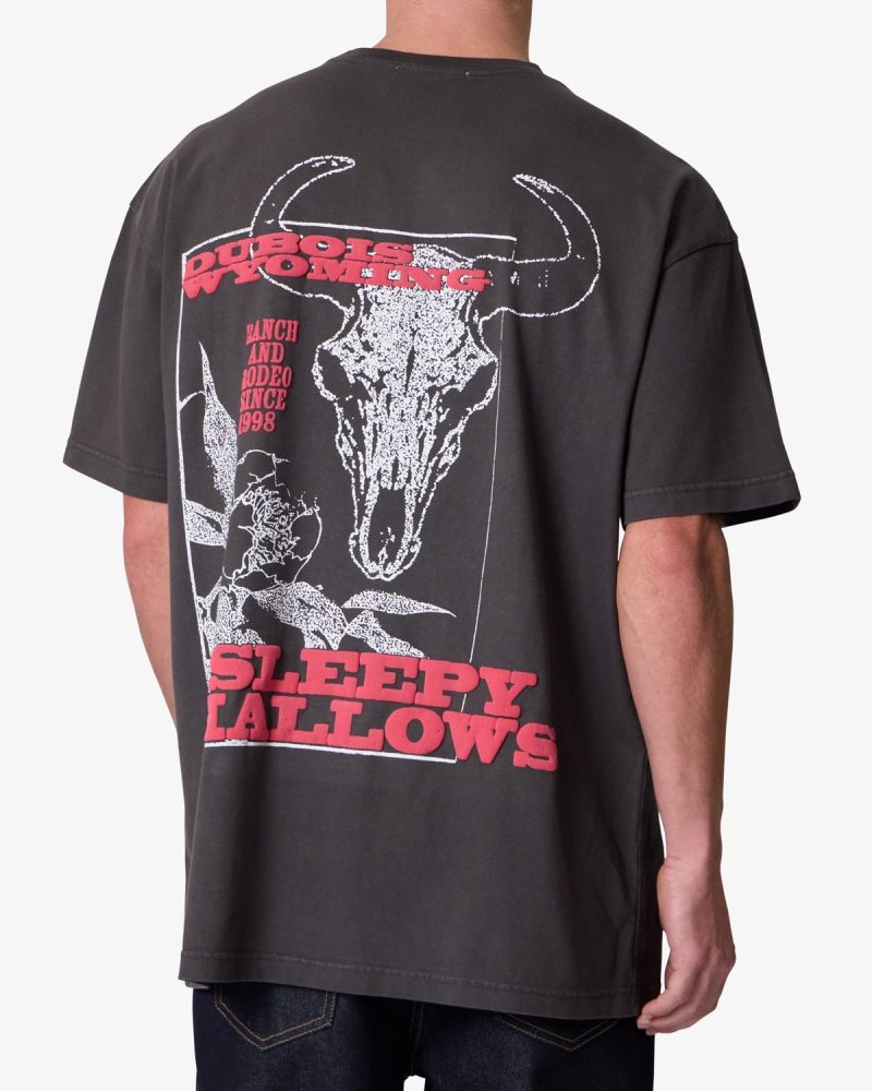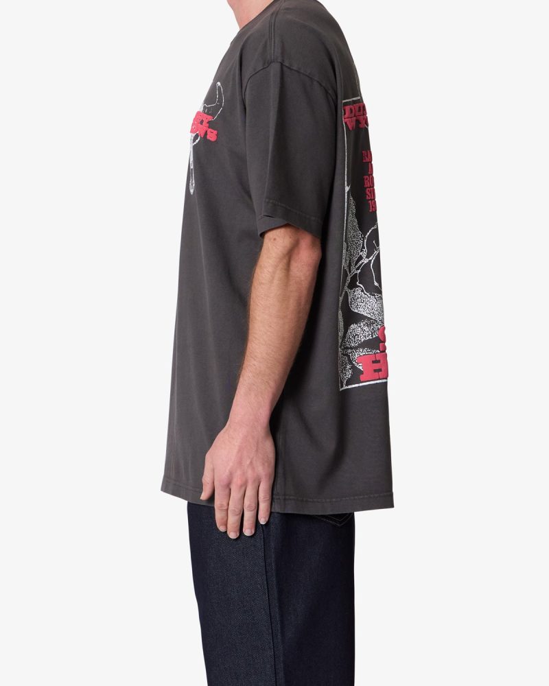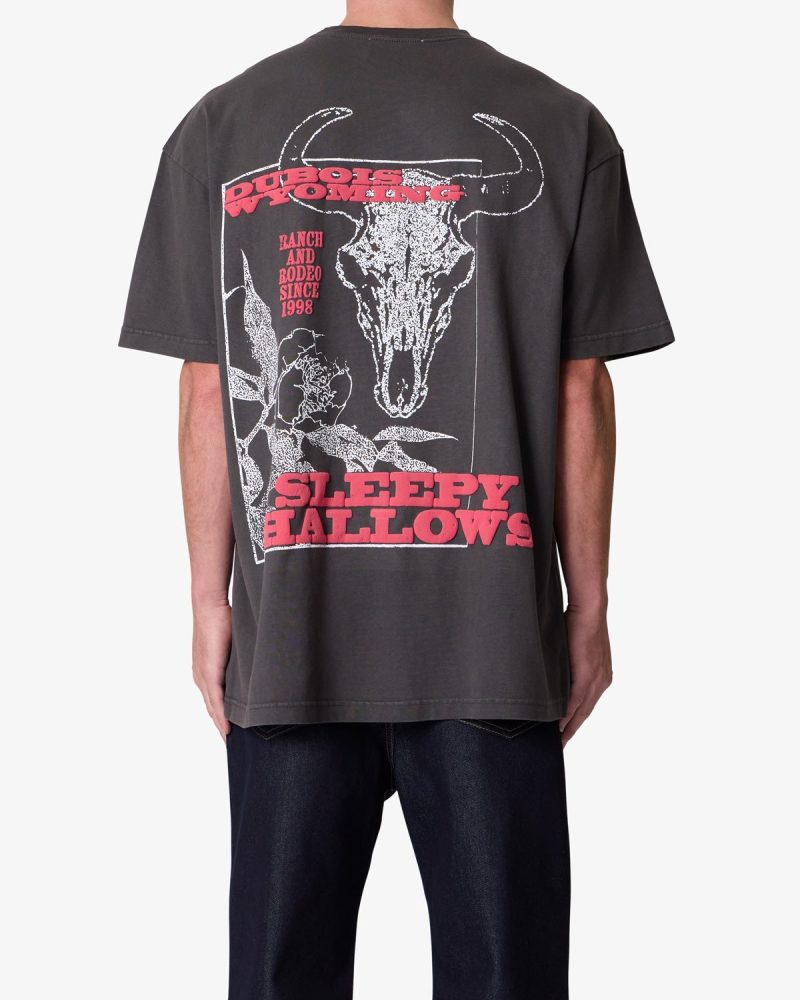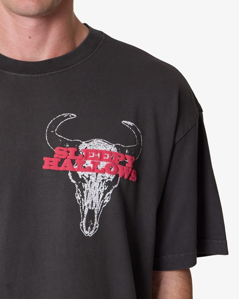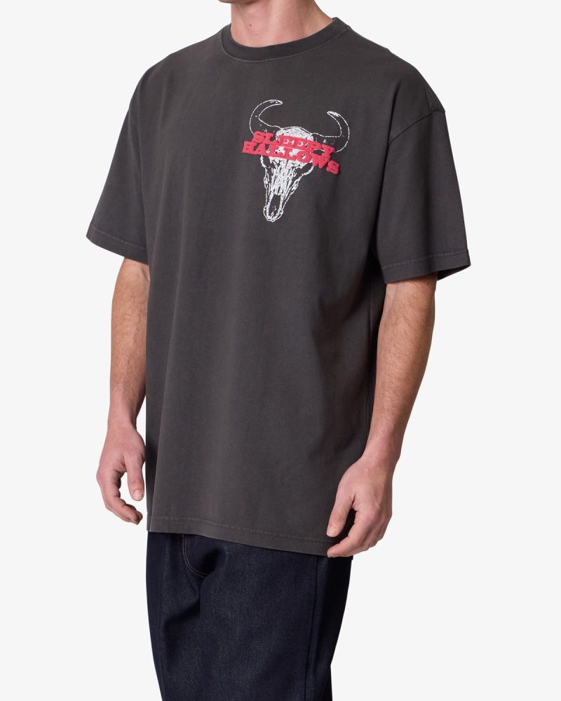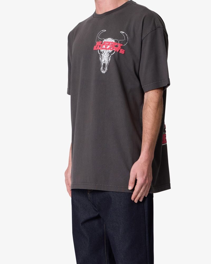 The Bullskull Tee features a relaxed and boxy fit. ribbing at the neck. a standard hem. printed graphics on the front and back. and finished with a garment dye for a vintage feel.