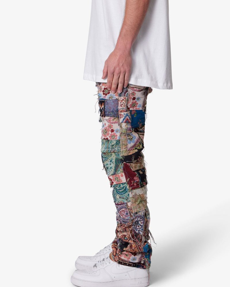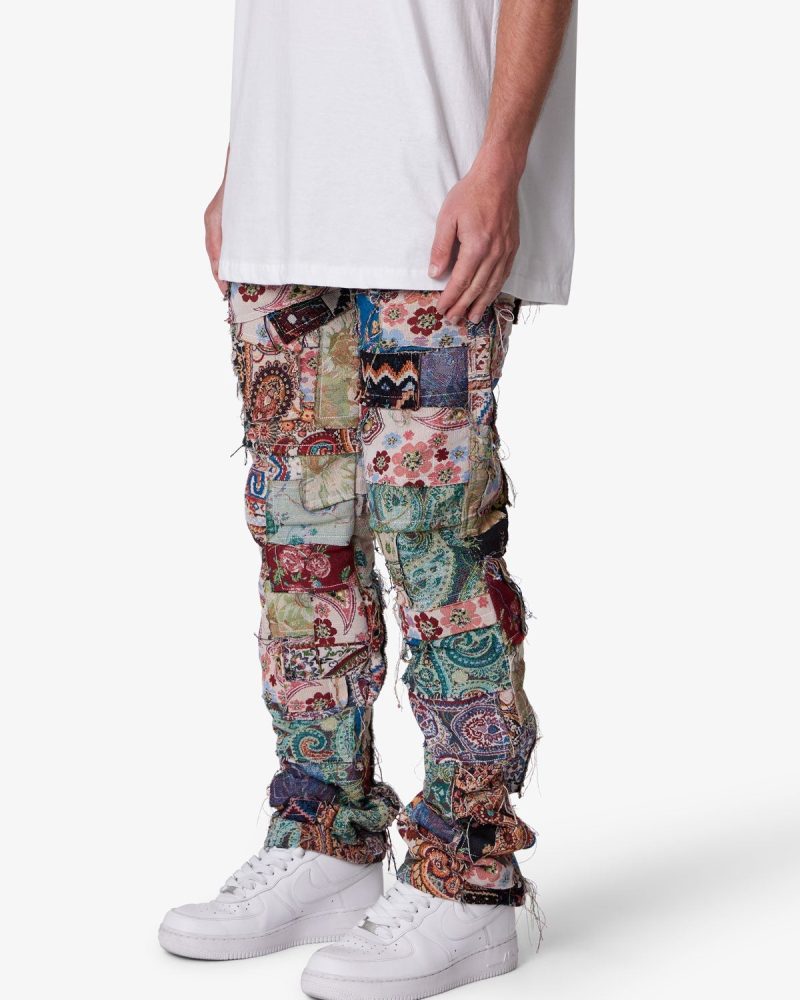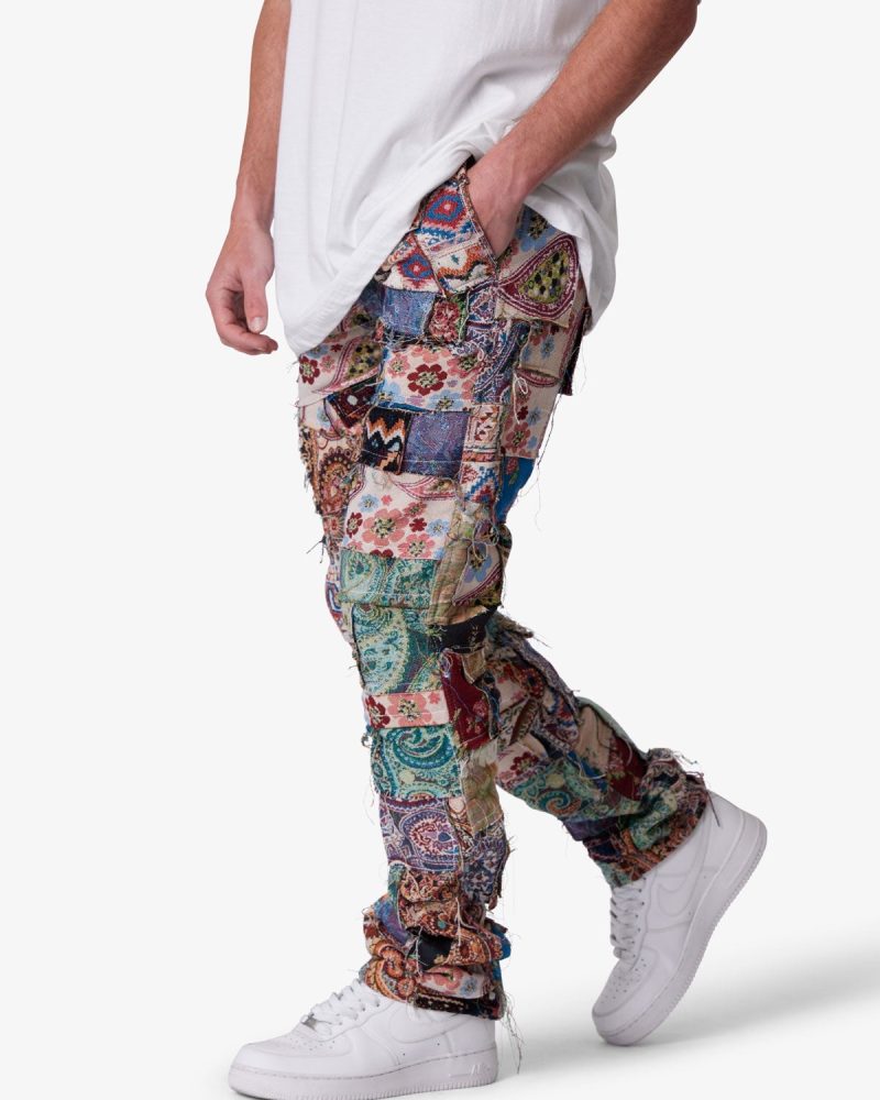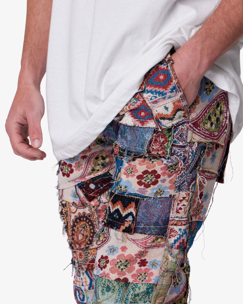 the Paneled Blanket Pants are designed with a relaxed fit throughout. five pocket pant details. constructed from patchwork panels of custom jacquard woven blanket pieces. and finished with a rinse wash..