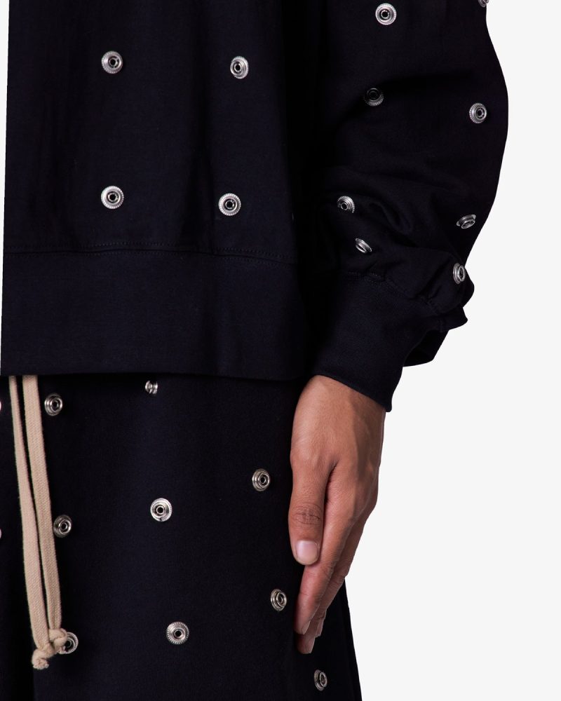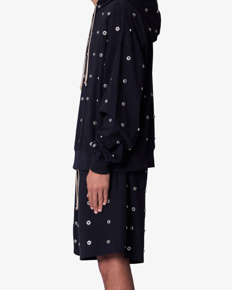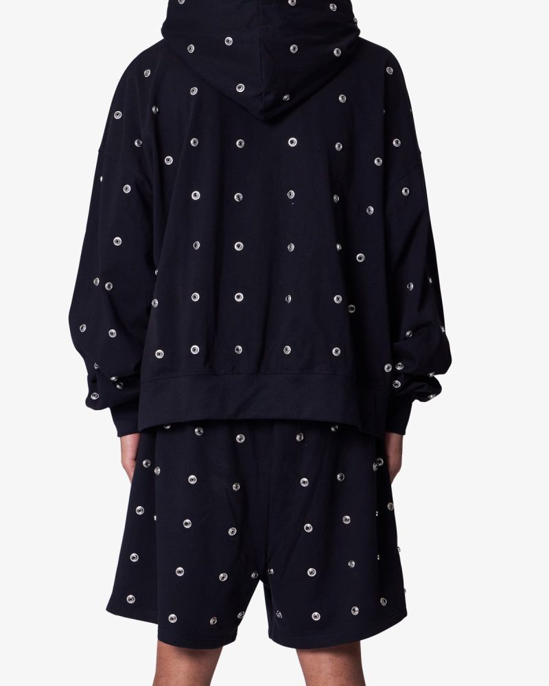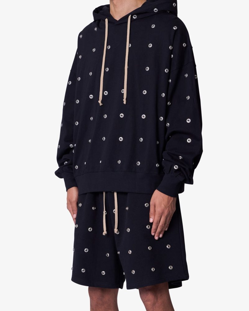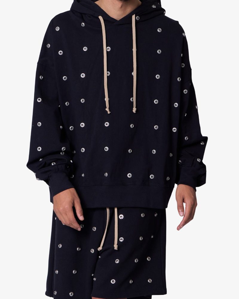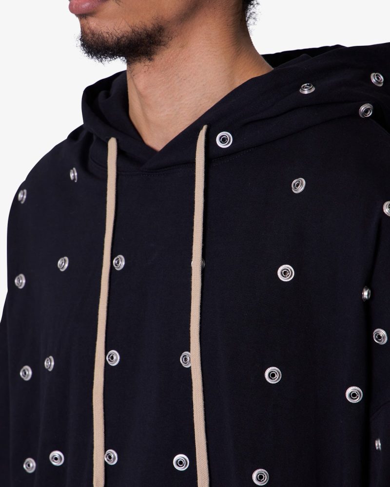 the All Over Button Hoodie features a relaxed fit with a dropped shoulder design. front pouch pocket. ribbing at the wrists and waist. contrasting drawcord. snap button details throughout. and finished in a washed and brushed fleece fabric.