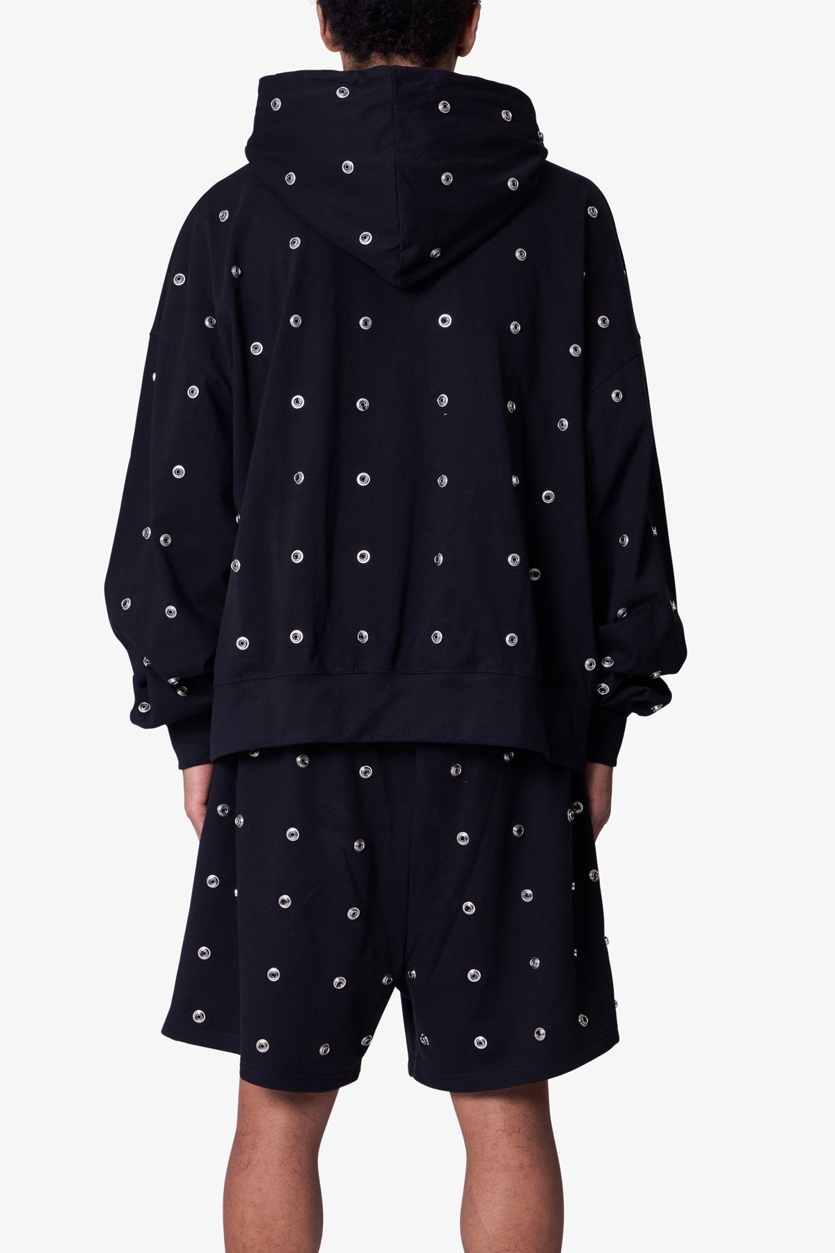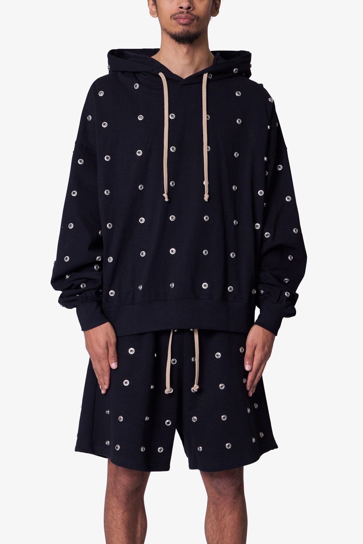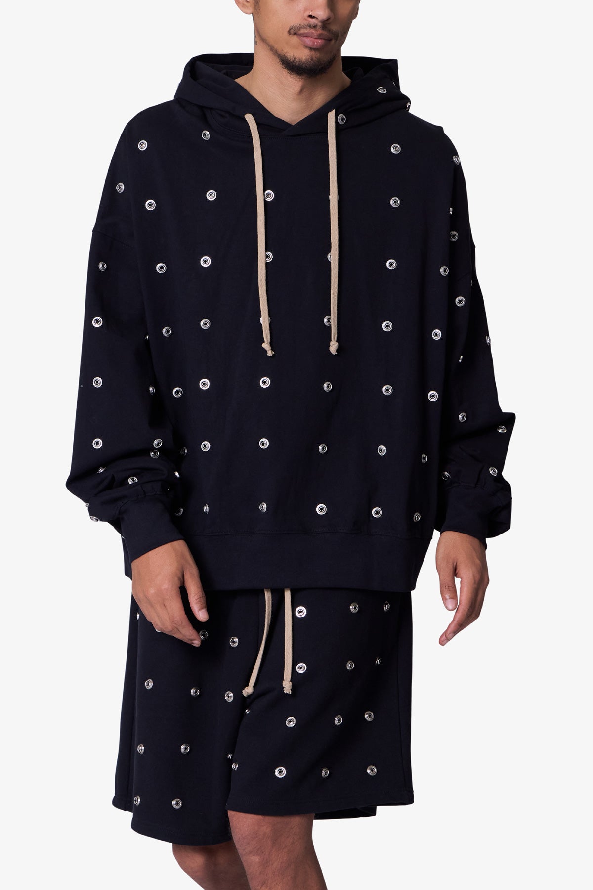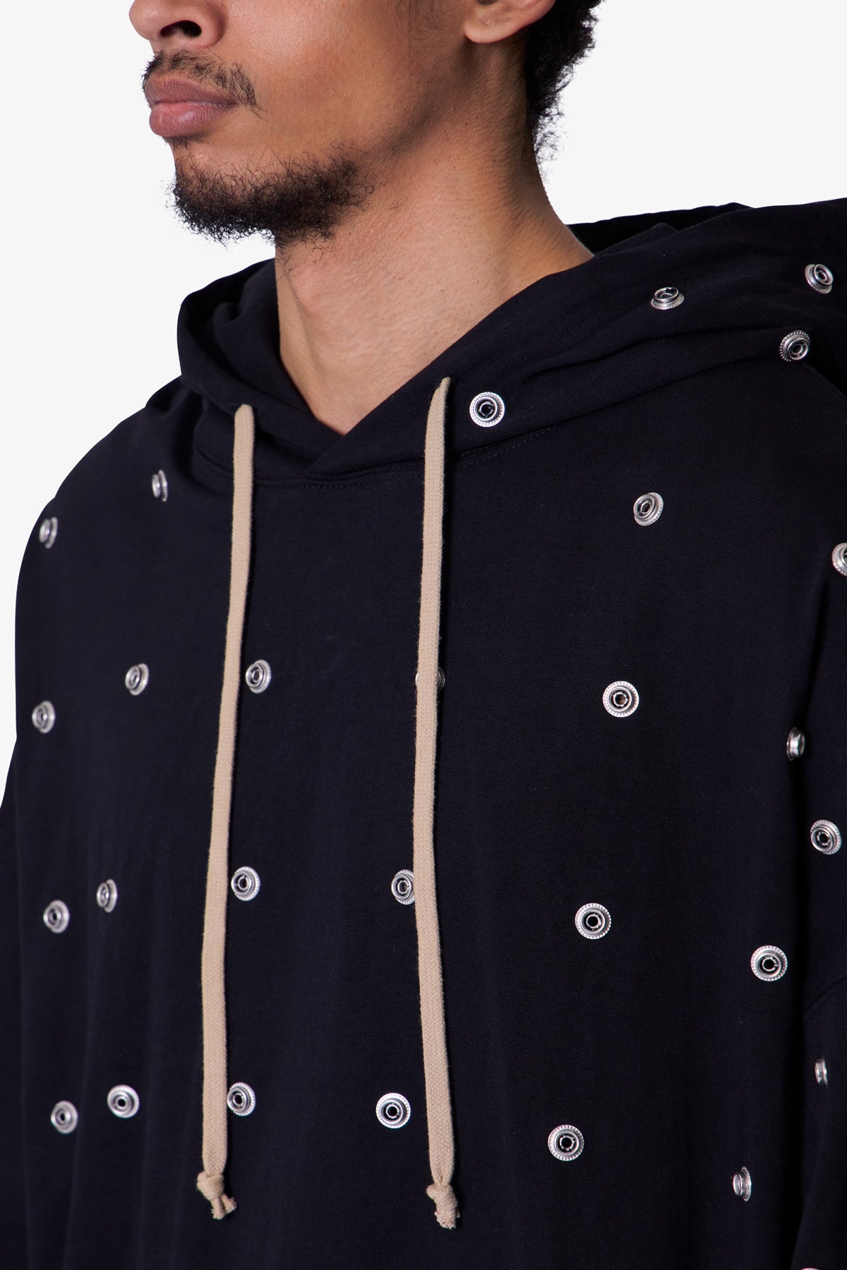 the All Over Button Hoodie features a relaxed fit with a dropped shoulder design. front pouch pocket. ribbing at the wrists and waist. contrasting drawcord. snap button details throughout. and finished in a washed and brushed fleece fabric.