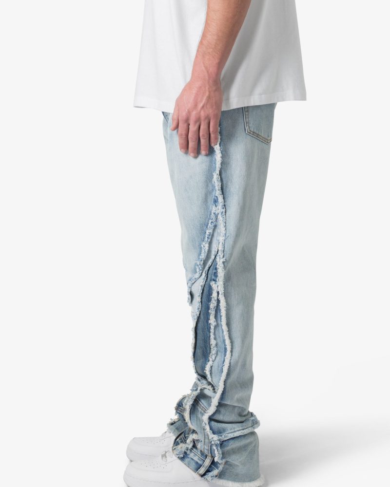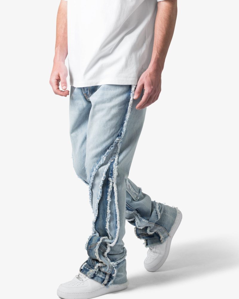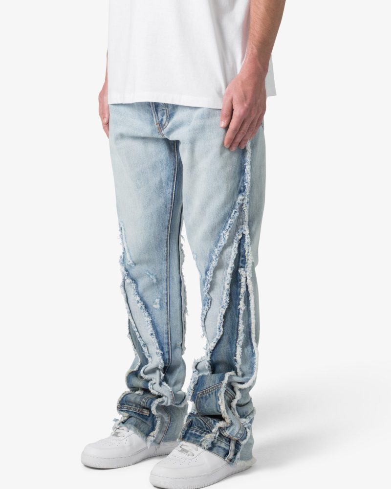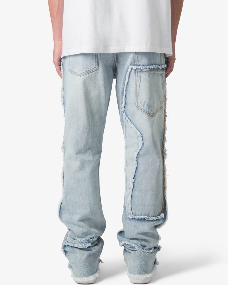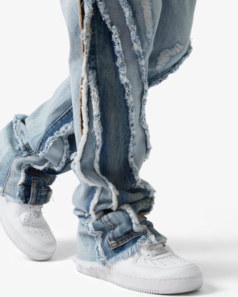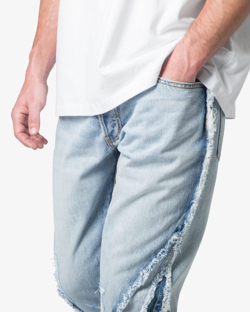 the B373 Patch Flare Denim are designed with our new B fit. which are relaxed through the thigh and features a slight flare at the leg opening and is constructed from vintage washed blue denim. patchwork panelling down the leg from contrasting blue denim for a slight flare and finished offset flare detail at the hem.