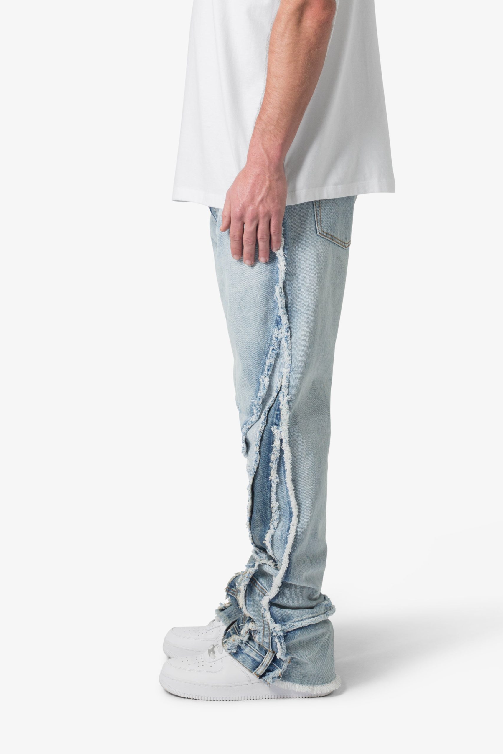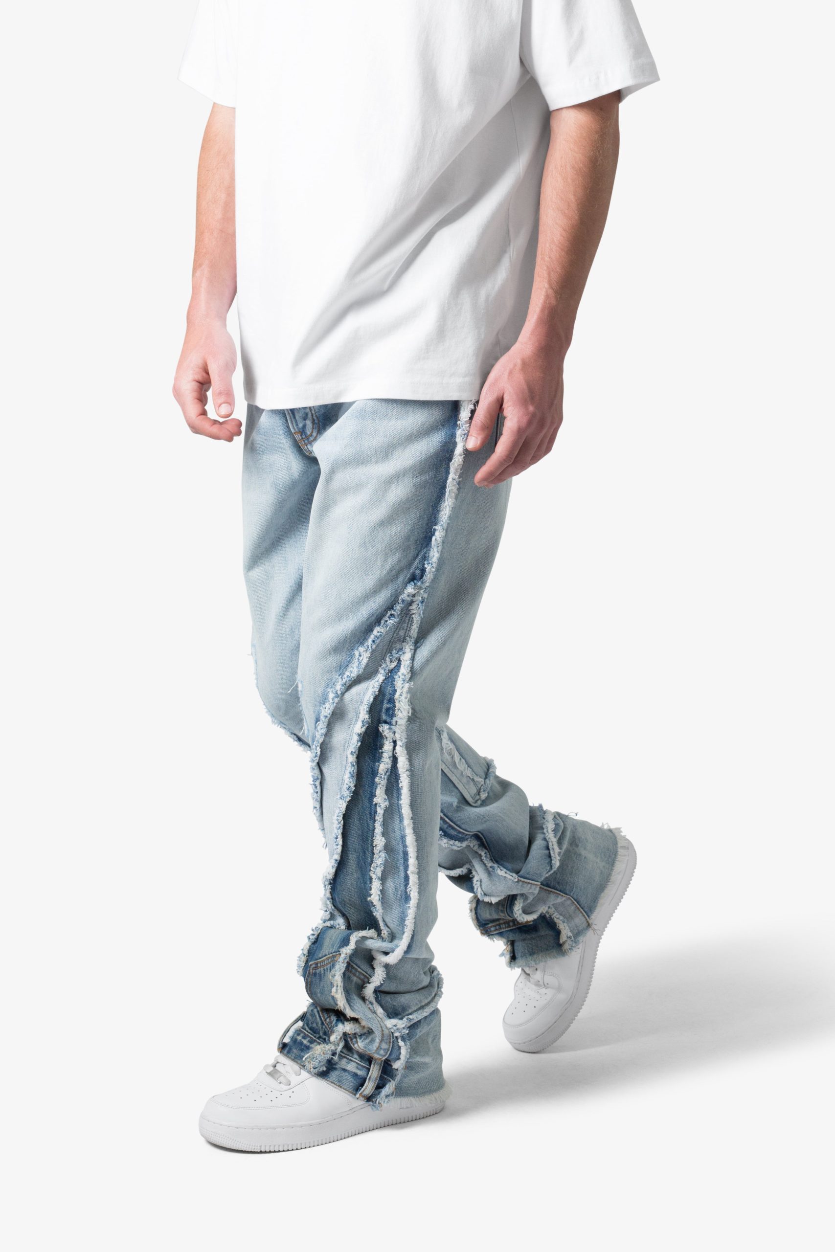 the B373 Patch Flare Denim are designed with our new B fit. which are relaxed through the thigh and features a slight flare at the leg opening and is constructed from vintage washed blue denim. patchwork panelling down the leg from contrasting blue denim for a slight flare and finished offset flare detail at the hem.
