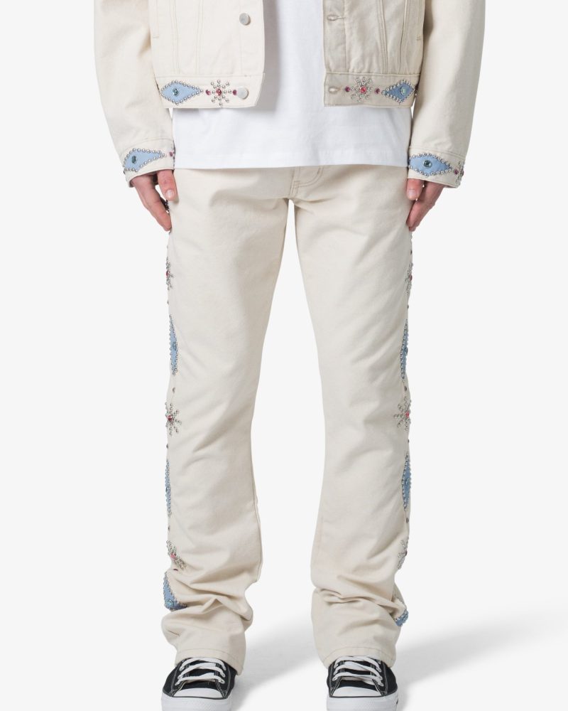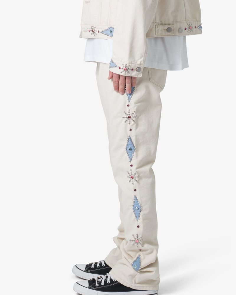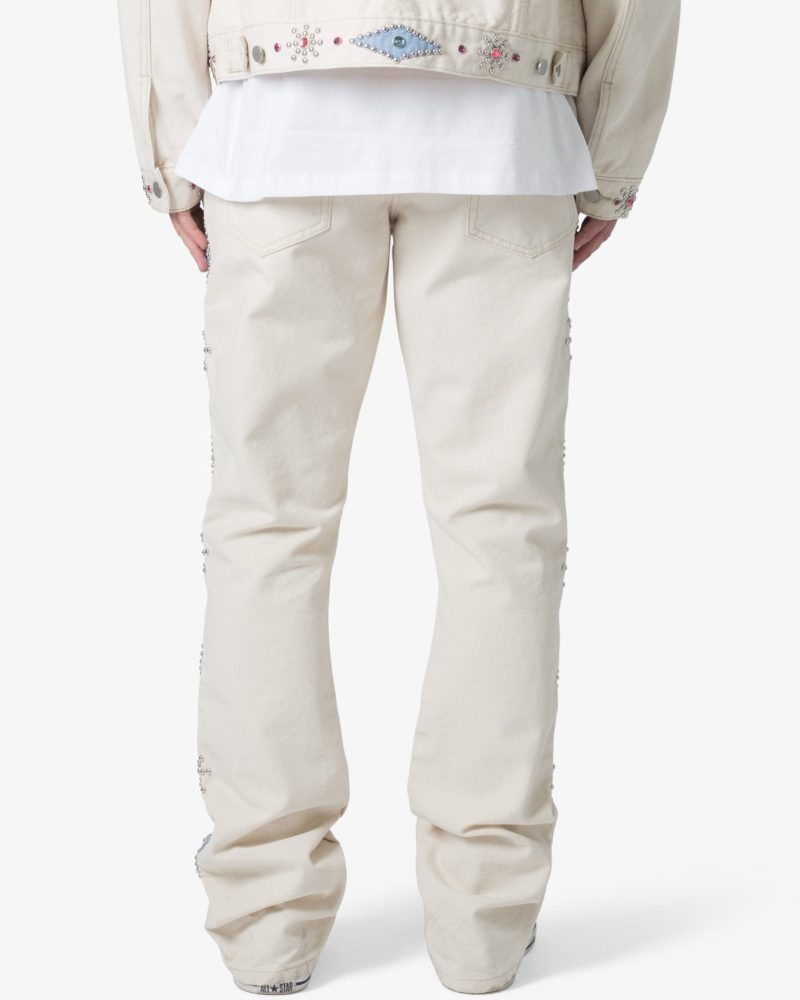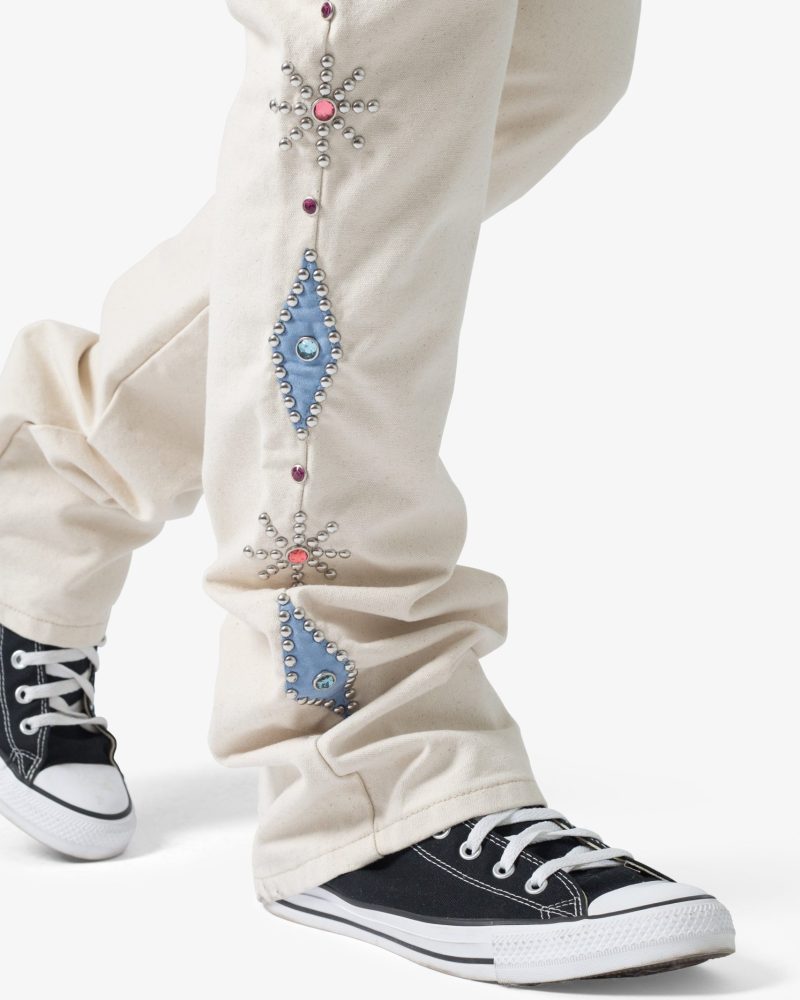 the B379 Studded Flare Denim are designed with our new B fit. which is relaxed through the thigh and features a slight flare at the leg opening and is constructed from a natural cotton colored denim. and finished with contrasting studding detail at the outseam and around the pockets.