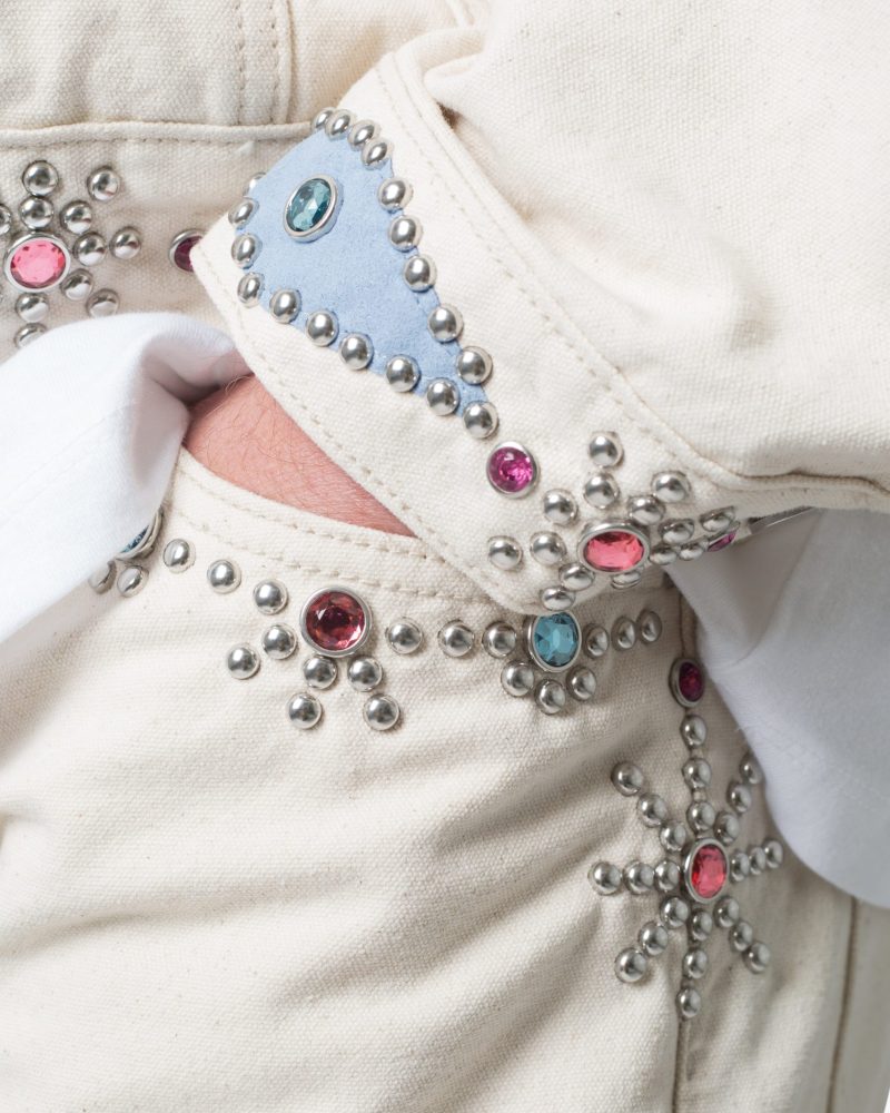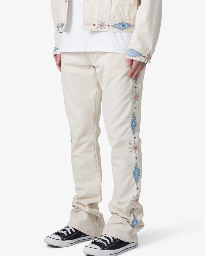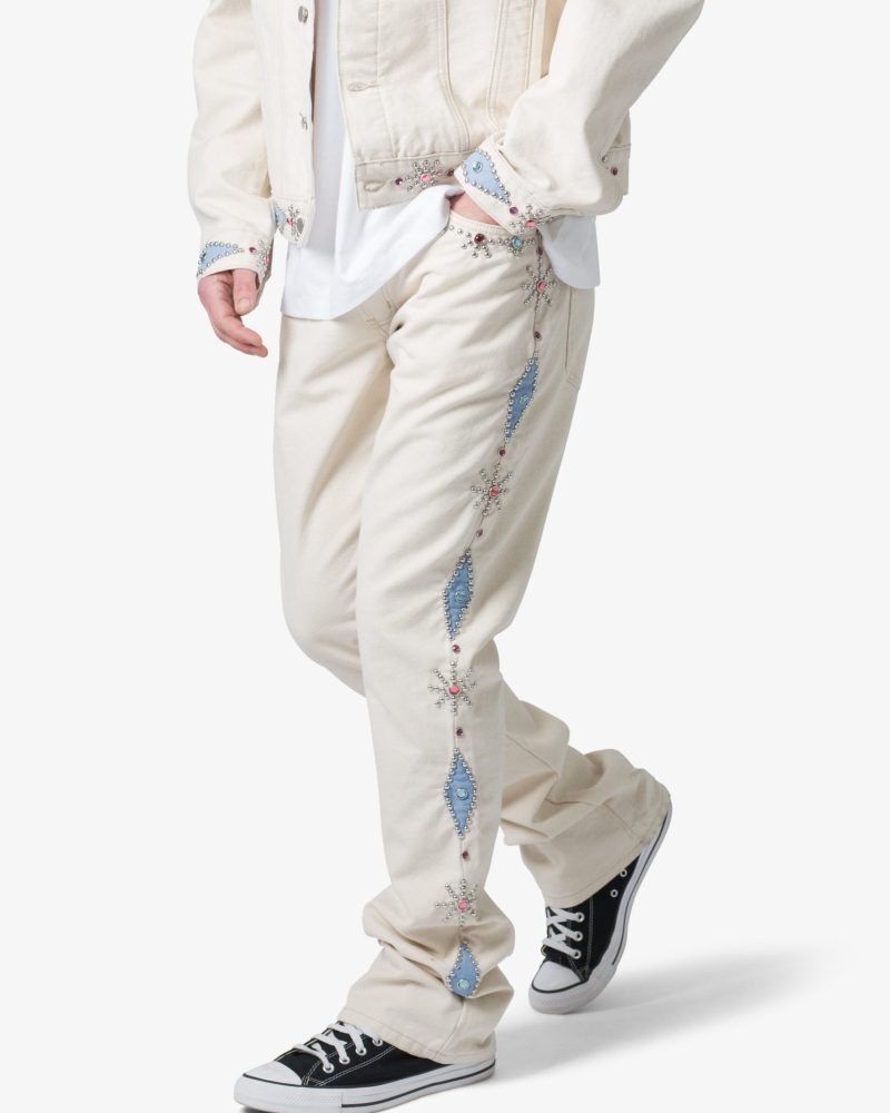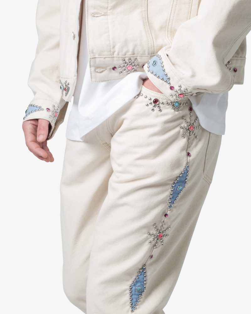 the B379 Studded Flare Denim are designed with our new B fit. which is relaxed through the thigh and features a slight flare at the leg opening and is constructed from a natural cotton colored denim. and finished with contrasting studding detail at the outseam and around the pockets.