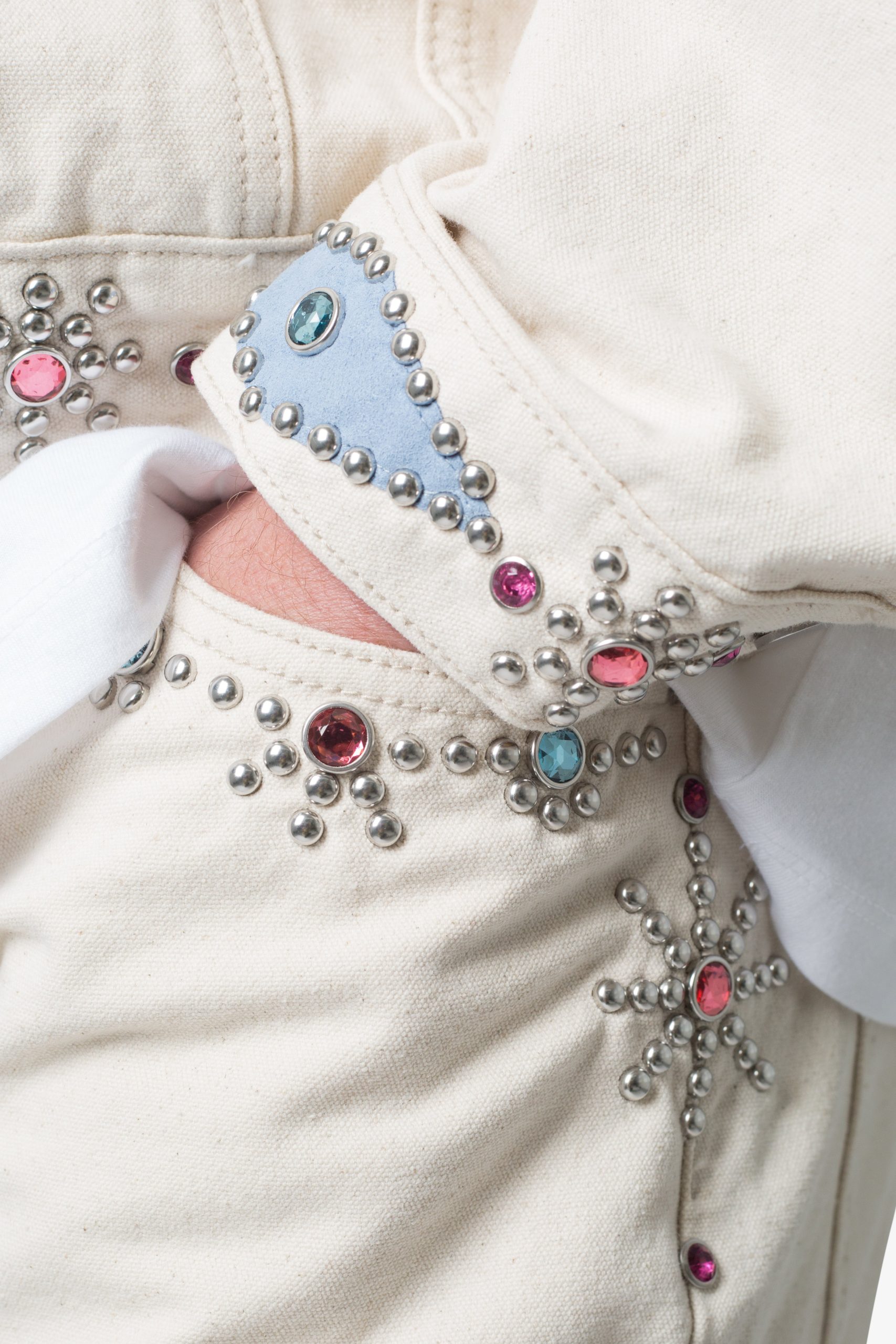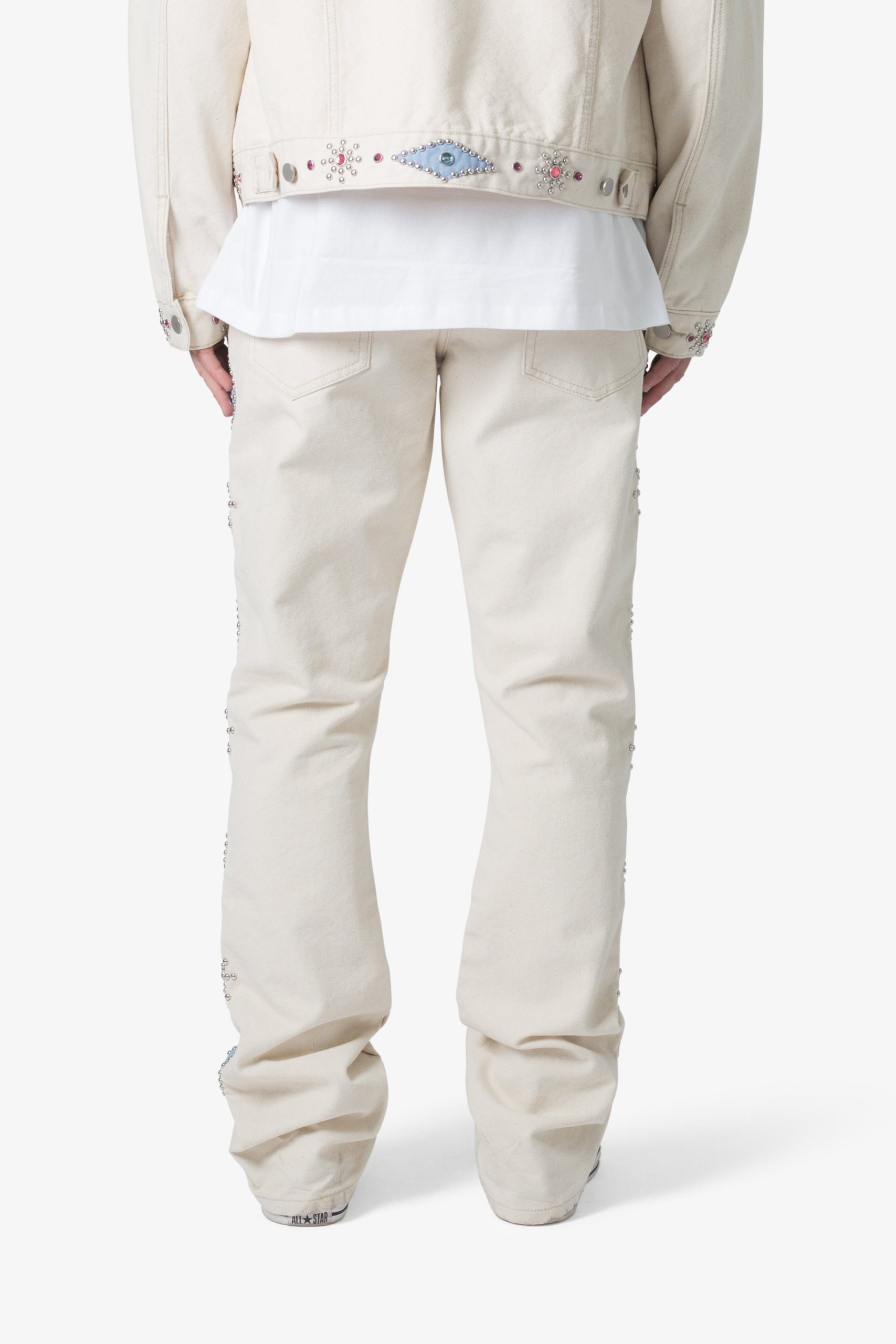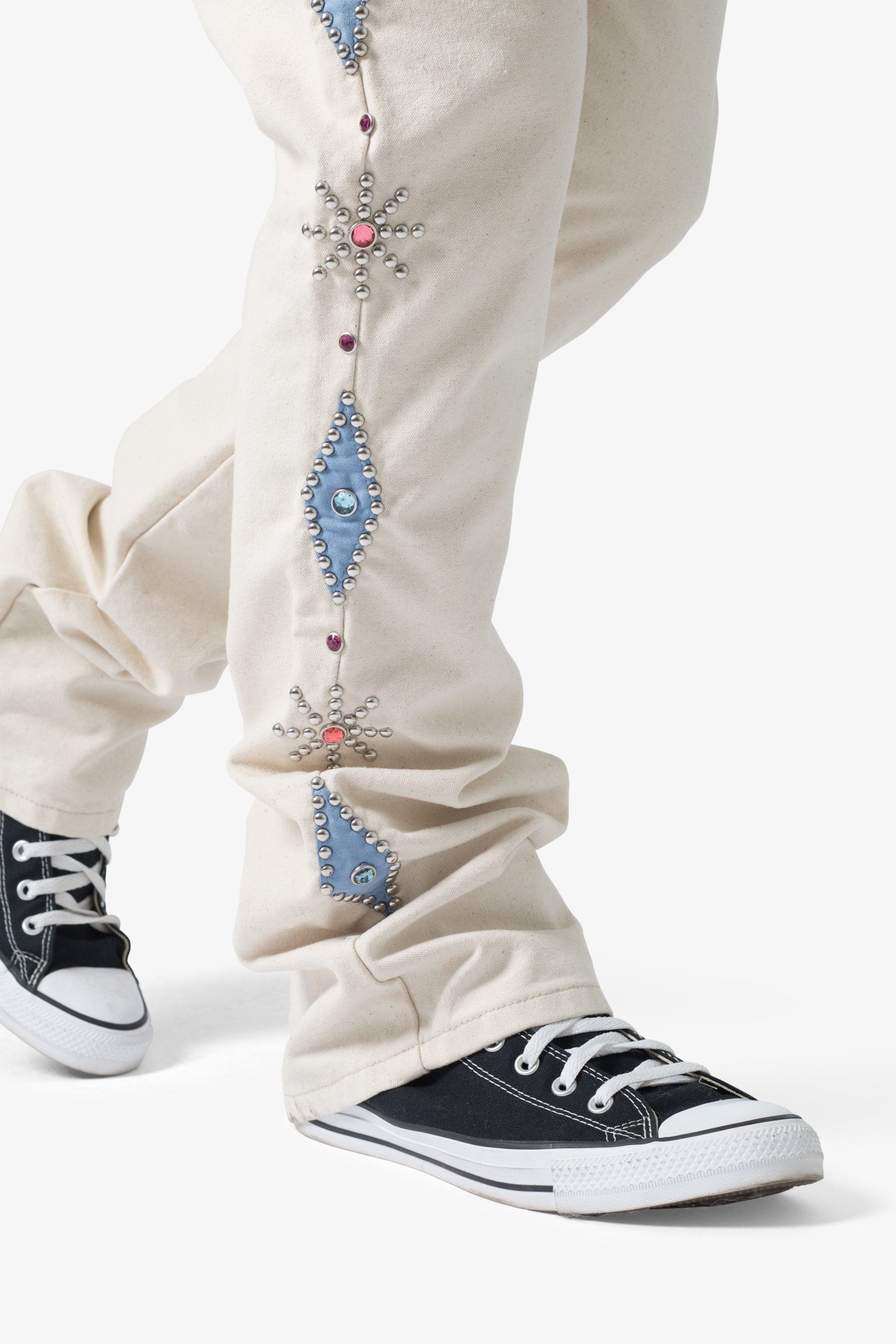 the B379 Studded Flare Denim are designed with our new B fit. which is relaxed through the thigh and features a slight flare at the leg opening and is constructed from a natural cotton colored denim. and finished with contrasting studding detail at the outseam and around the pockets.