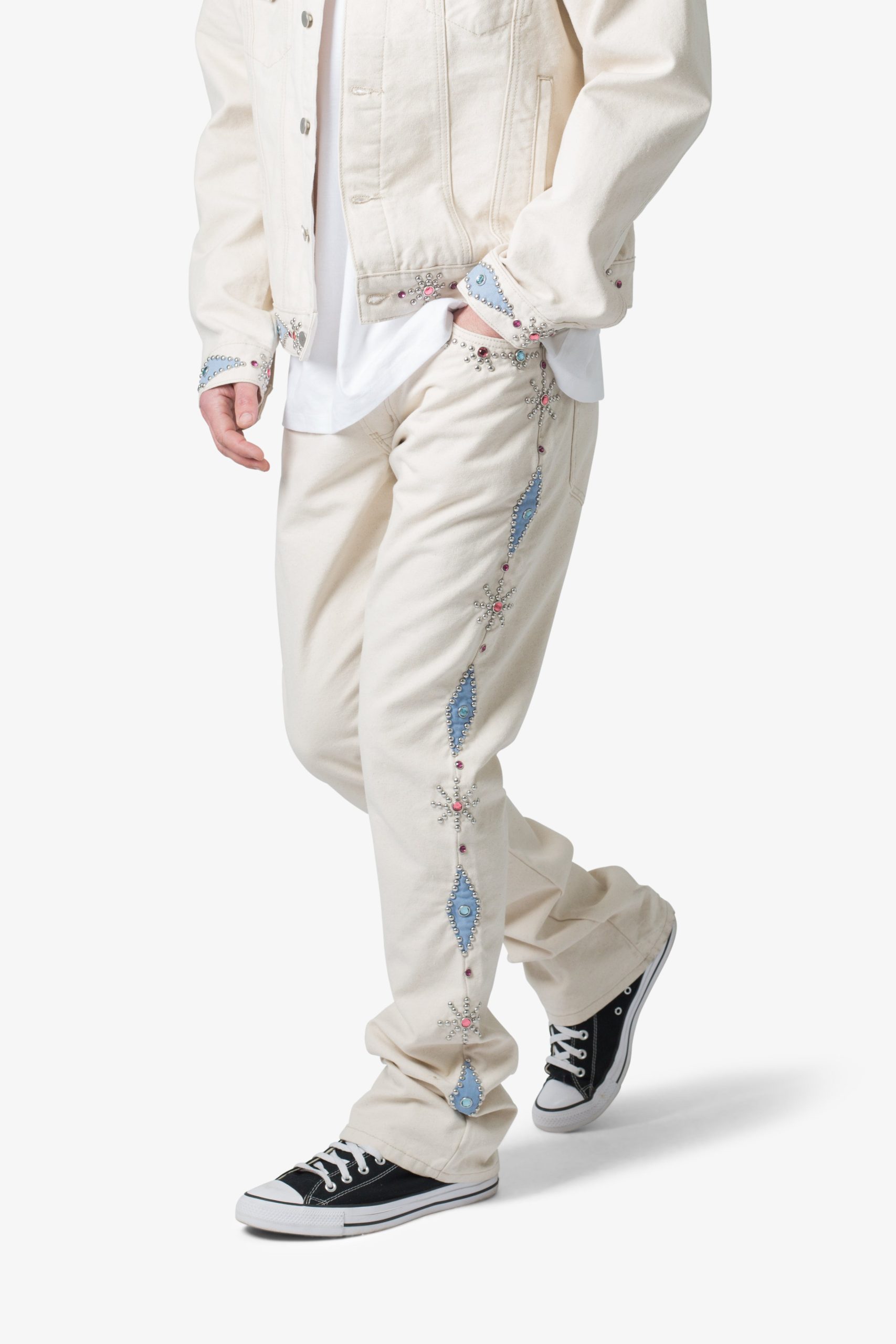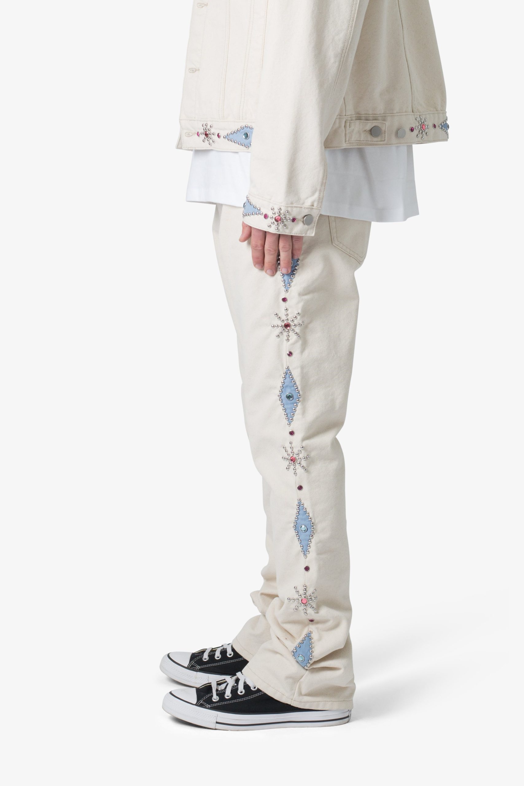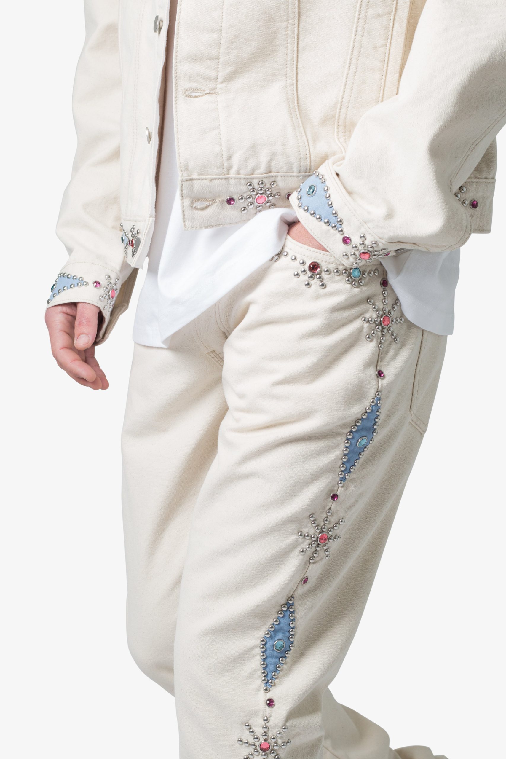 the B379 Studded Flare Denim are designed with our new B fit. which is relaxed through the thigh and features a slight flare at the leg opening and is constructed from a natural cotton colored denim. and finished with contrasting studding detail at the outseam and around the pockets.