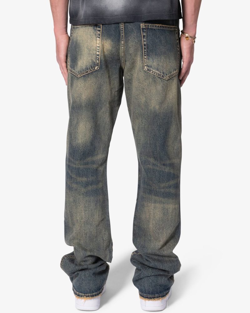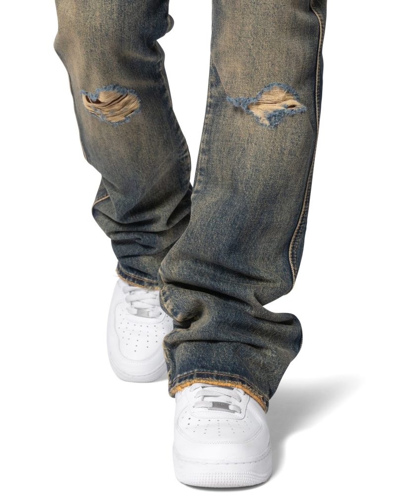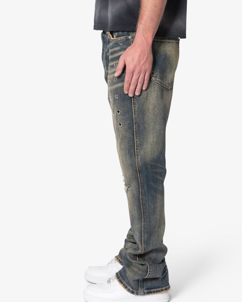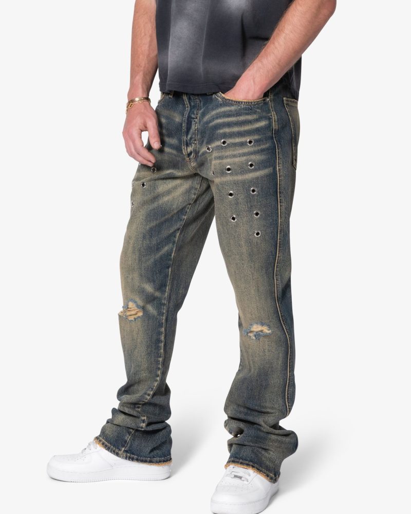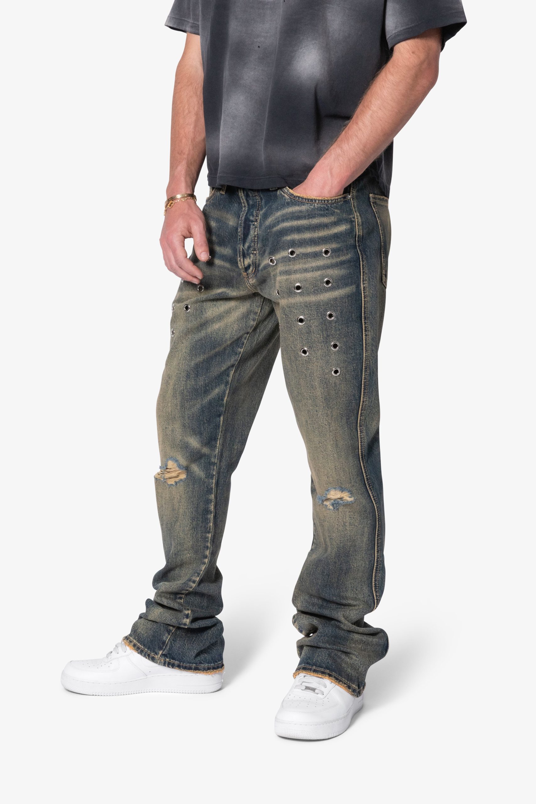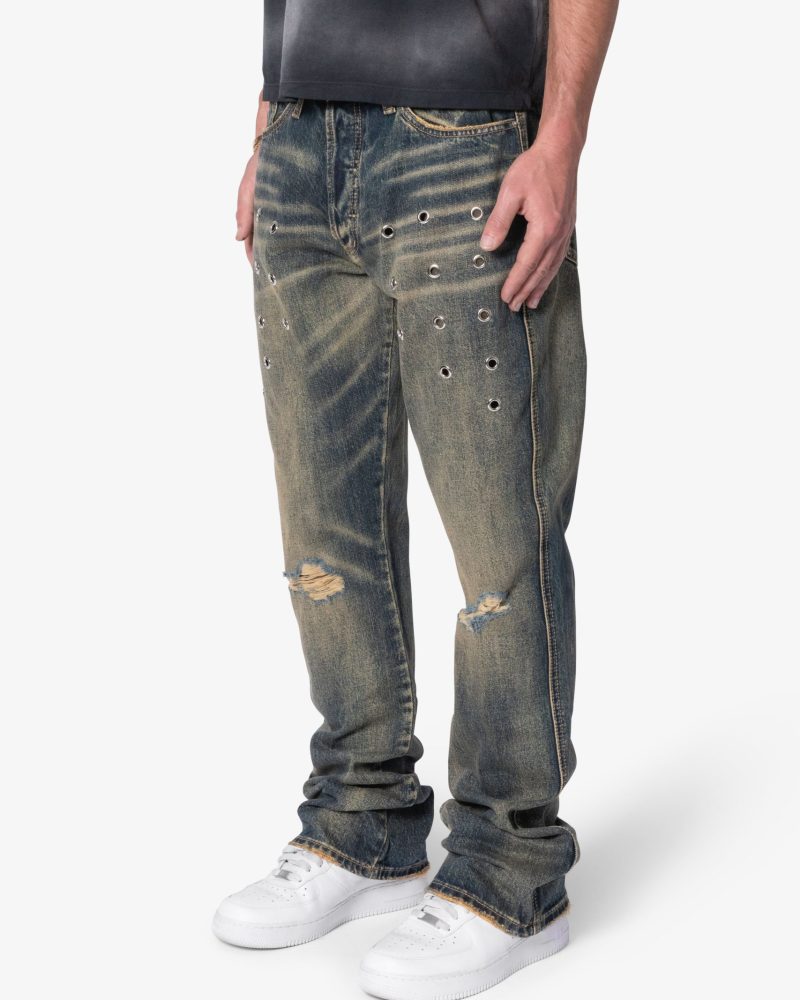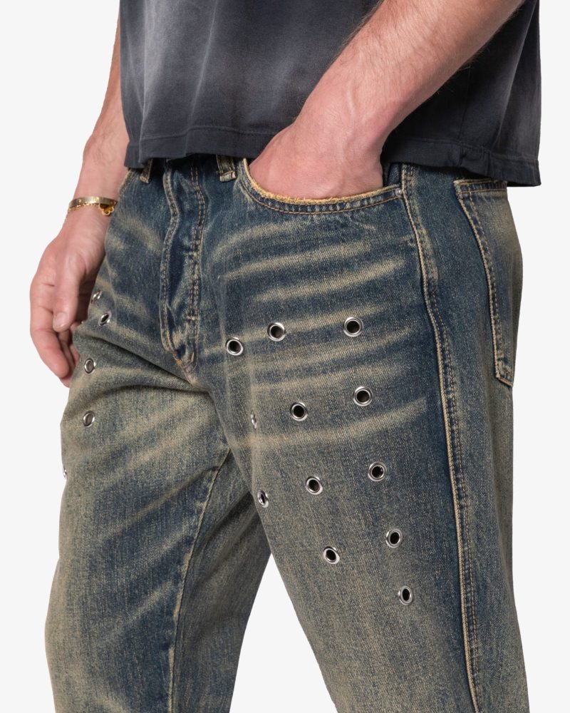 the B384 Metal Eyelet Flare Denim are designed in our B fit. which is relaxed through the thigh and features a slight flare at the leg opening and is constructed from vintage washed blue denim. distressing at the wearer’s knees. and finished with a grommet details at the hip.