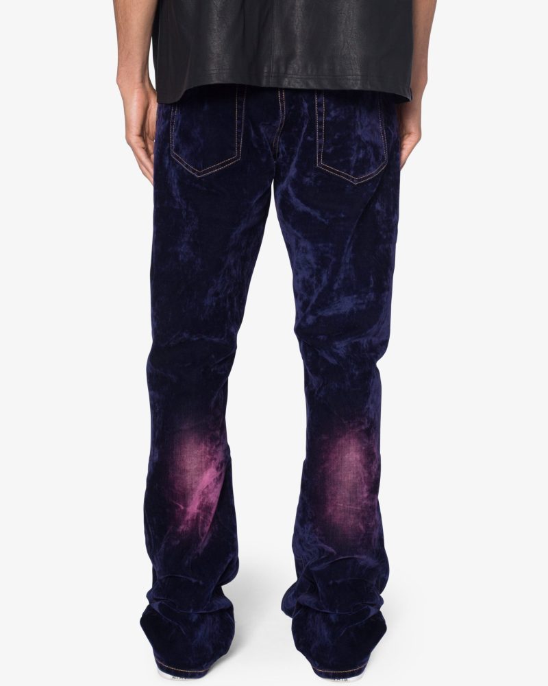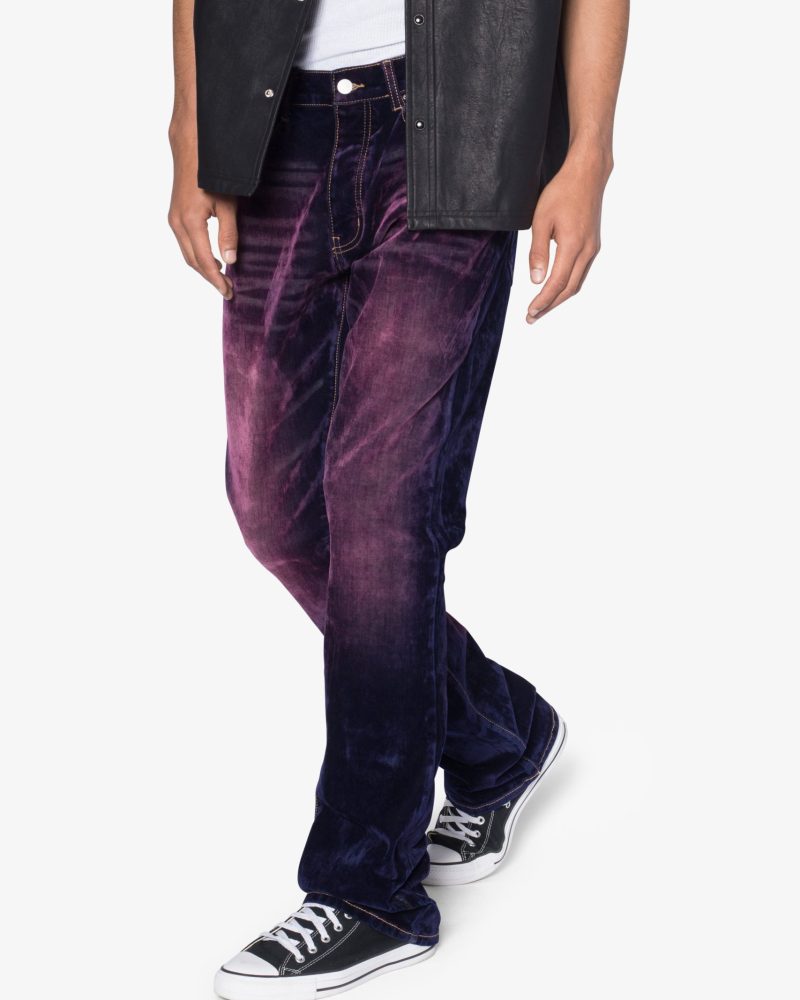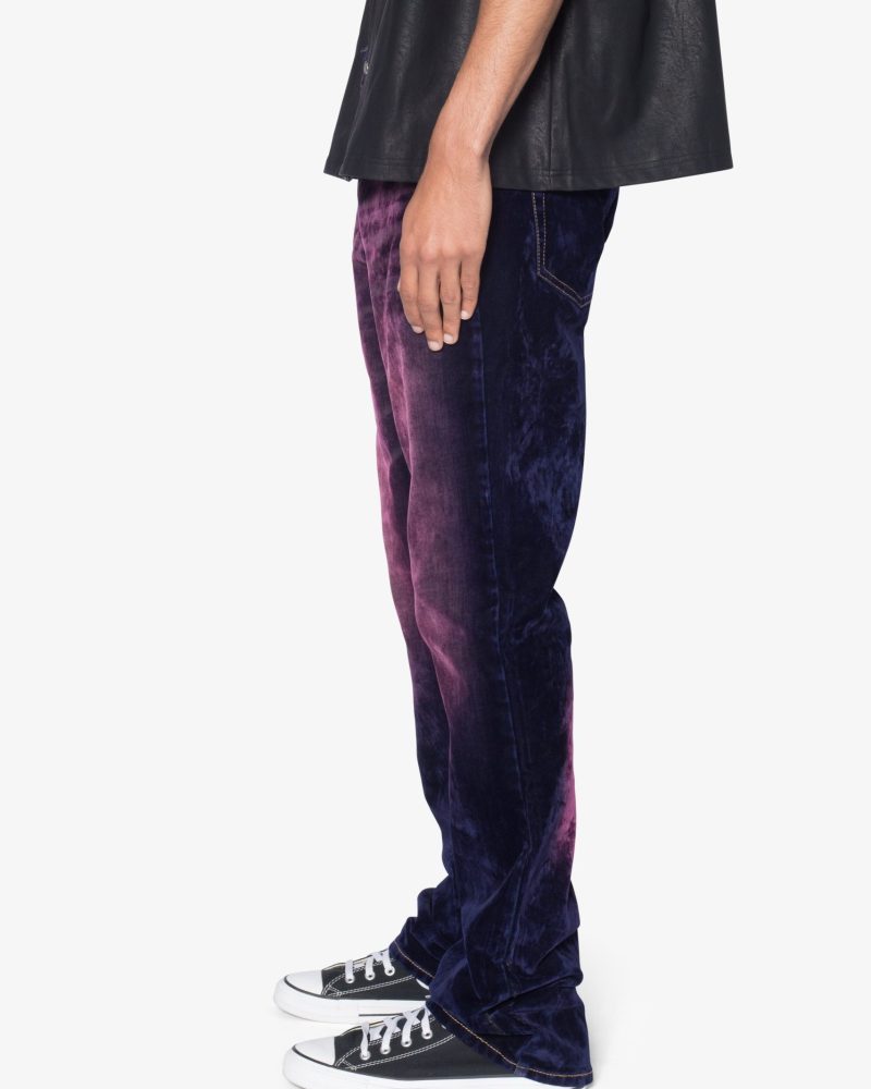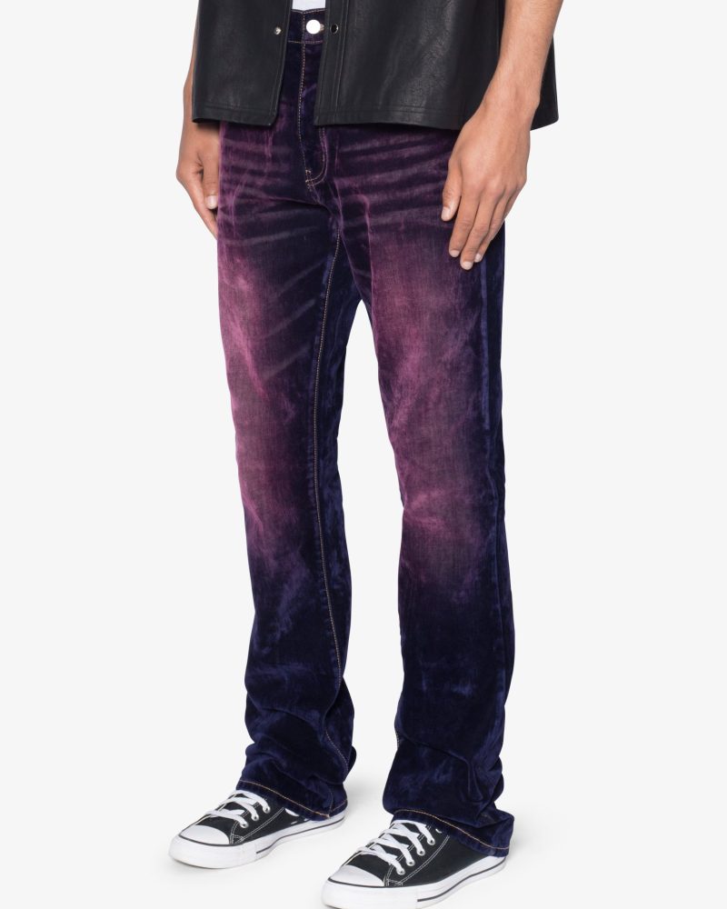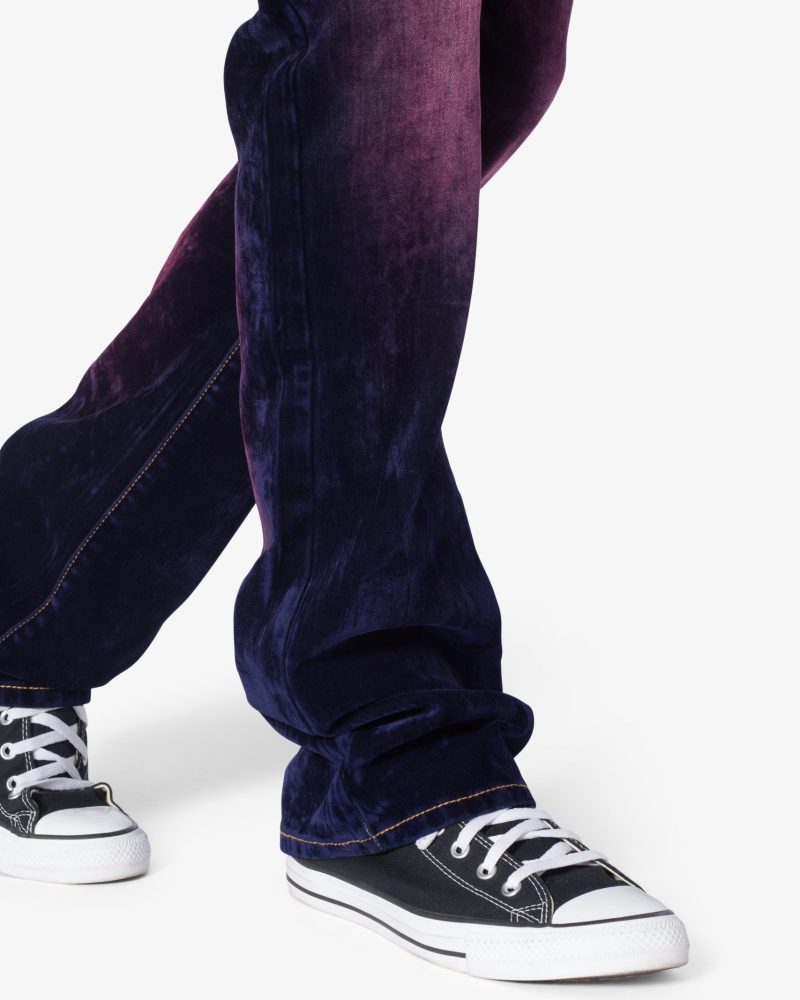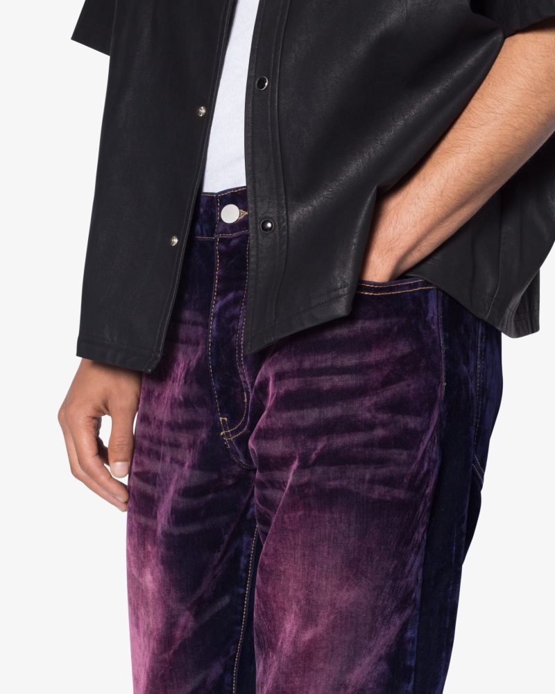 Introducing the B577 Suede Flare Denim. crafted from a cotton denim with a relaxed fit through the thigh and a distinct flare at the leg opening. The purple tinted denim base undergoes a sueding technique with a vintage wash and sanding. achieving a worn in appearance that’s both visually striking and pleasing to the touch. Embrace a blend of traditional western aesthetics and contemporary flair with these standout jeans.