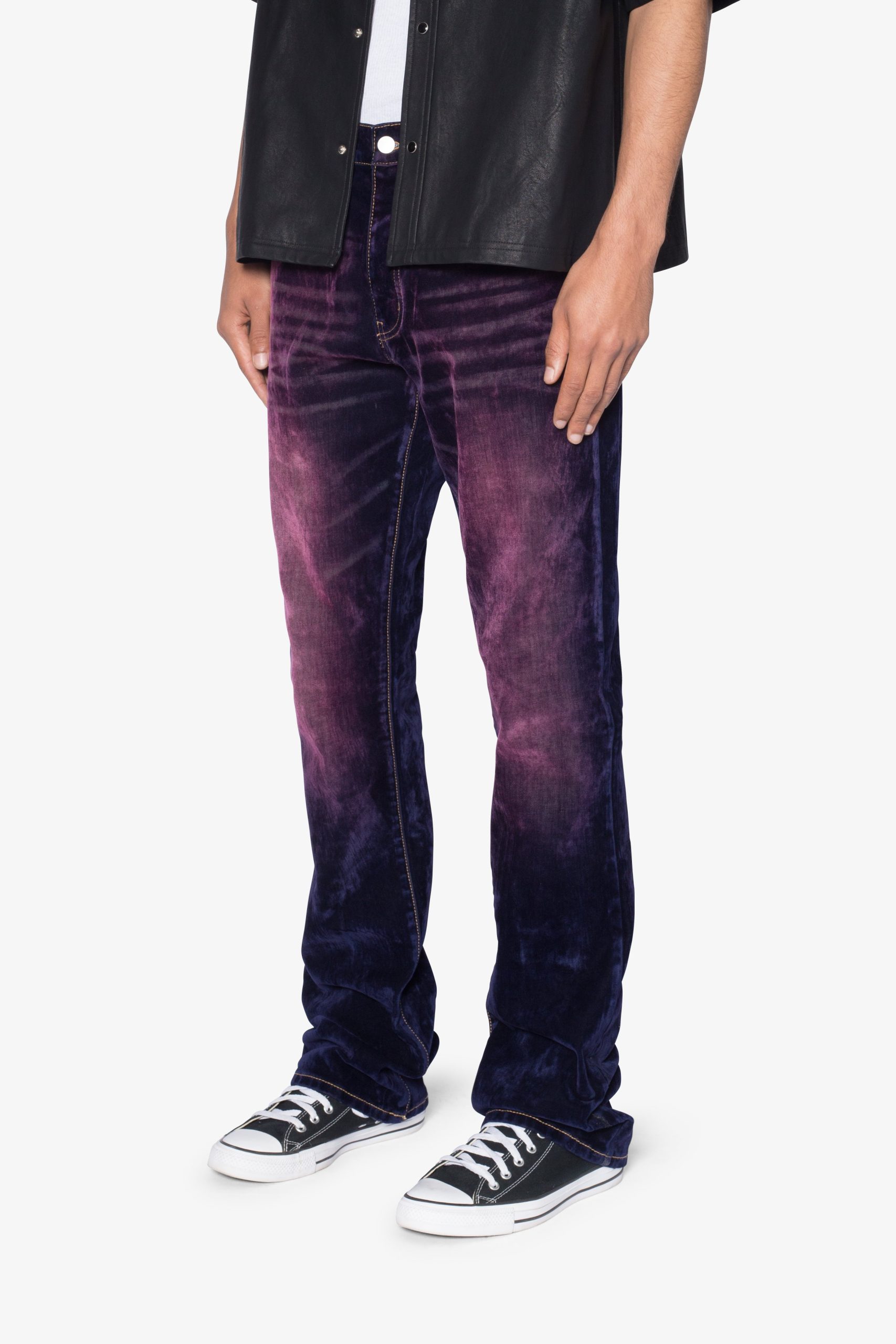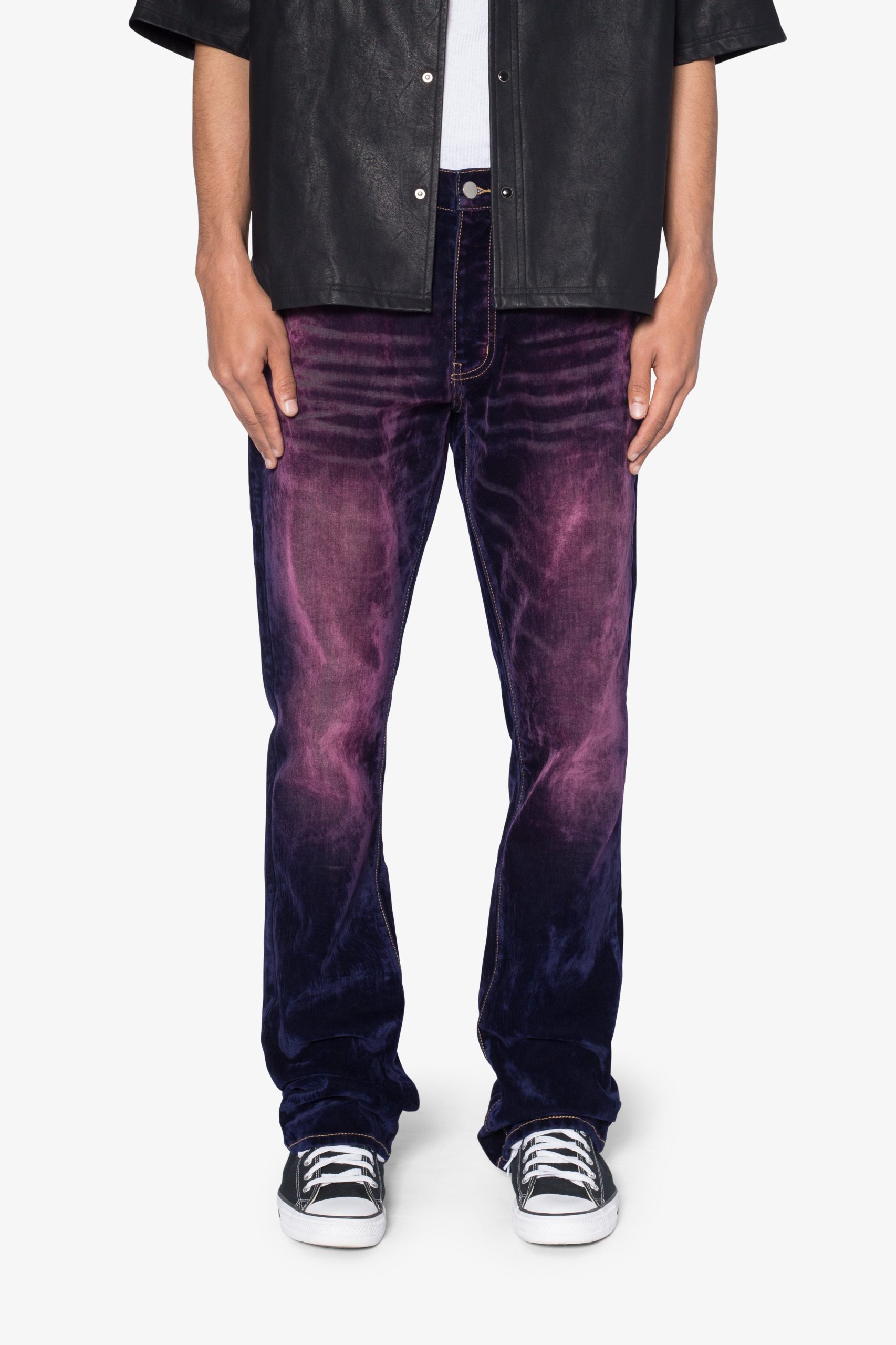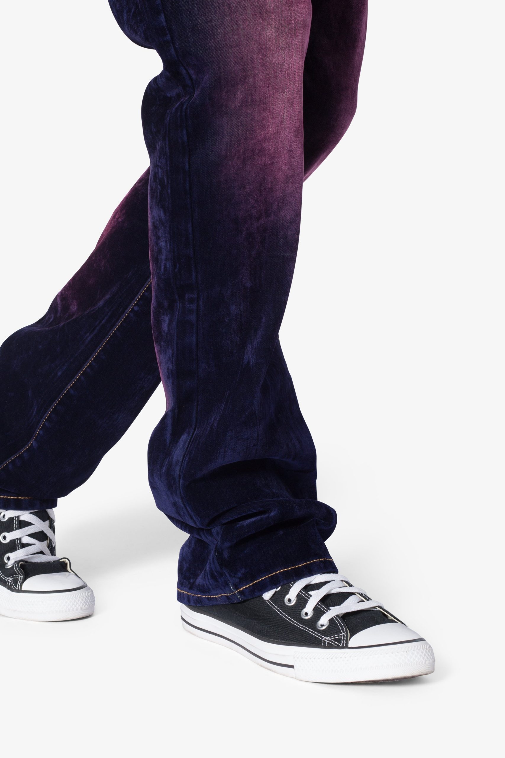 Introducing the B577 Suede Flare Denim. crafted from a cotton denim with a relaxed fit through the thigh and a distinct flare at the leg opening. The purple tinted denim base undergoes a sueding technique with a vintage wash and sanding. achieving a worn in appearance that’s both visually striking and pleasing to the touch. Embrace a blend of traditional western aesthetics and contemporary flair with these standout jeans.