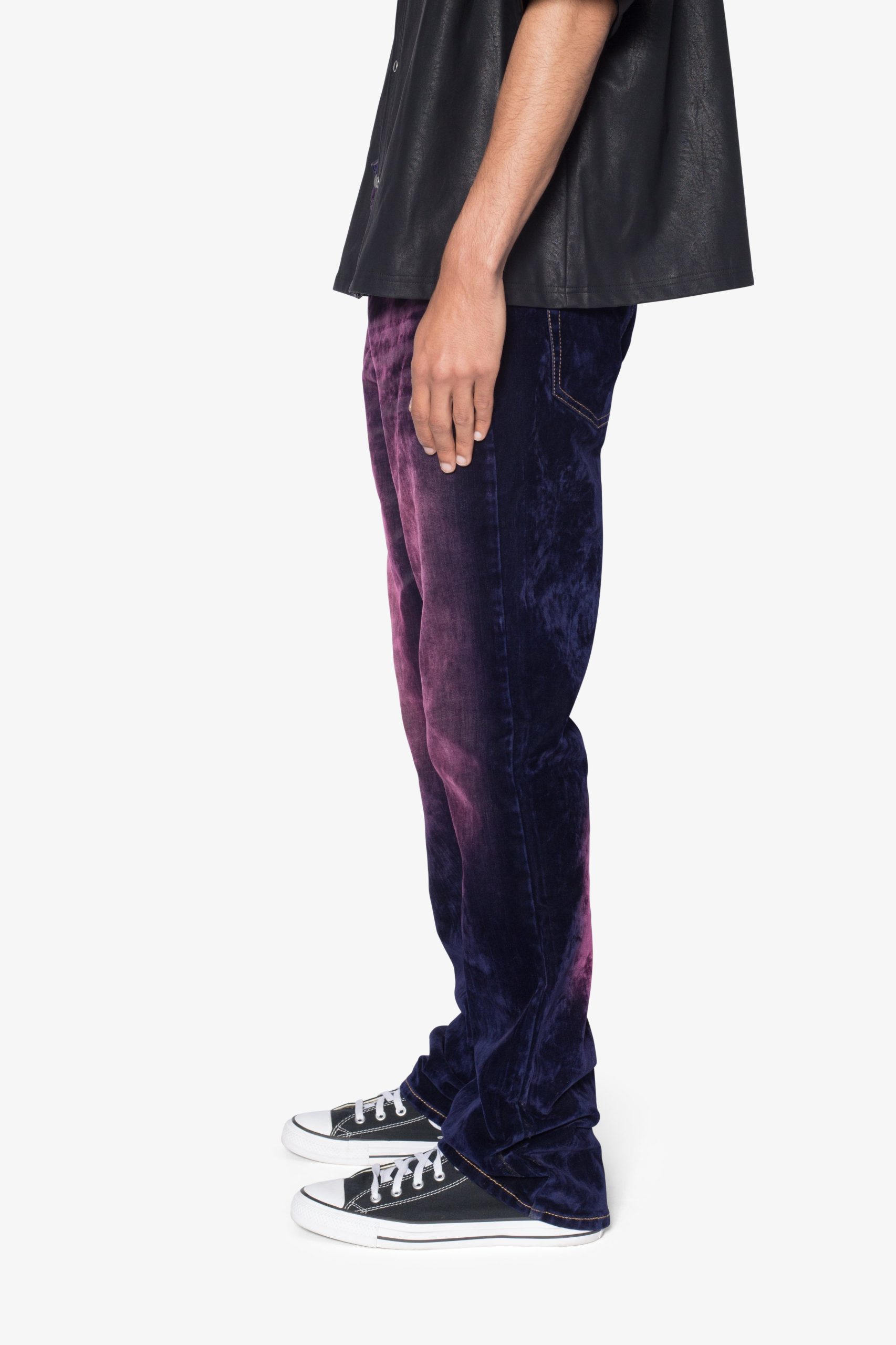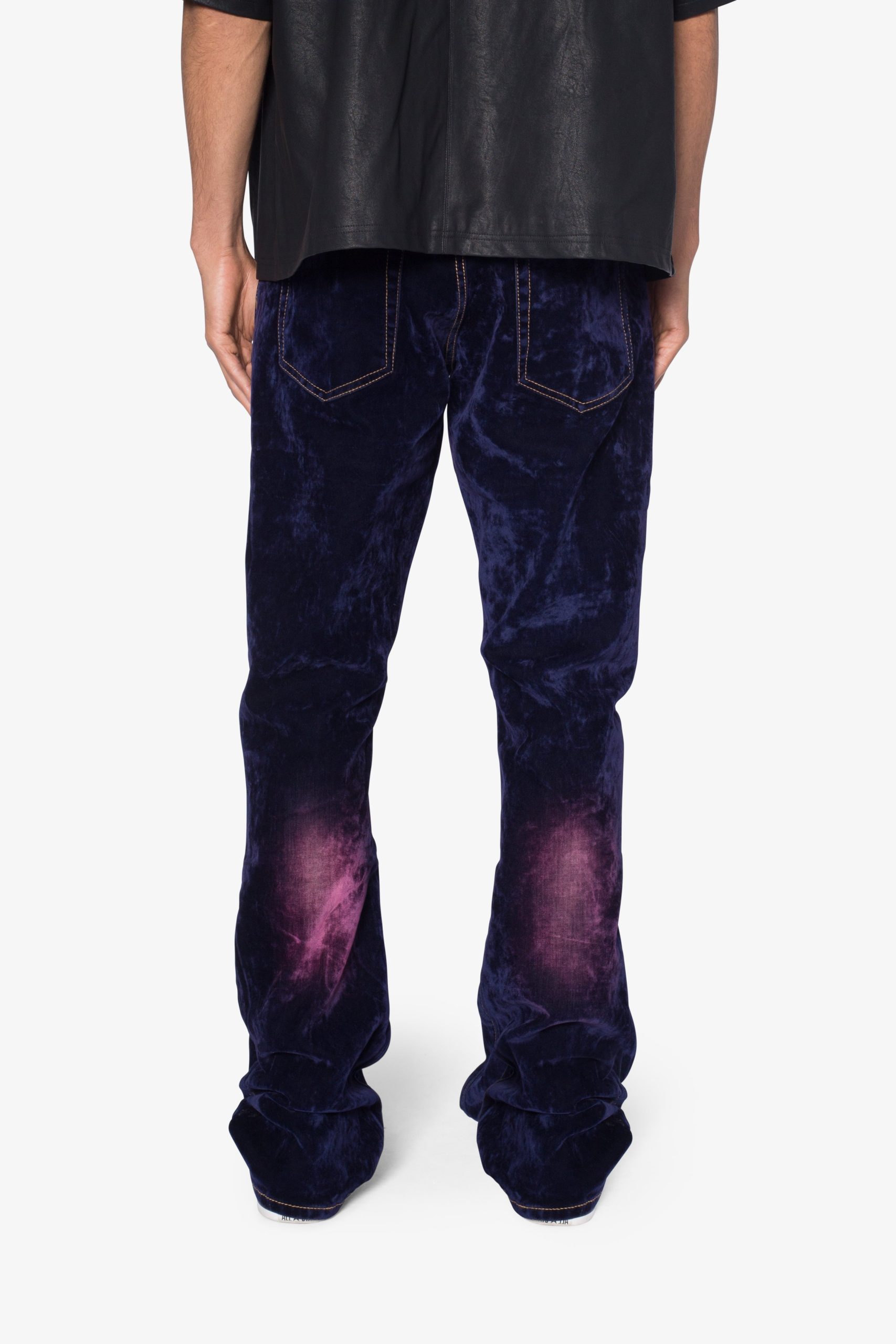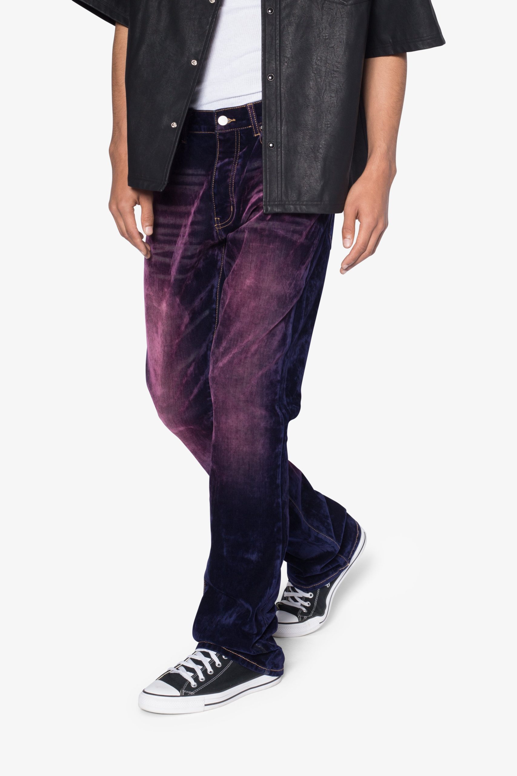 Introducing the B577 Suede Flare Denim. crafted from a cotton denim with a relaxed fit through the thigh and a distinct flare at the leg opening. The purple tinted denim base undergoes a sueding technique with a vintage wash and sanding. achieving a worn in appearance that’s both visually striking and pleasing to the touch. Embrace a blend of traditional western aesthetics and contemporary flair with these standout jeans.