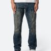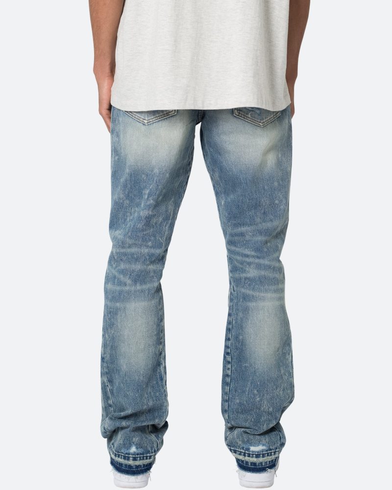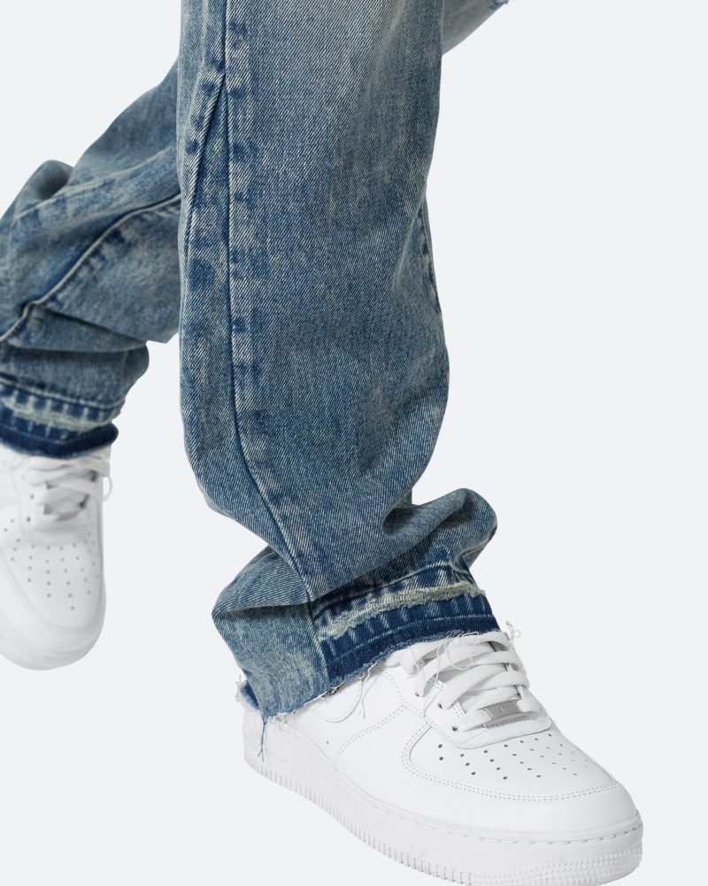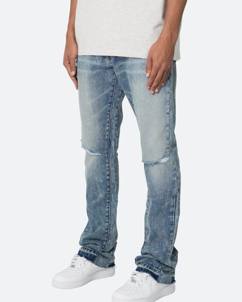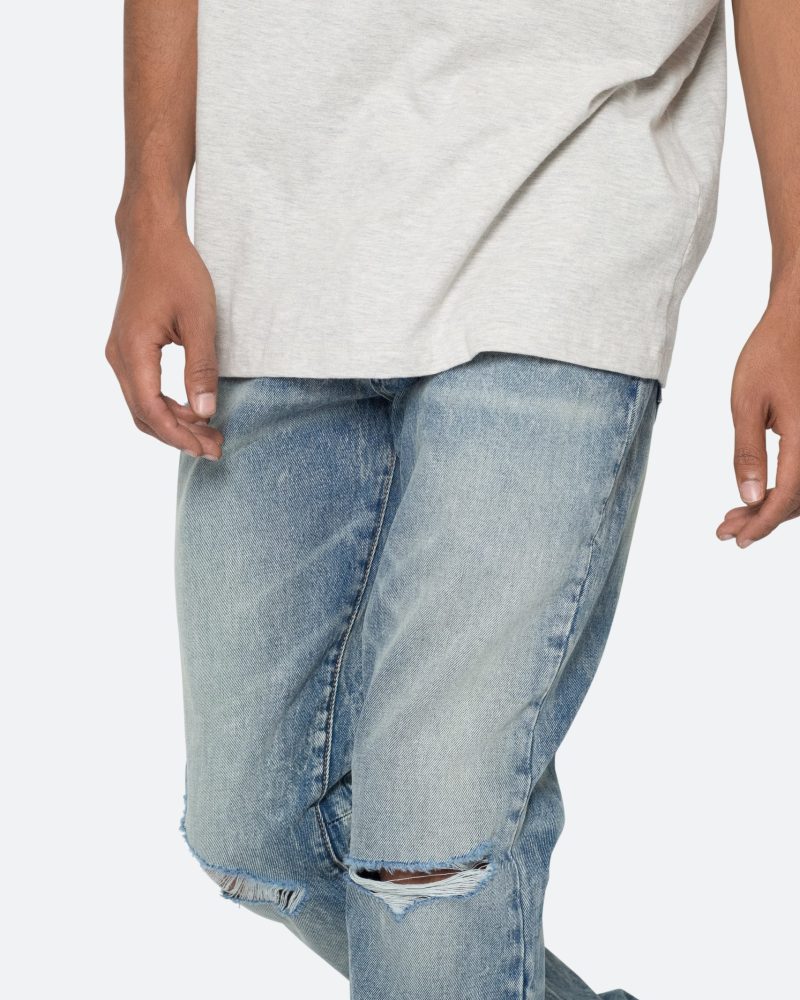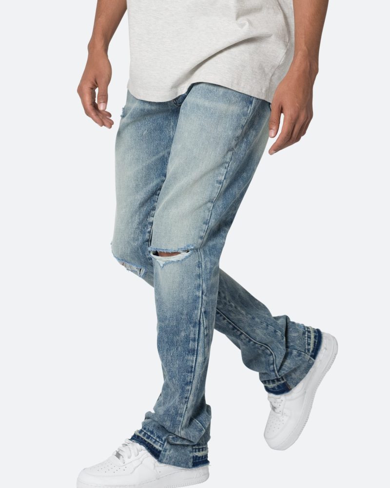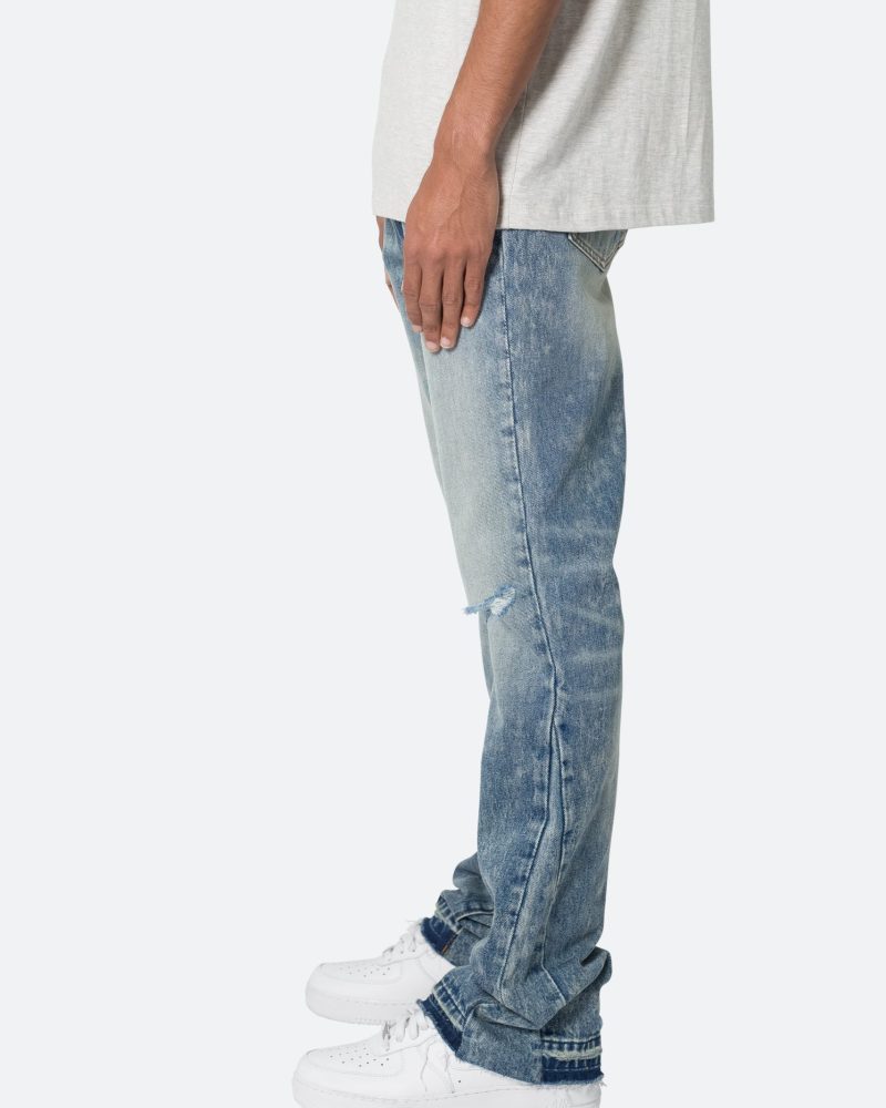 the B615 Knee Hole Flare Denim are designed with our new B fit. which is slim through the thigh and features a slight flare at the leg opening and is constructed from light washed blue denim. panelling at the inseam and outseam from self denim for a slight flare. distressing at the wearer’s knees. and finished with a deconstructed hem.