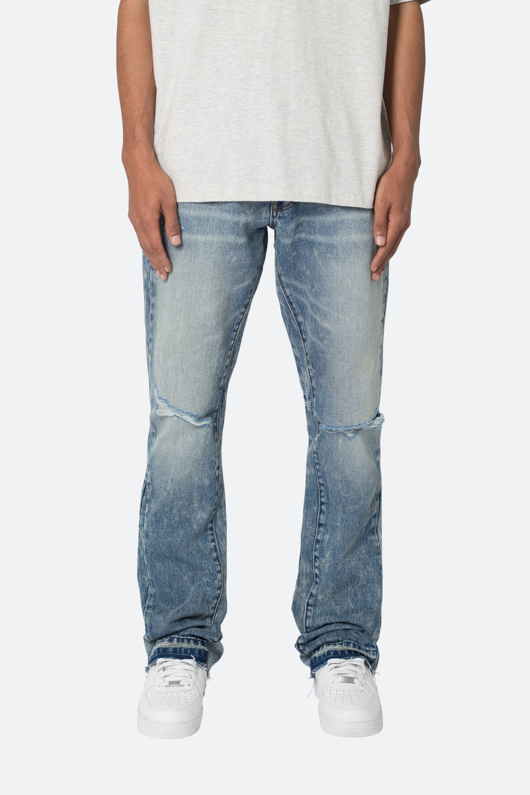 the B615 Knee Hole Flare Denim are designed with our new B fit. which is slim through the thigh and features a slight flare at the leg opening and is constructed from light washed blue denim. panelling at the inseam and outseam from self denim for a slight flare. distressing at the wearer’s knees. and finished with a deconstructed hem.
