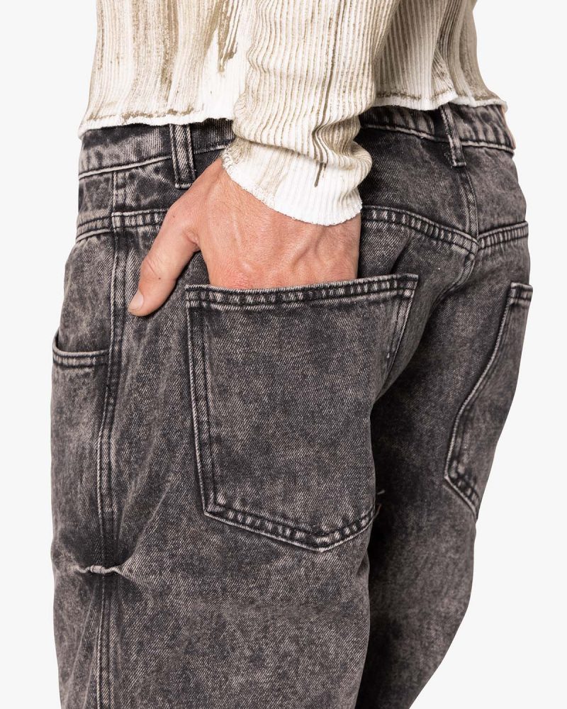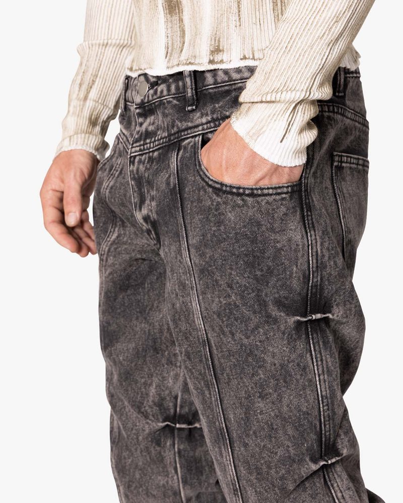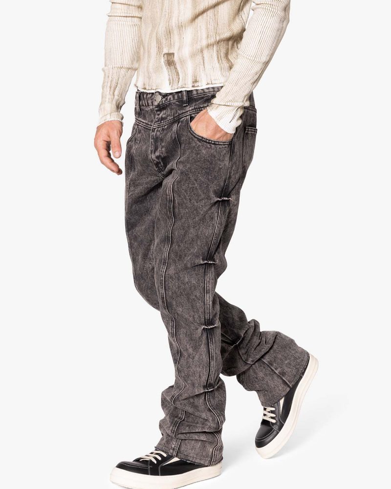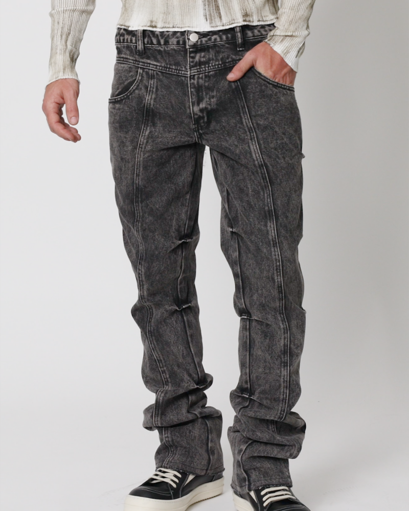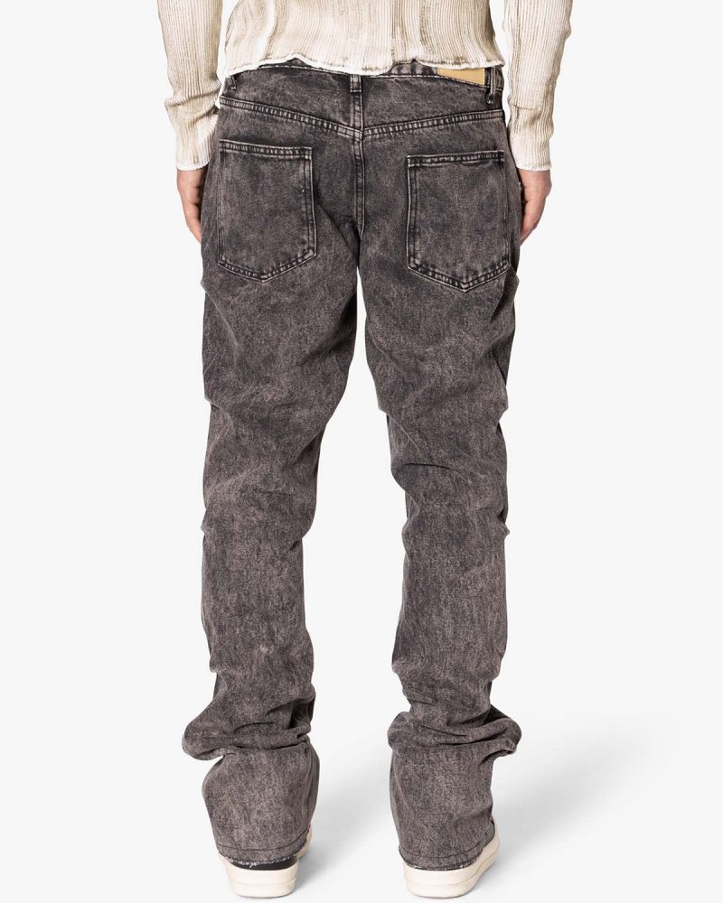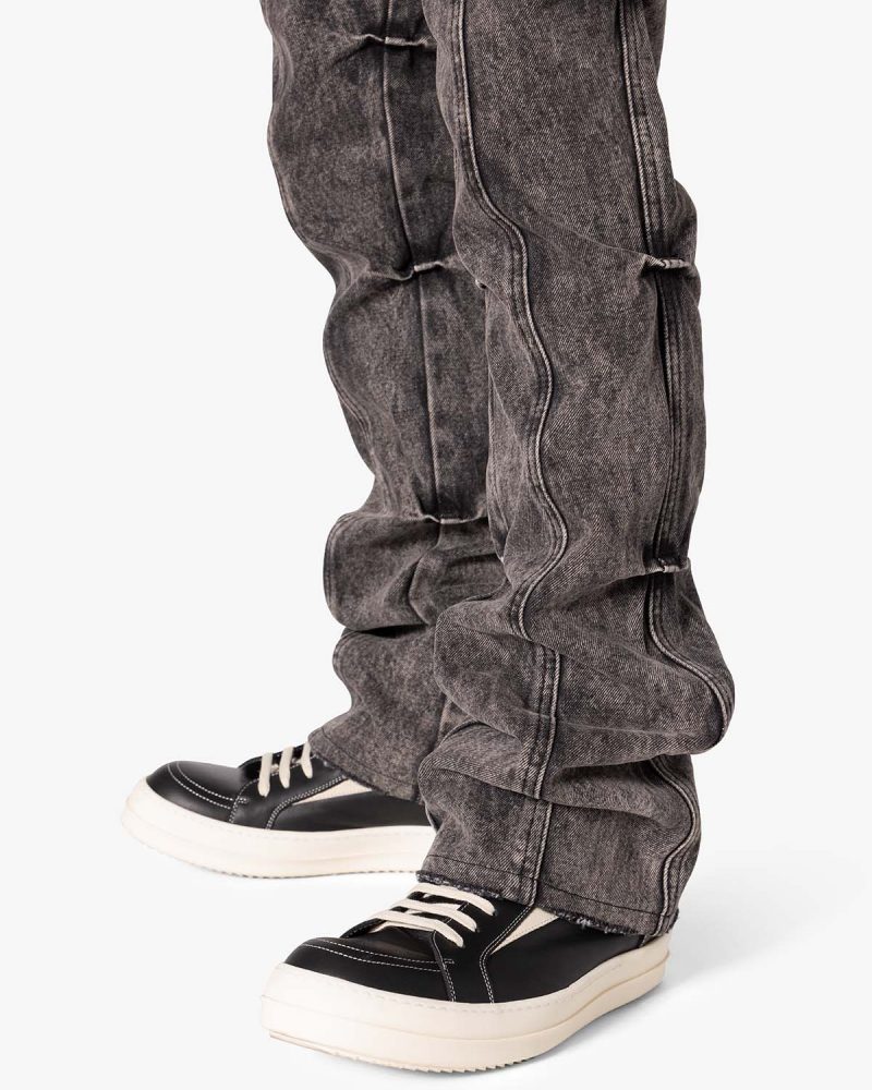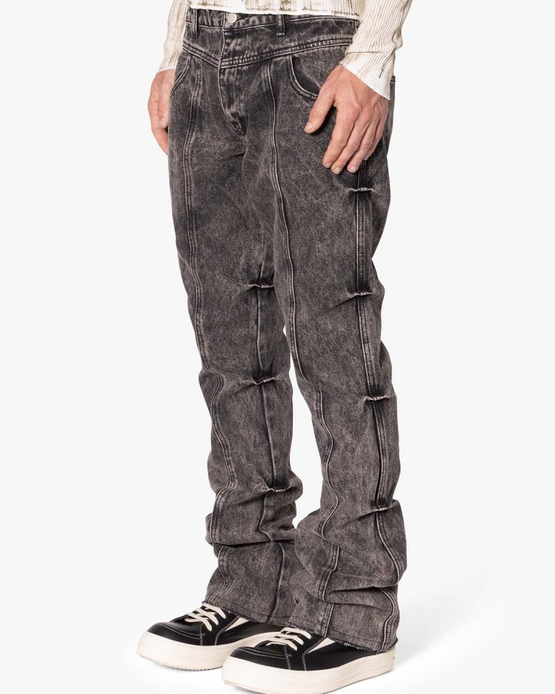the B648 Side Pinned Flare Denim is designed with our new B fit. which is slim through the thigh and features a slight flare at the leg opening. It is constructed from 100% cotton. vintage charcoal washed denim. and finished with technical pinning along the inseam and out-seam to reveal a ripple effect.