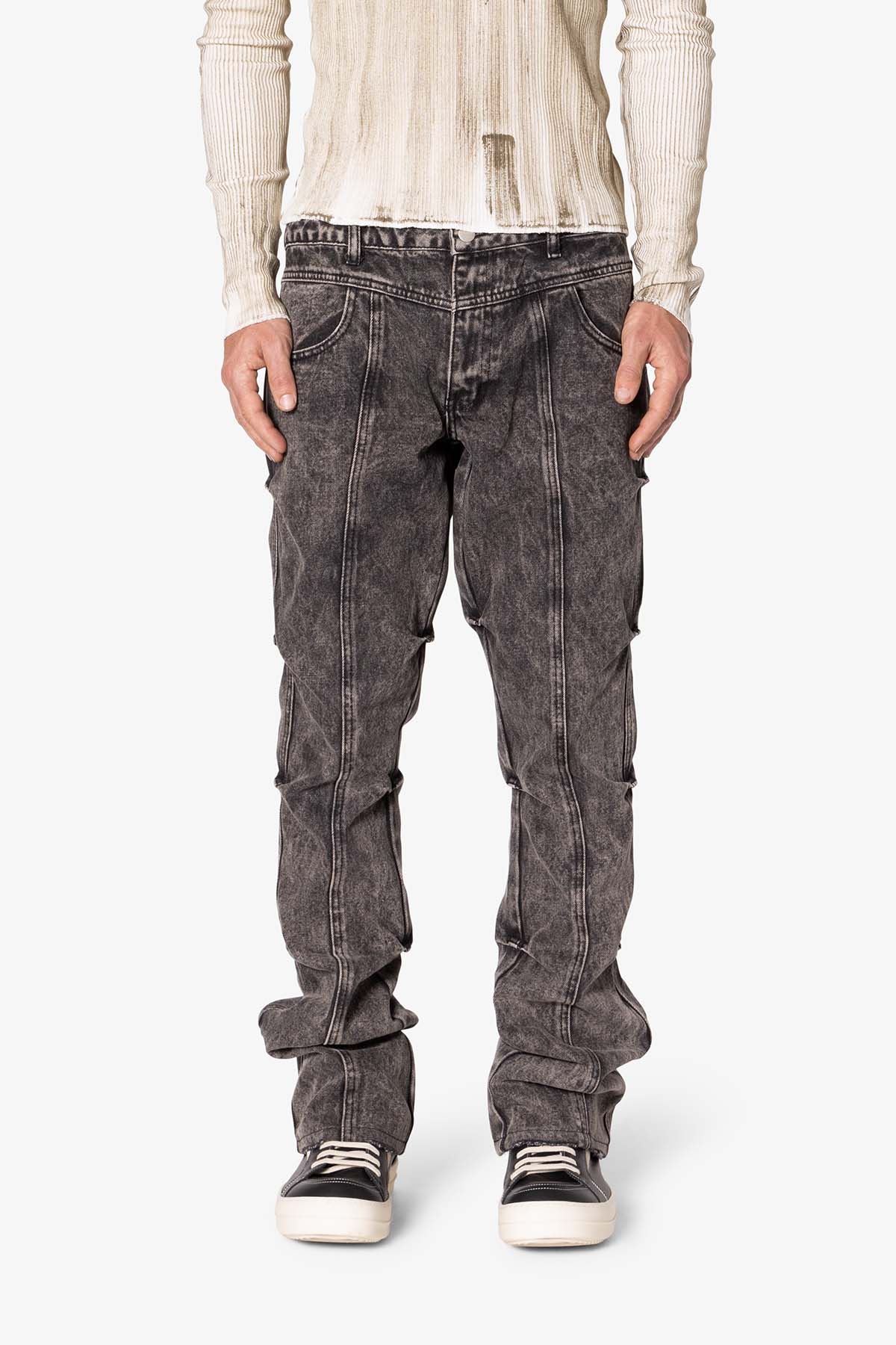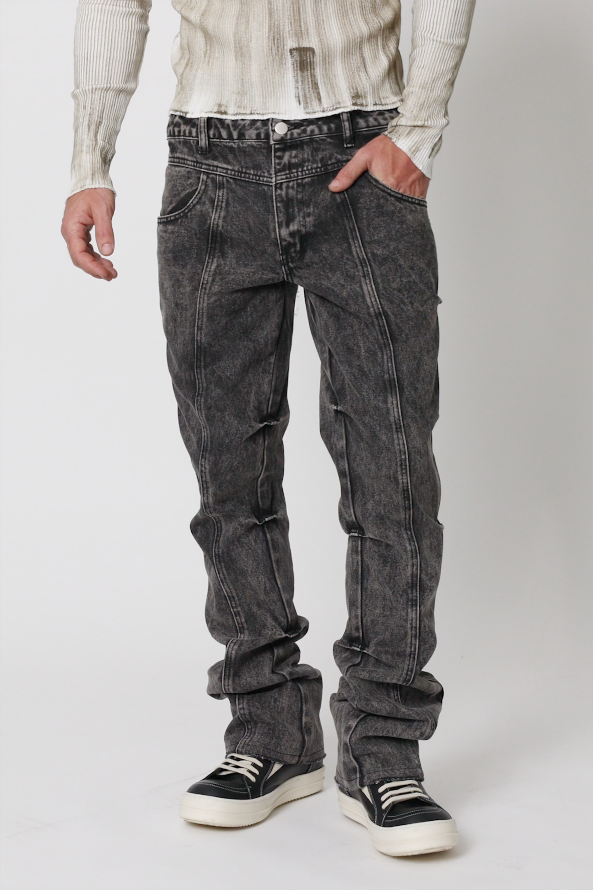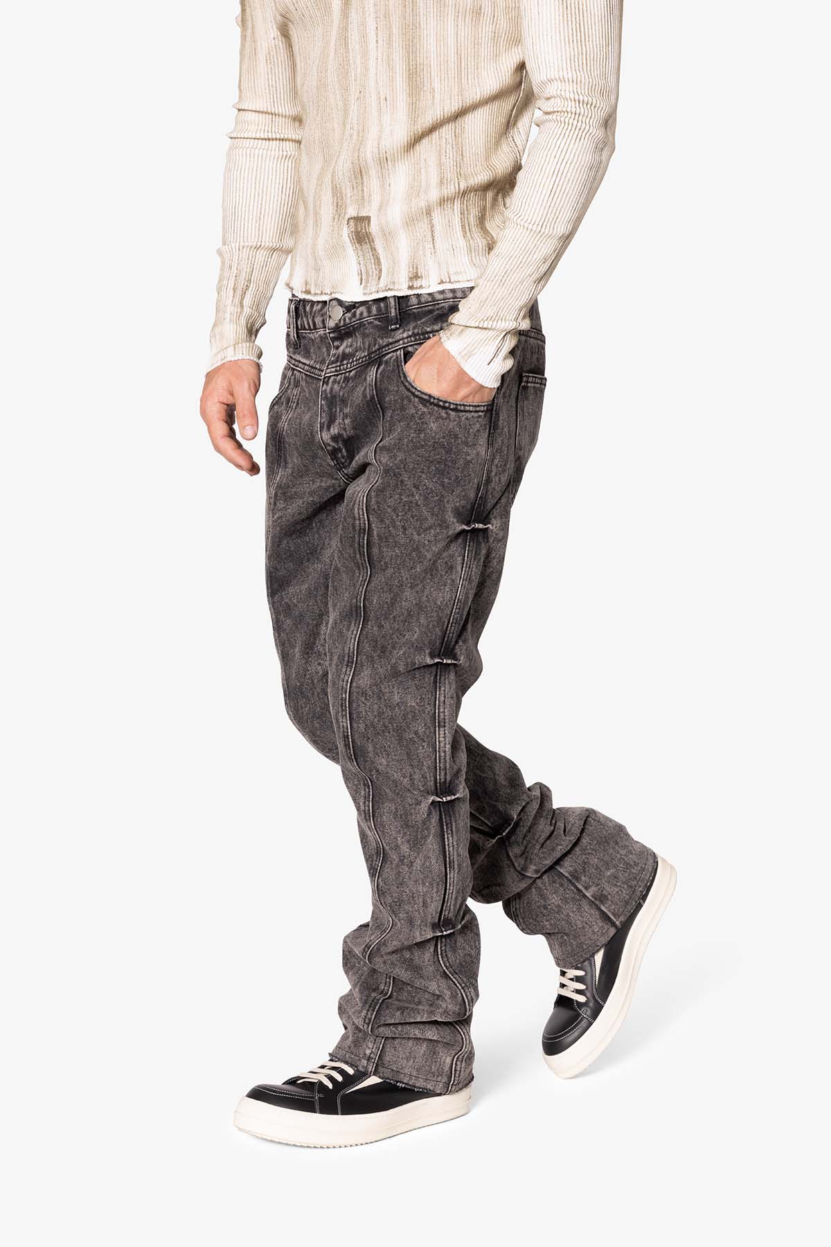 the B648 Side Pinned Flare Denim is designed with our new B fit. which is slim through the thigh and features a slight flare at the leg opening. It is constructed from 100% cotton. vintage charcoal washed denim. and finished with technical pinning along the inseam and out-seam to reveal a ripple effect.