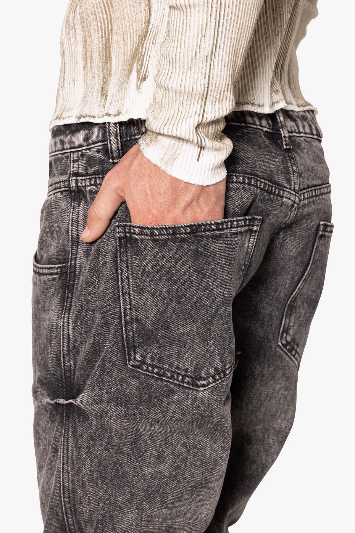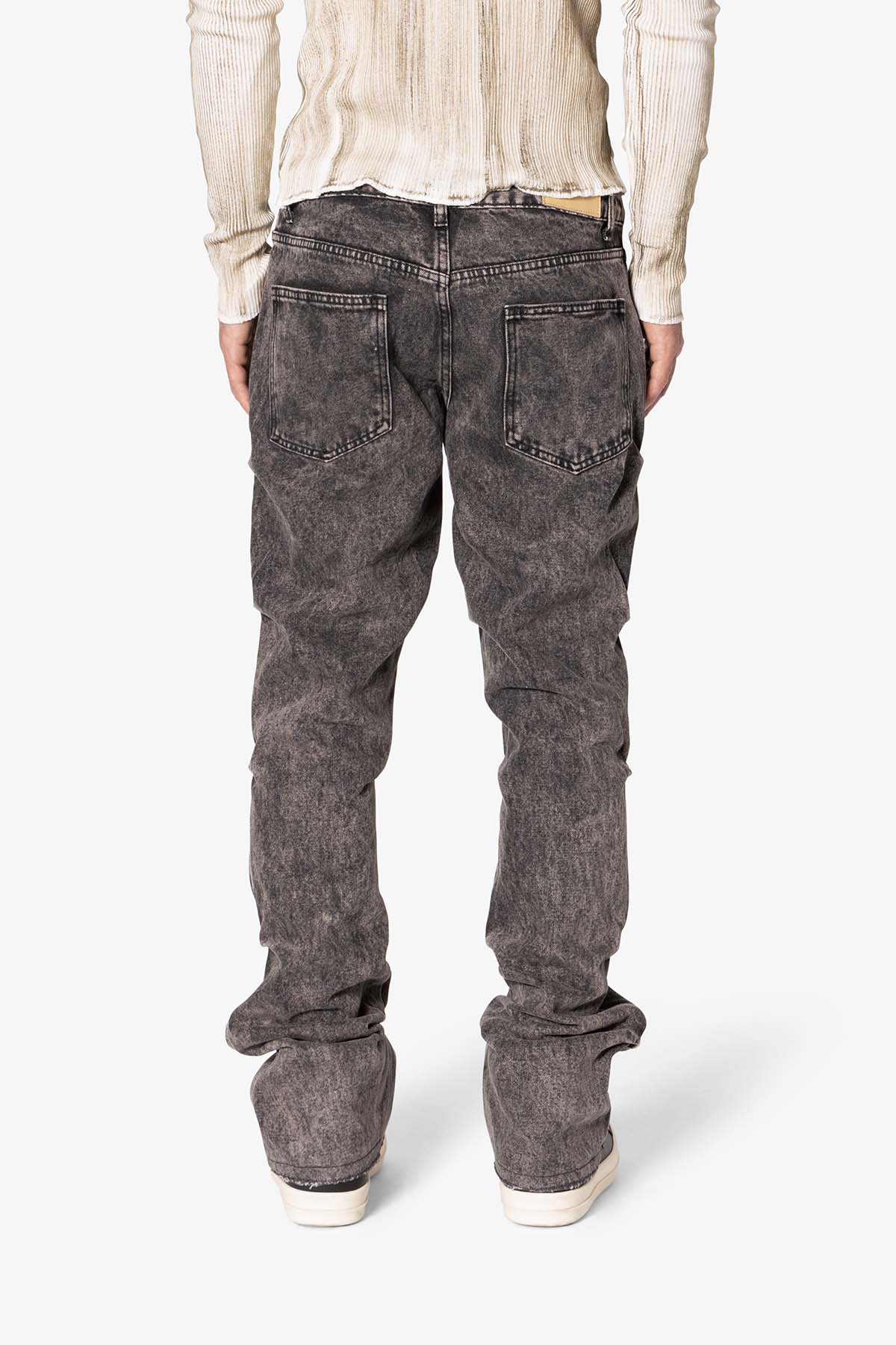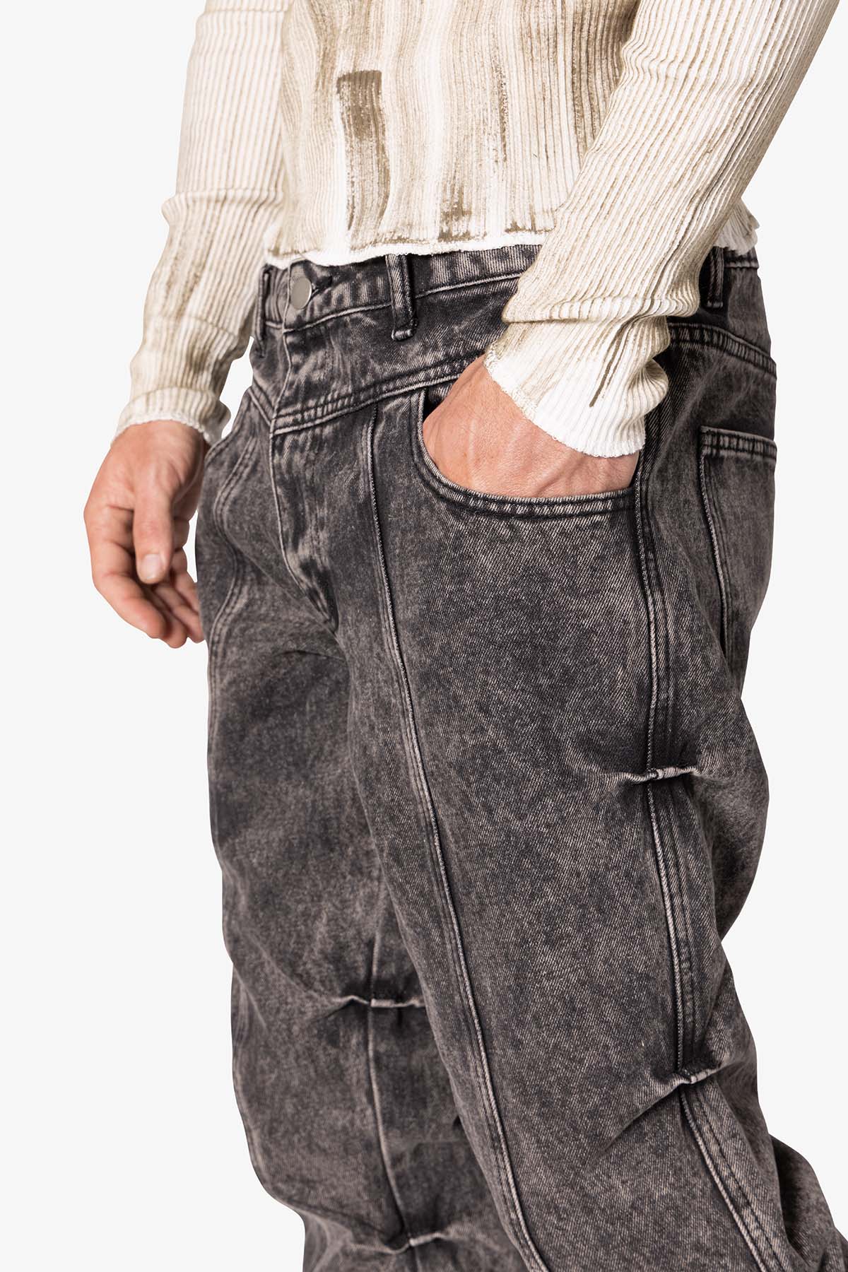 the B648 Side Pinned Flare Denim is designed with our new B fit. which is slim through the thigh and features a slight flare at the leg opening. It is constructed from 100% cotton. vintage charcoal washed denim. and finished with technical pinning along the inseam and out-seam to reveal a ripple effect.