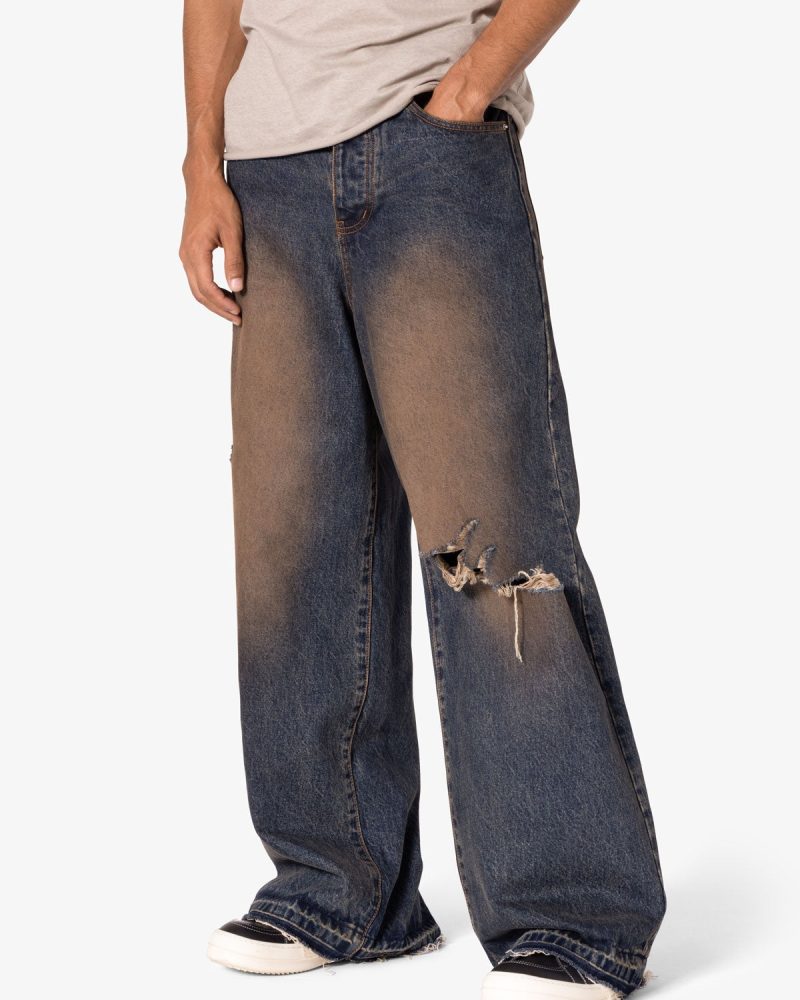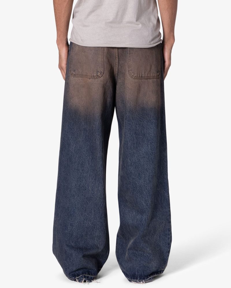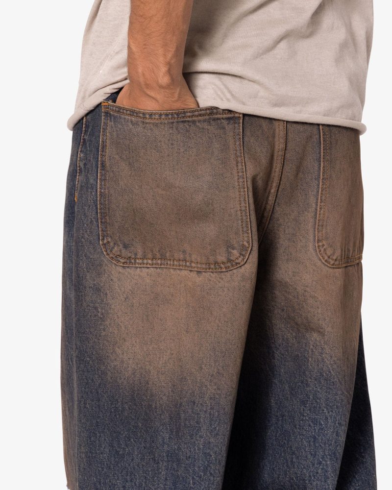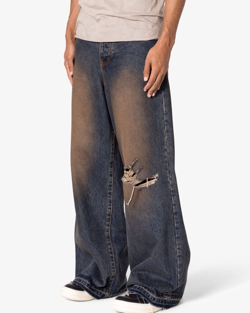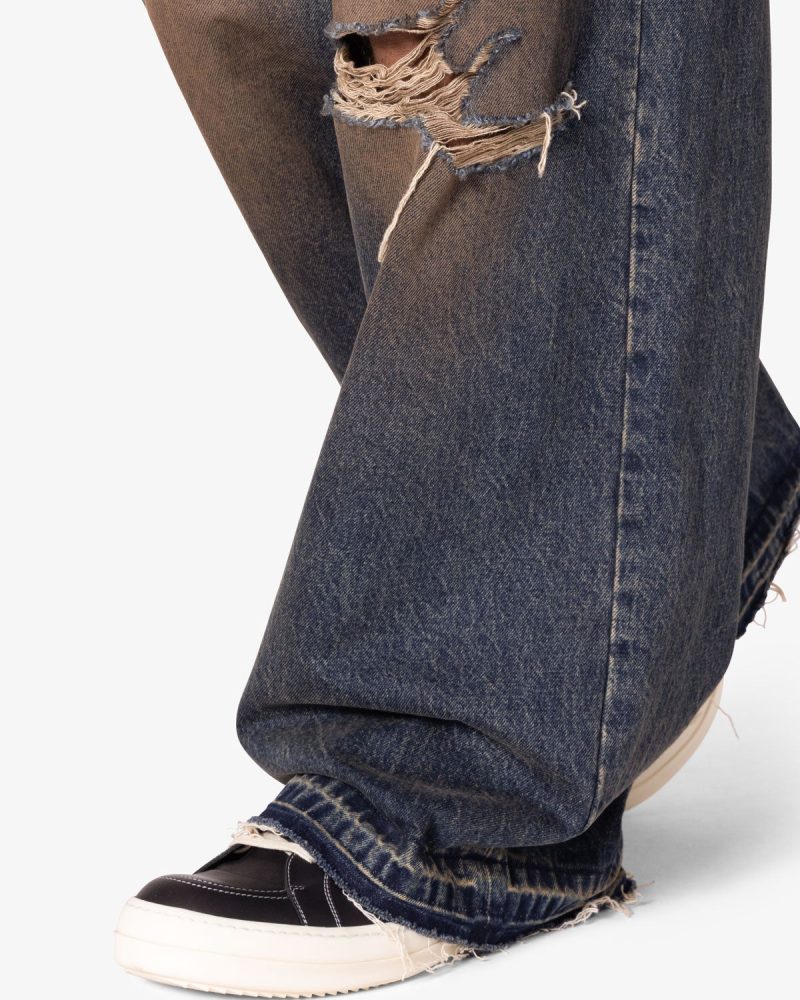 the Baggy Rave Denim are designed with a new oversized rave fit. constructed from a washed denim. distressing throughout. and finished with a deconstructed hem.