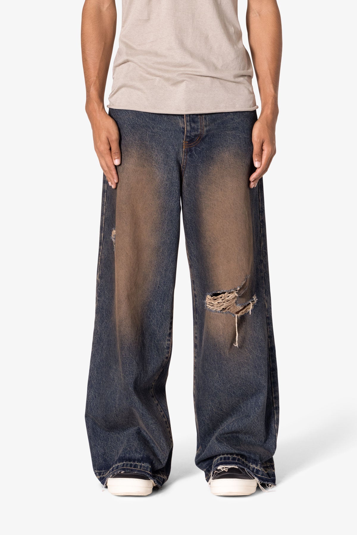 the Baggy Rave Denim are designed with a new oversized rave fit. constructed from a washed denim. distressing throughout. and finished with a deconstructed hem.