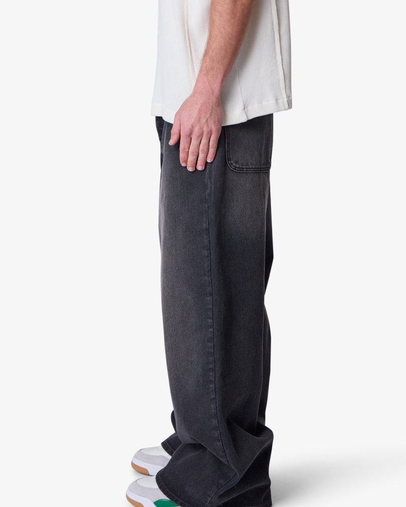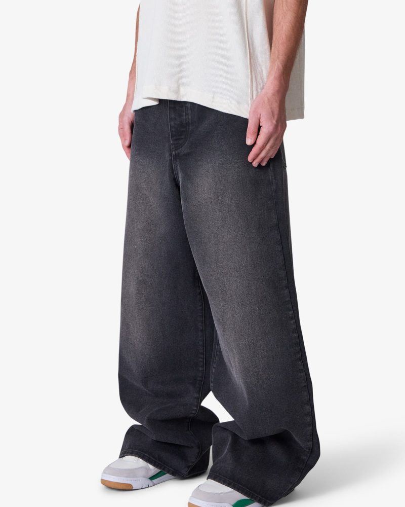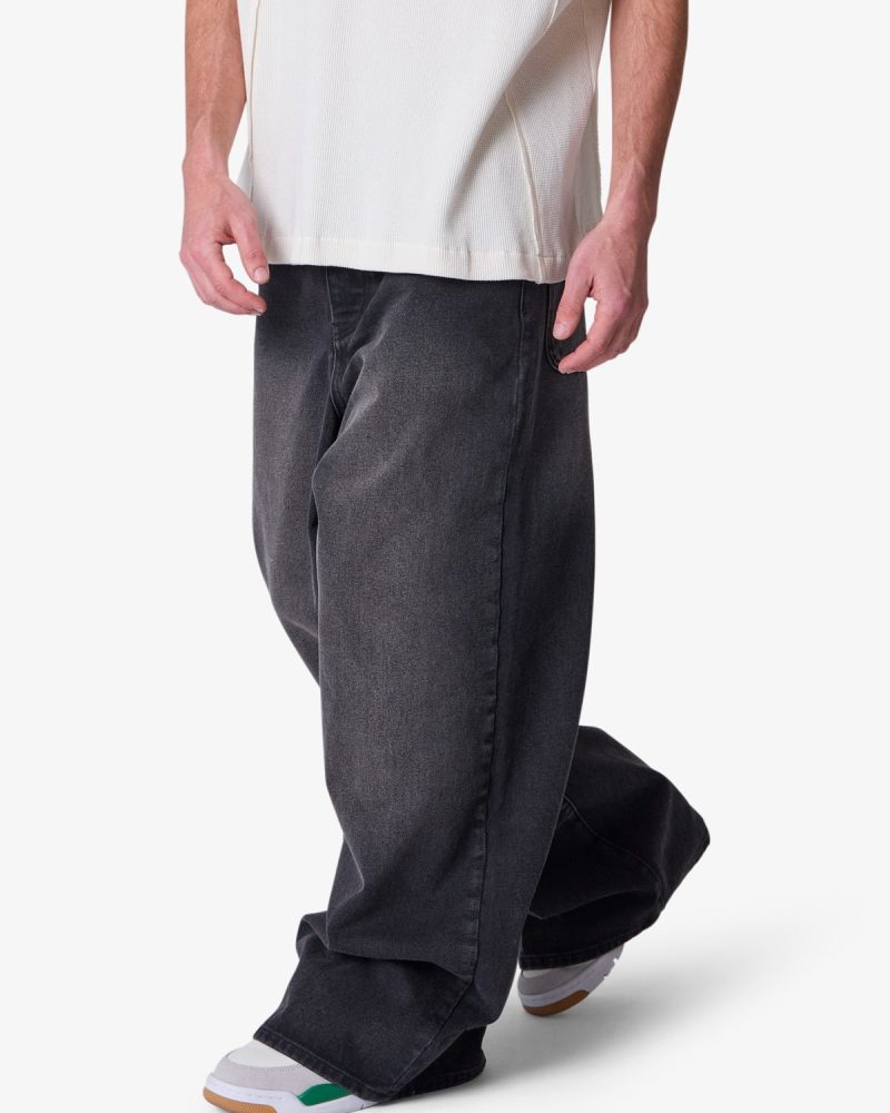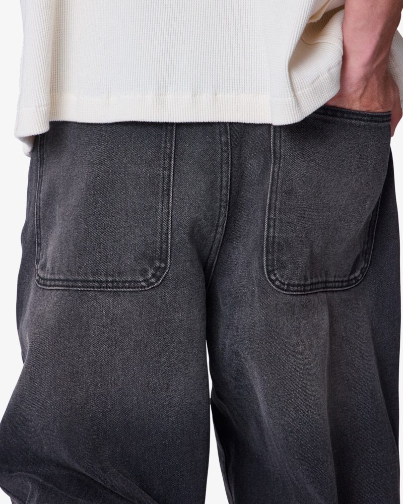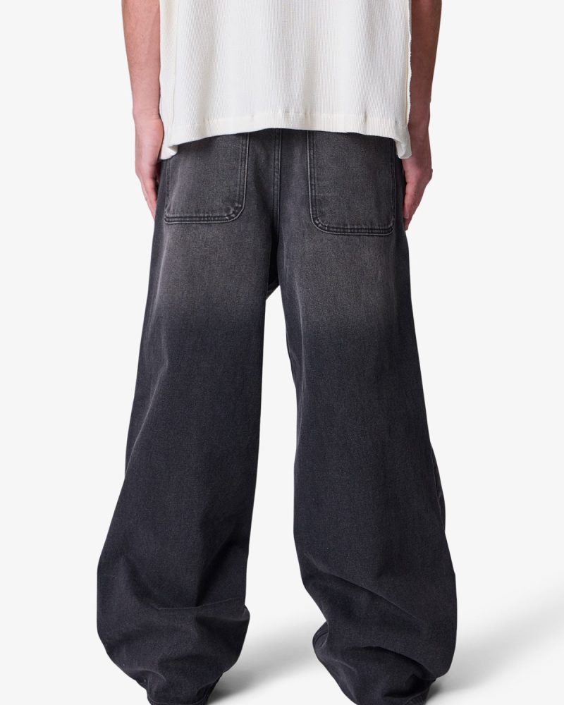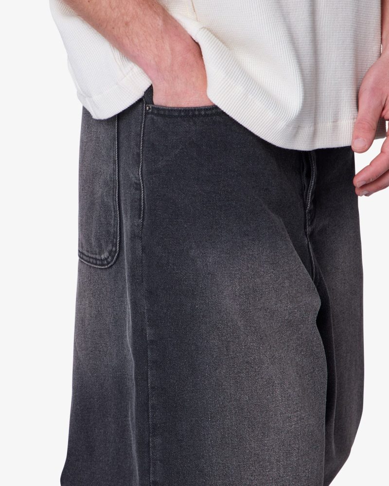 the Baggy Washed Rave Denim are designed with a new oversized rave fit. constructed from a vintage washed black denim. traditional 5 pocket denim details. and finished with a deconstructed hem.