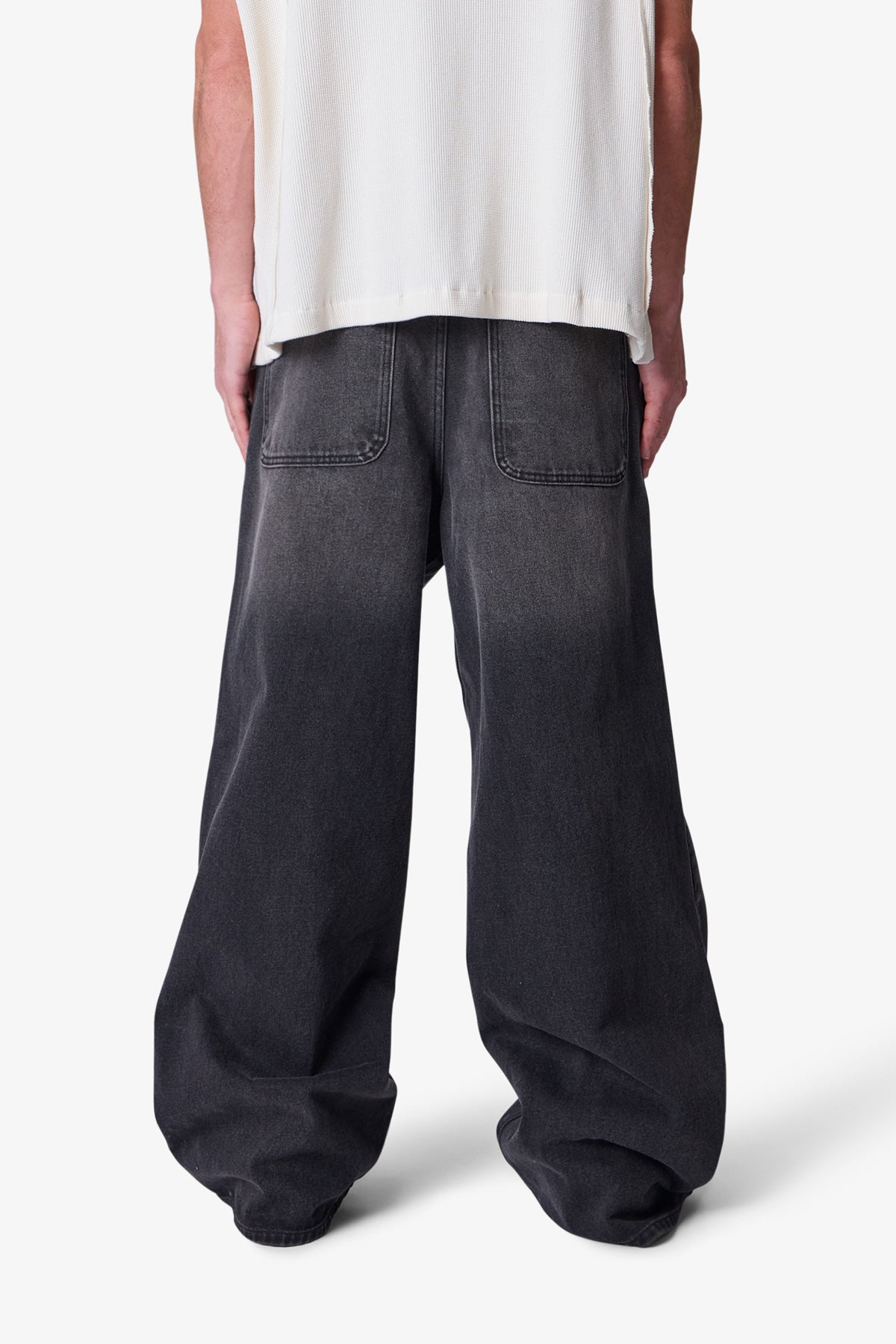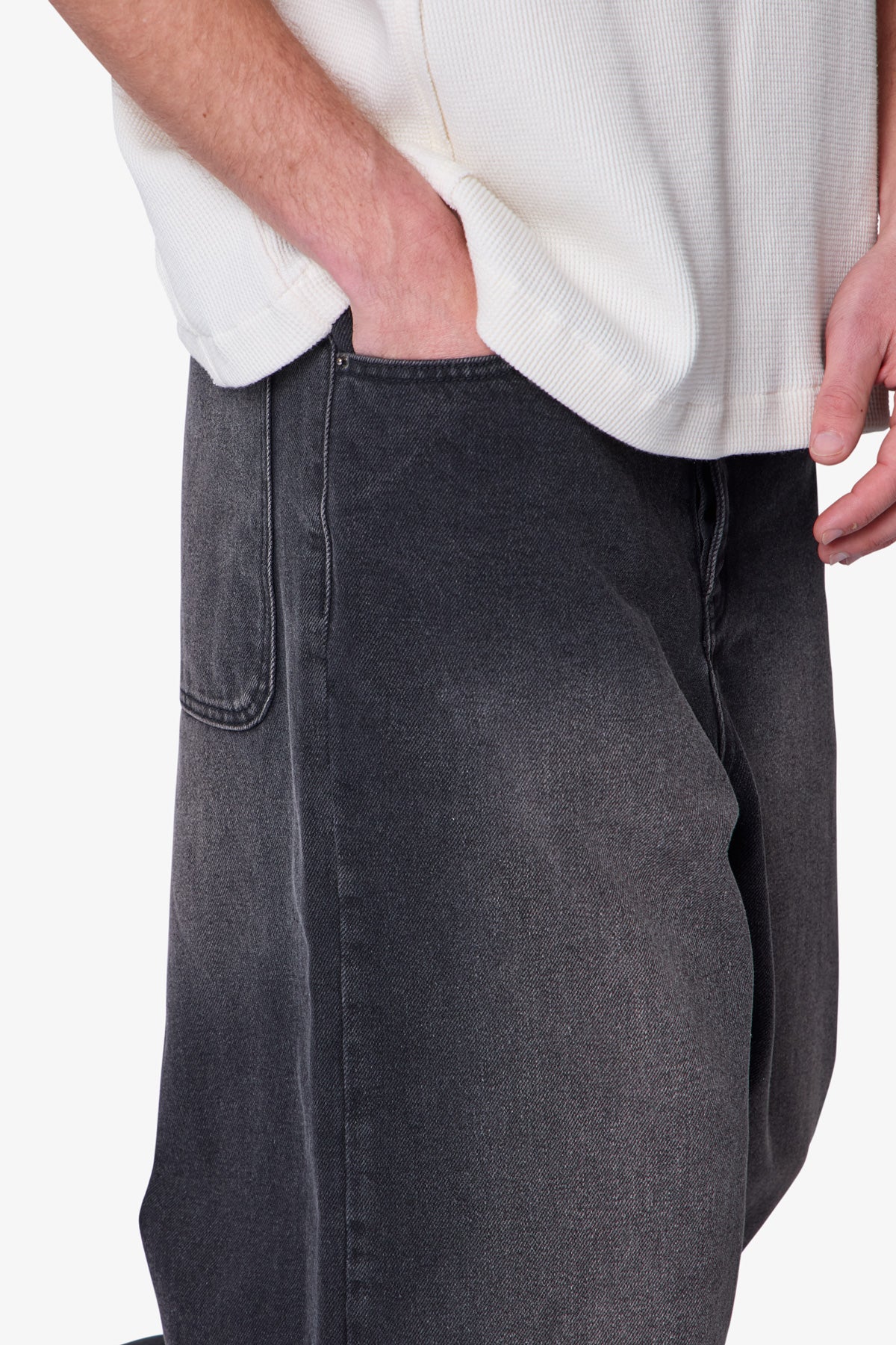 the Baggy Washed Rave Denim are designed with a new oversized rave fit. constructed from a vintage washed black denim. traditional 5 pocket denim details. and finished with a deconstructed hem.