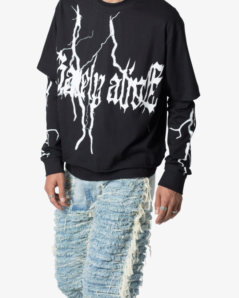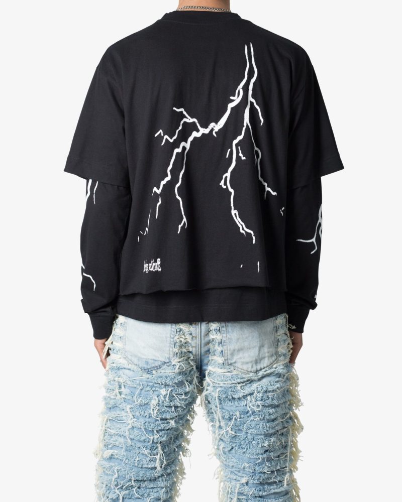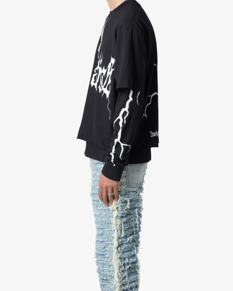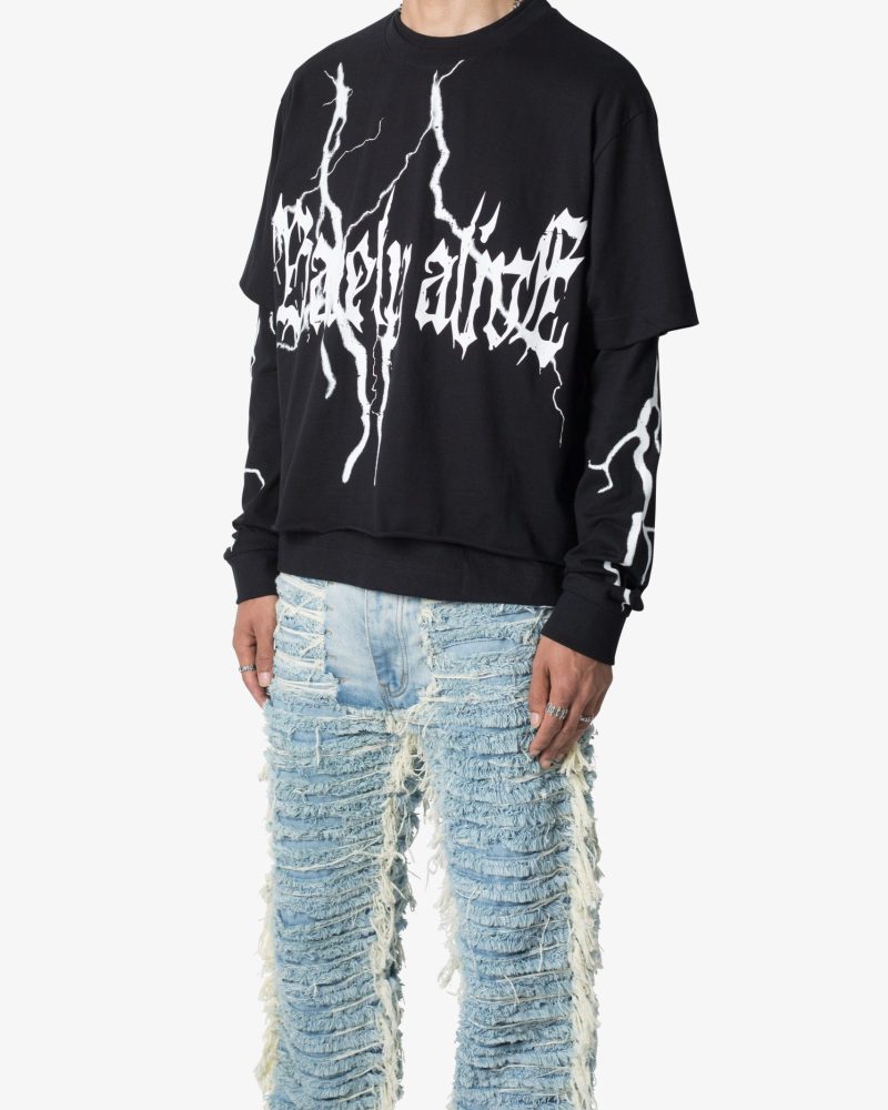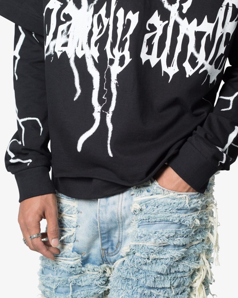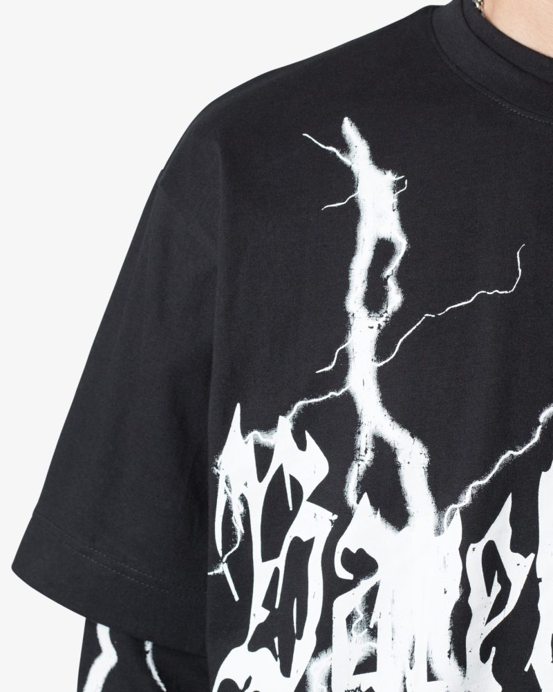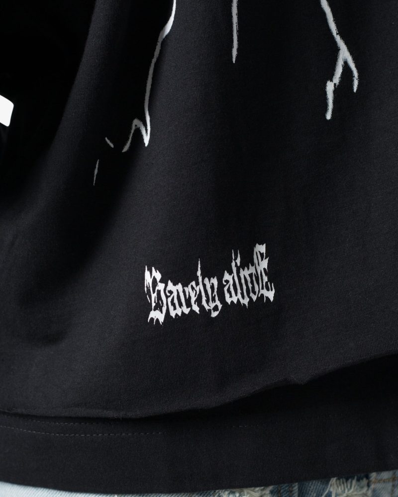 the Barely Alive Double Layer Tee is constructed from a custom developed cotton jersey and features a relaxed tee layered over l/s tee sleeves. and finished with screen prints throughout.