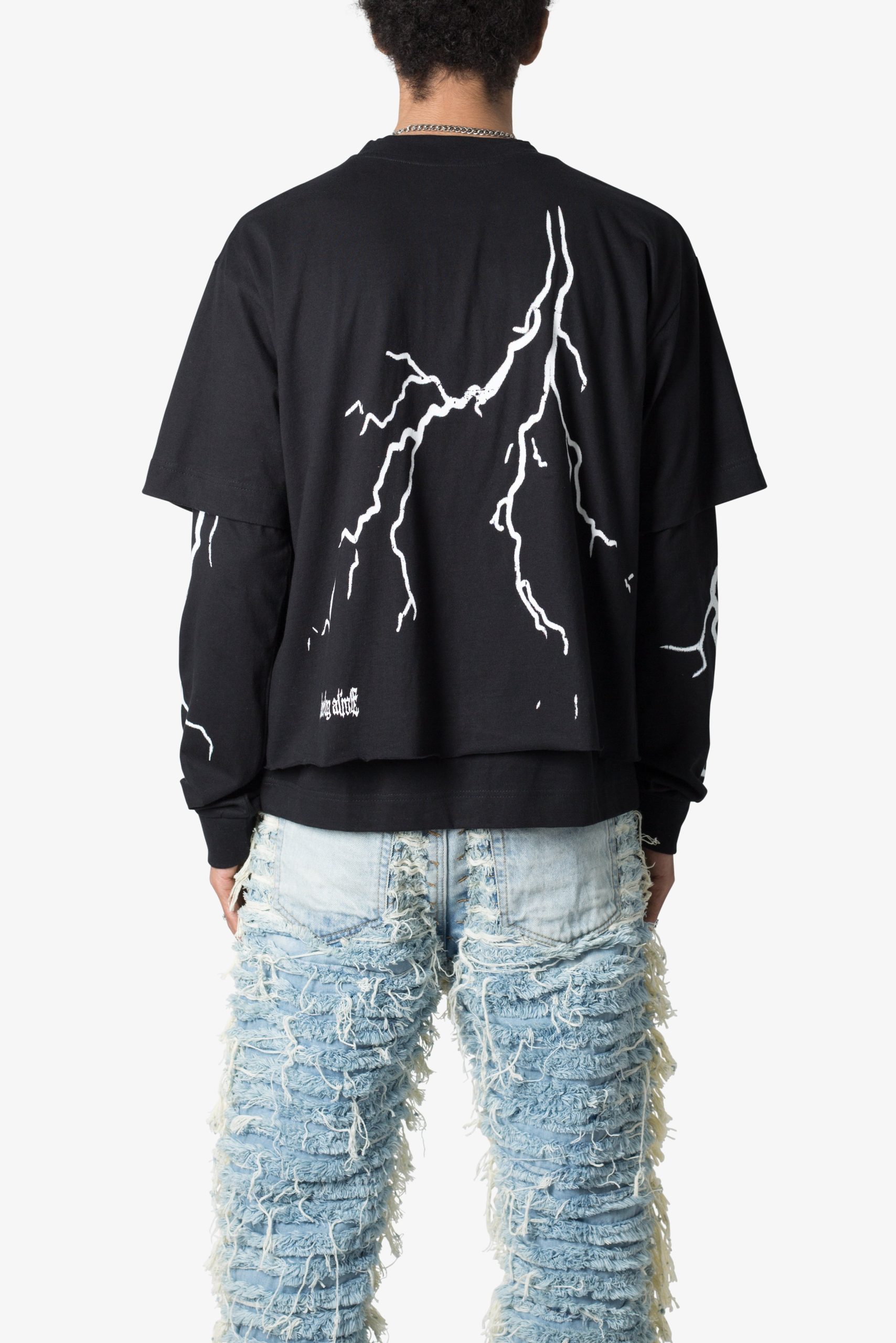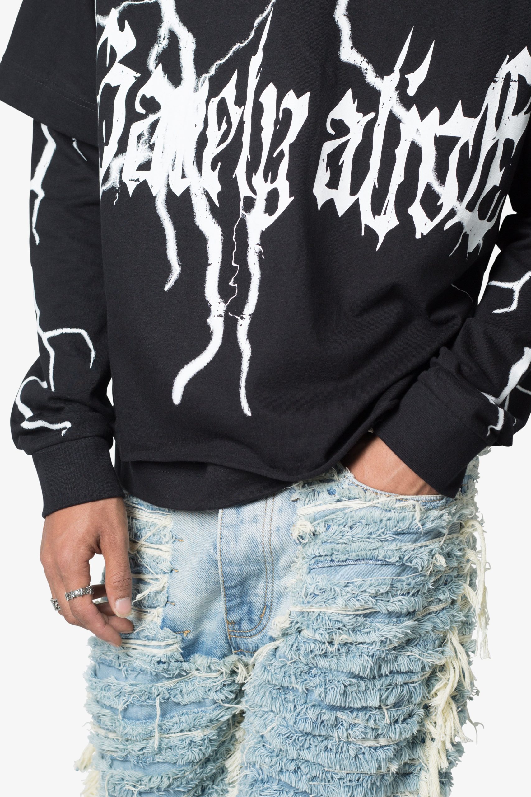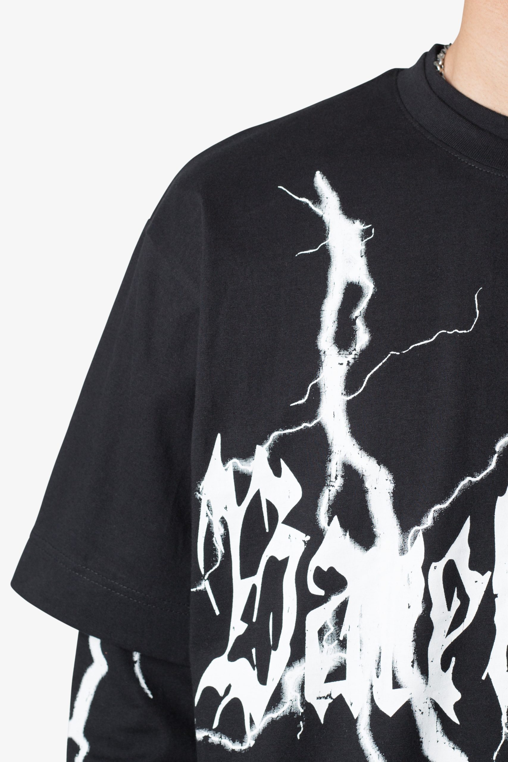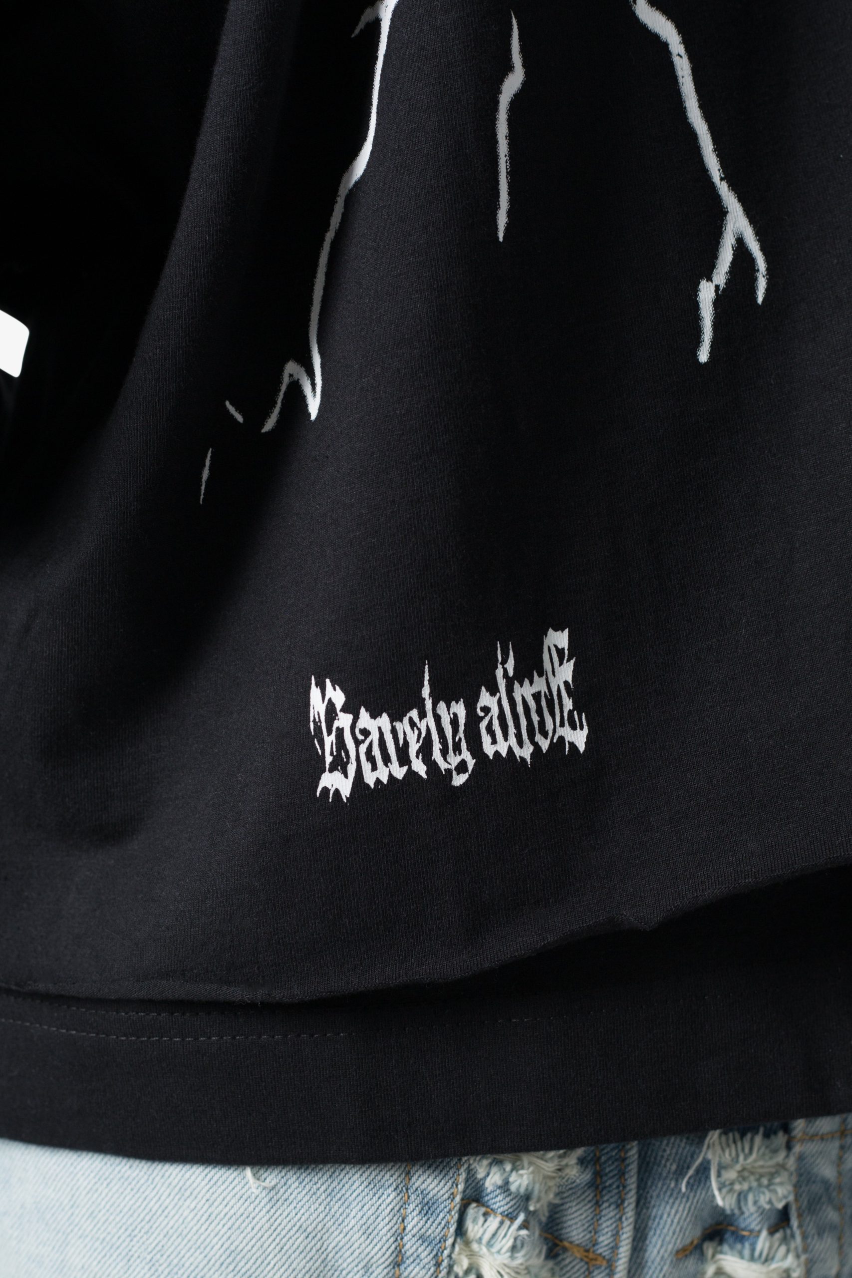 the Barely Alive Double Layer Tee is constructed from a custom developed cotton jersey and features a relaxed tee layered over l/s tee sleeves. and finished with screen prints throughout.