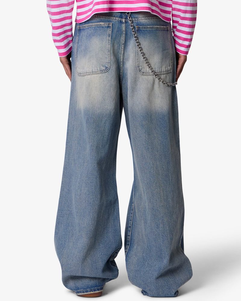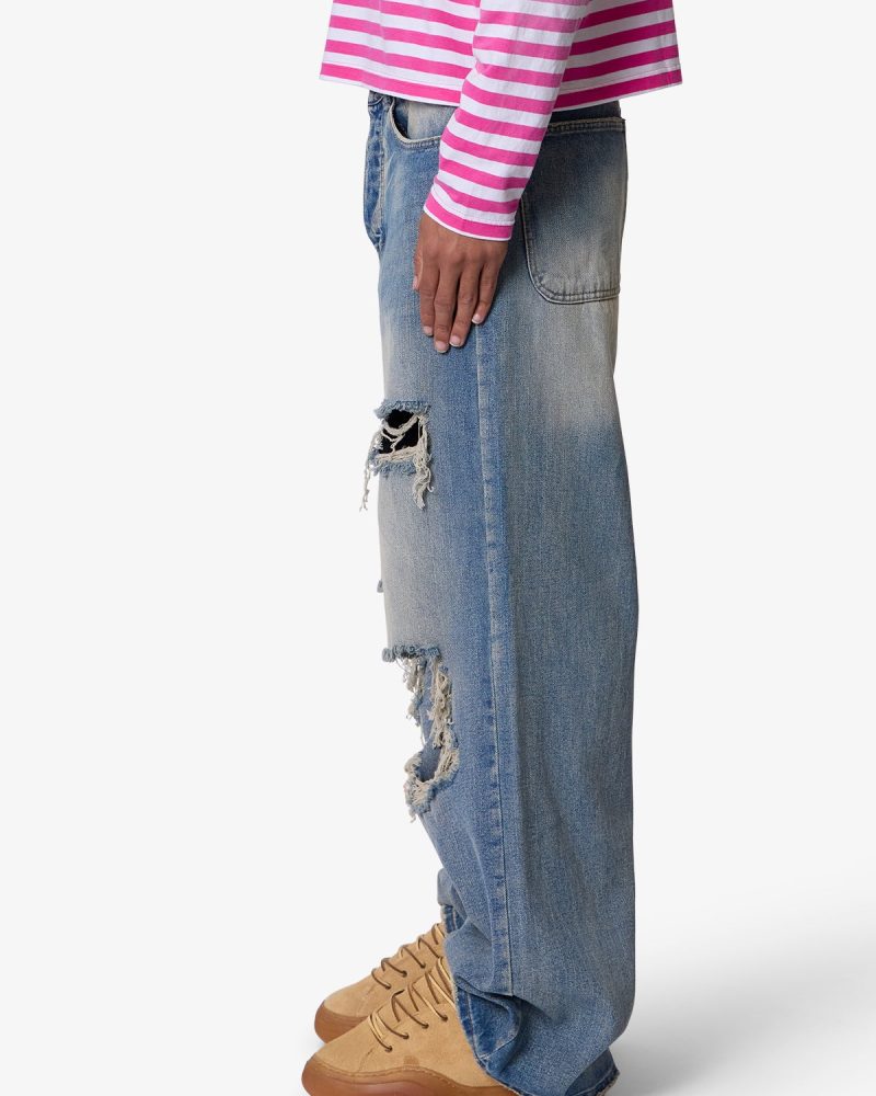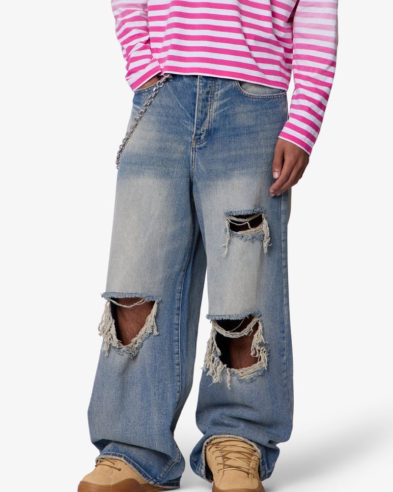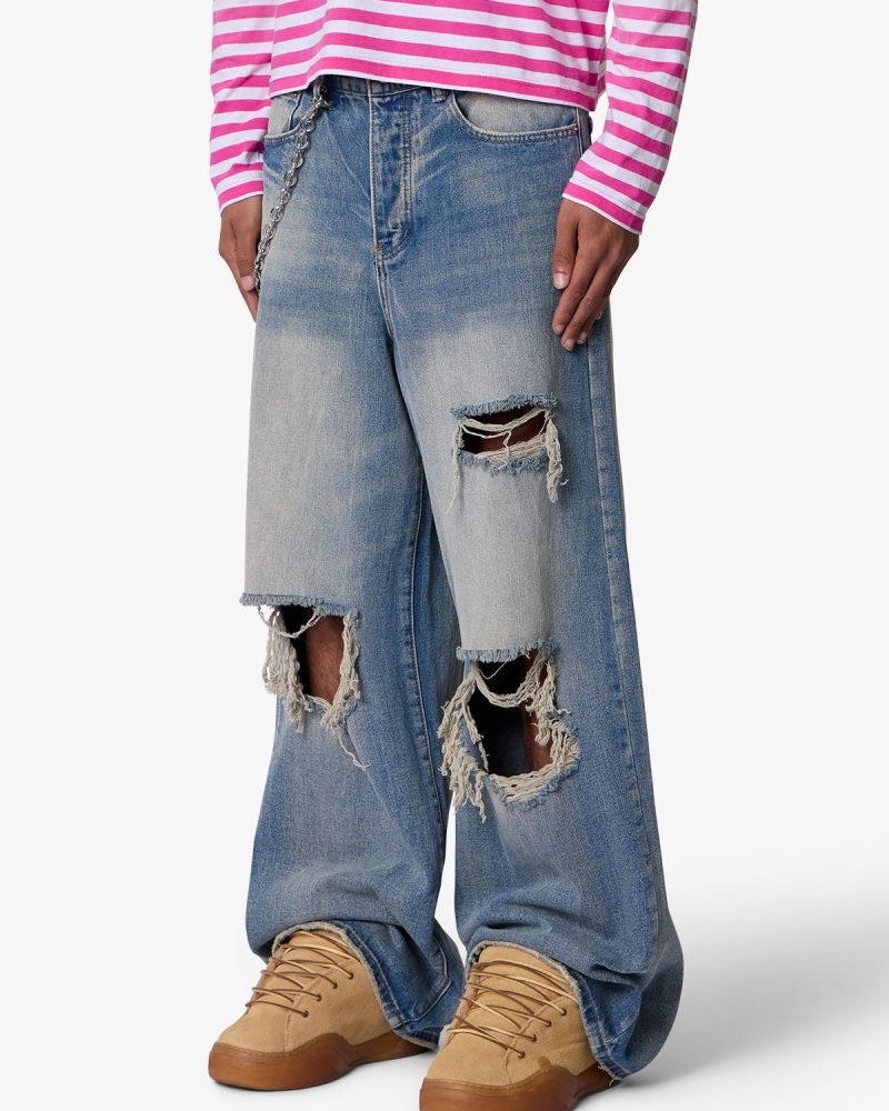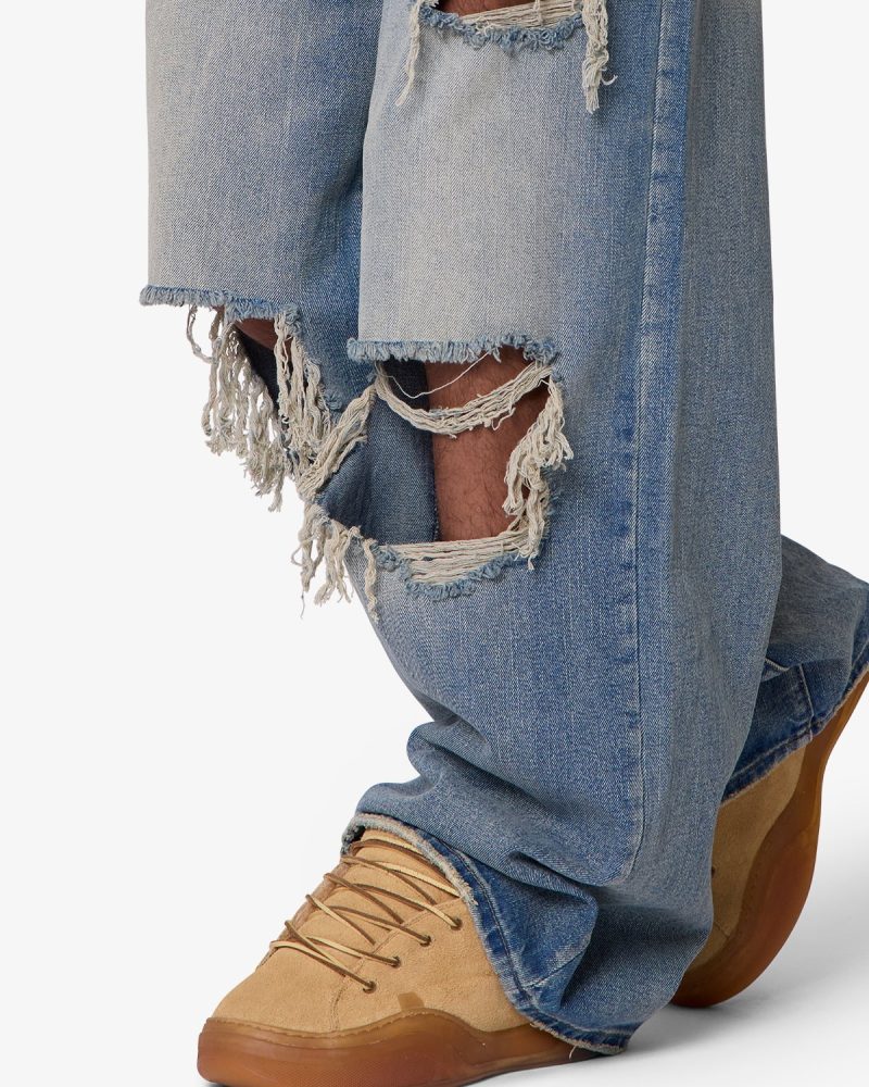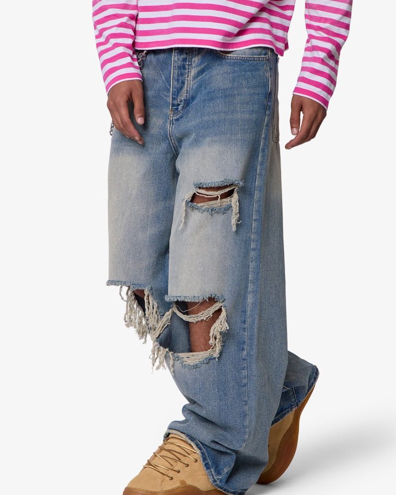 Constructed from a cotton-poly blend with a medium blue vintage wash. this denim features an extra baggy. wide-leg silhouette. Stonewashed and faded through the thighs. it includes visible whiskering and wash lines around high-wear areas. The front showcases large-scale shredding at the knees and thighs with full skin exposure. frayed edges. and a distressed hem.