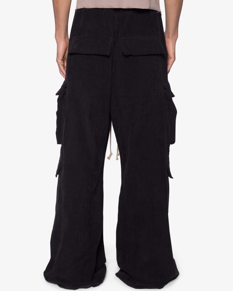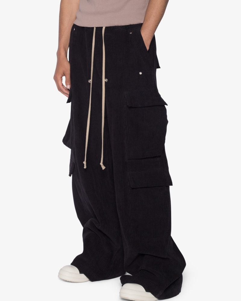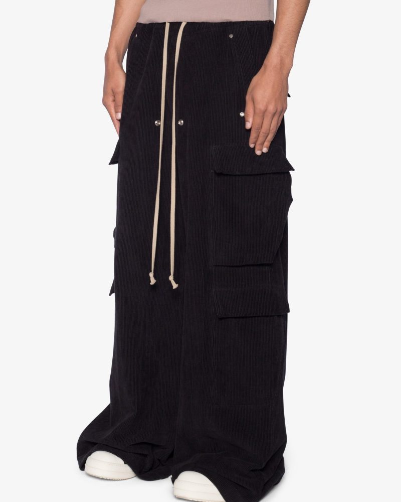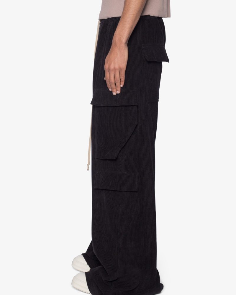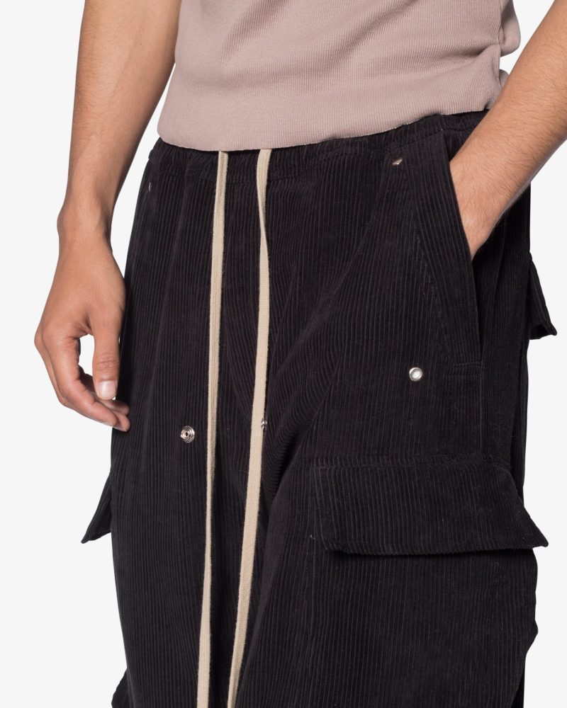 the Corduroy Rave Double Cargo Pants are designed with a new oversized rave fit. constructed from a cotton corduroy fabric. contrast drawcord. and finished with cargo pockets throughout.