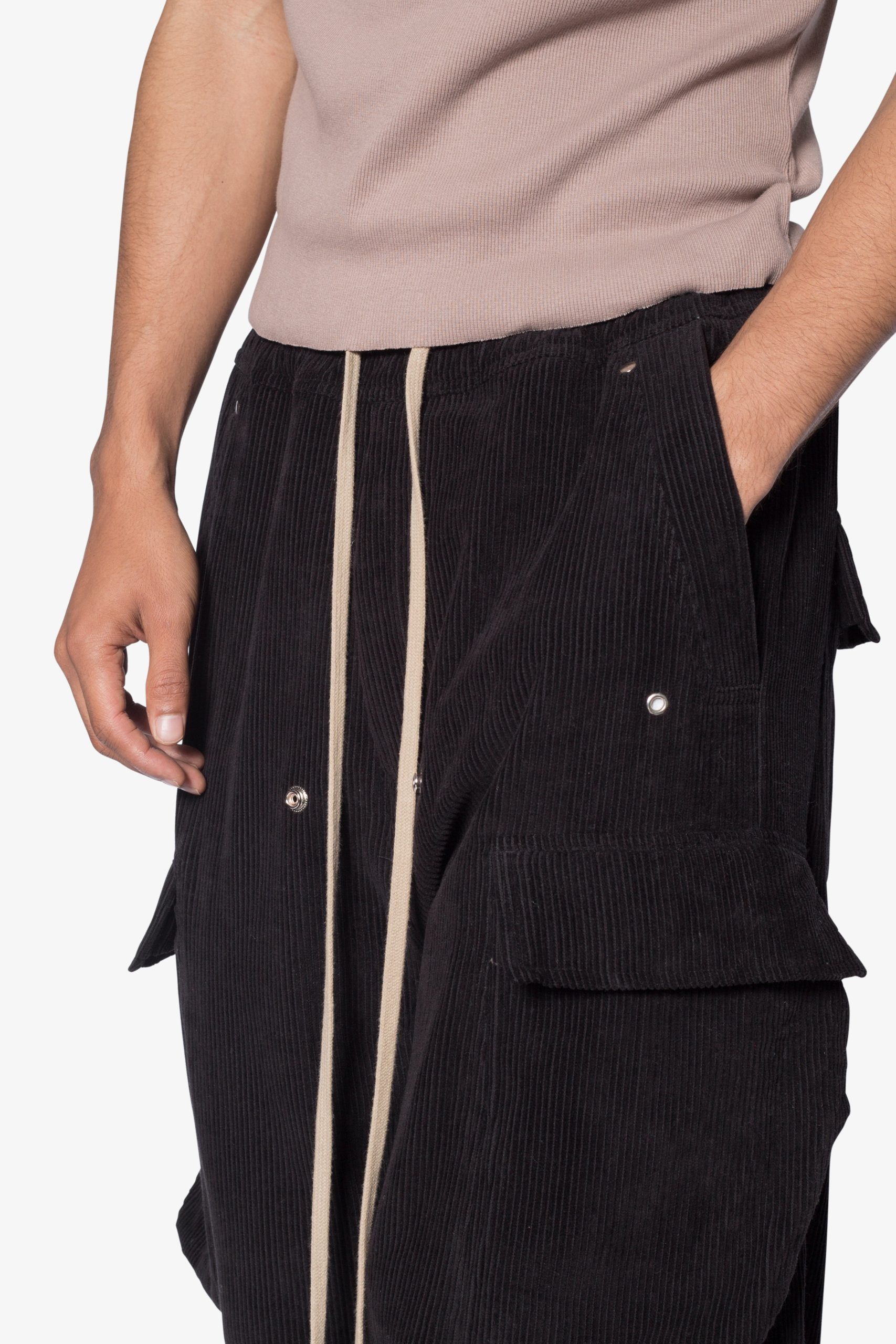 the Corduroy Rave Double Cargo Pants are designed with a new oversized rave fit. constructed from a cotton corduroy fabric. contrast drawcord. and finished with cargo pockets throughout.