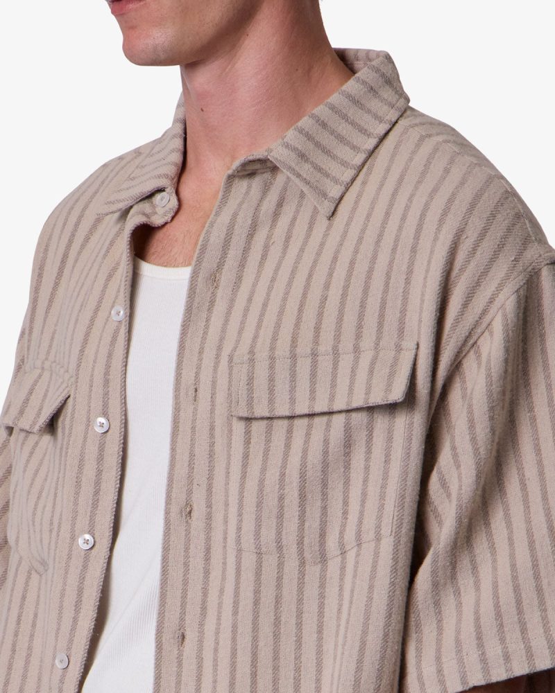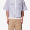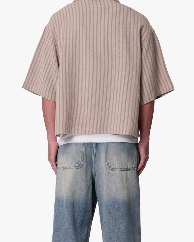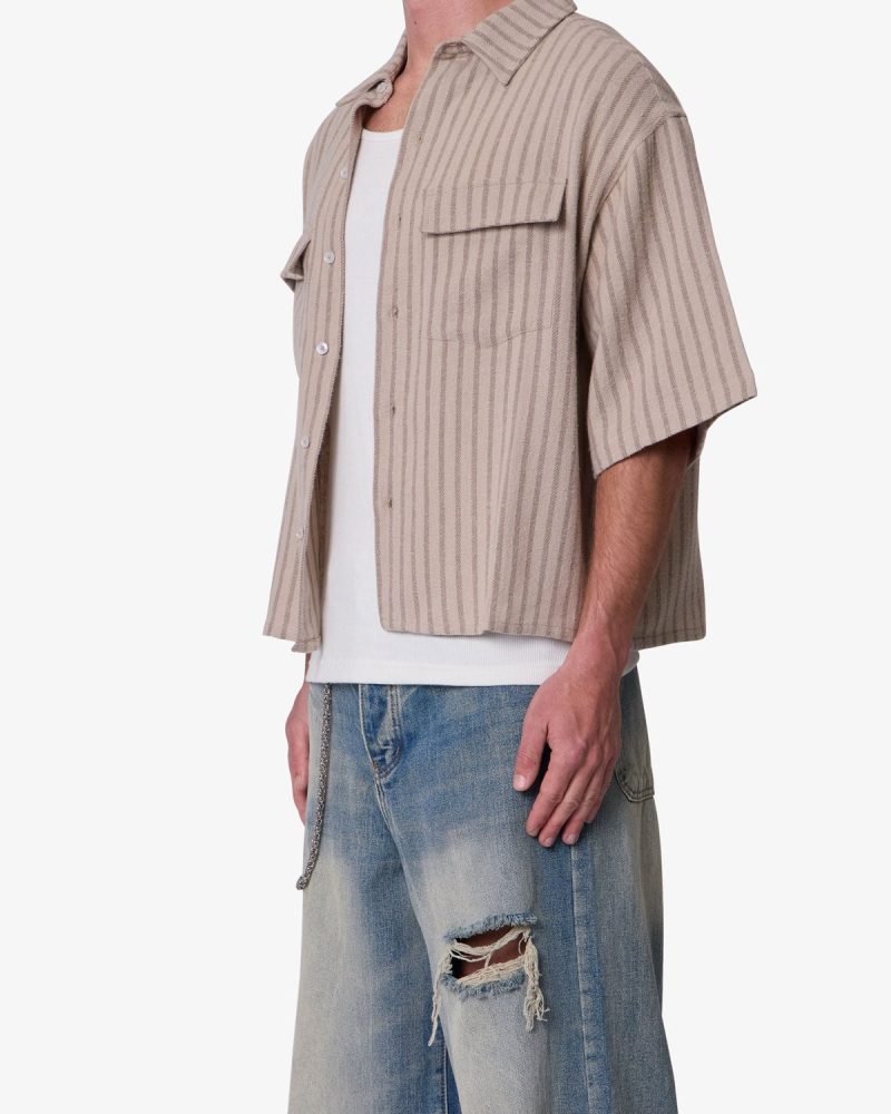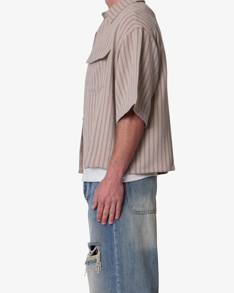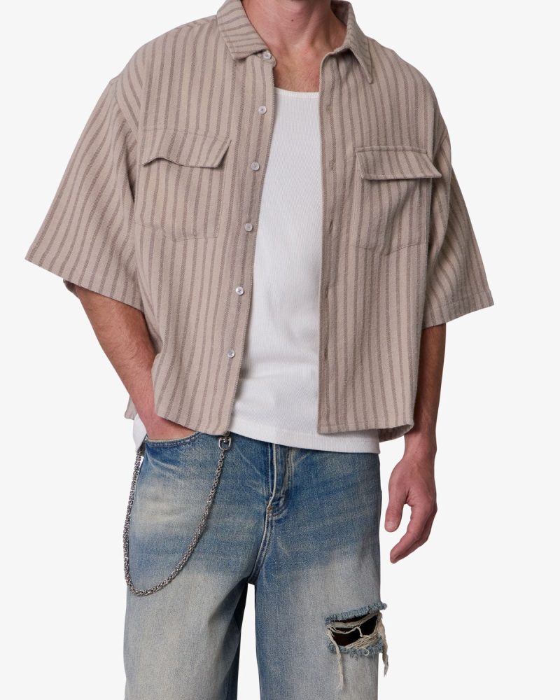 Constructed from 100% cotton. this short sleeve shirt features a cropped length and a boxy silhouette. Designed with dropped shoulders and wide sleeve openings. it includes a classic spread collar and dual chest patch pockets with flap closures. The tonal vertical stripe pattern is achieved through alternating ribbed textures on a lightly brushed woven fabric. Finished with a front button closure.