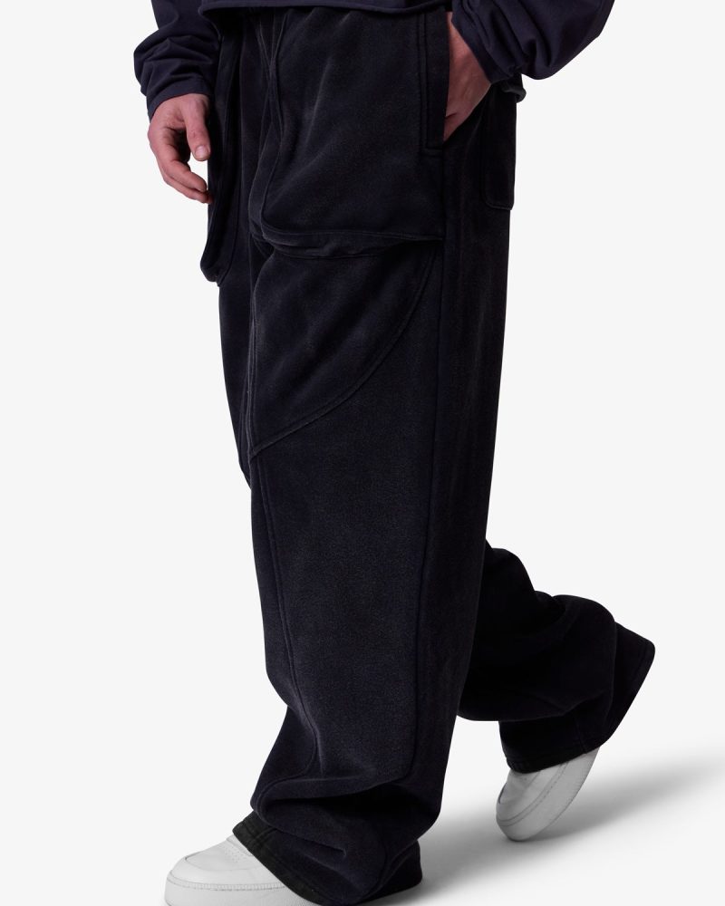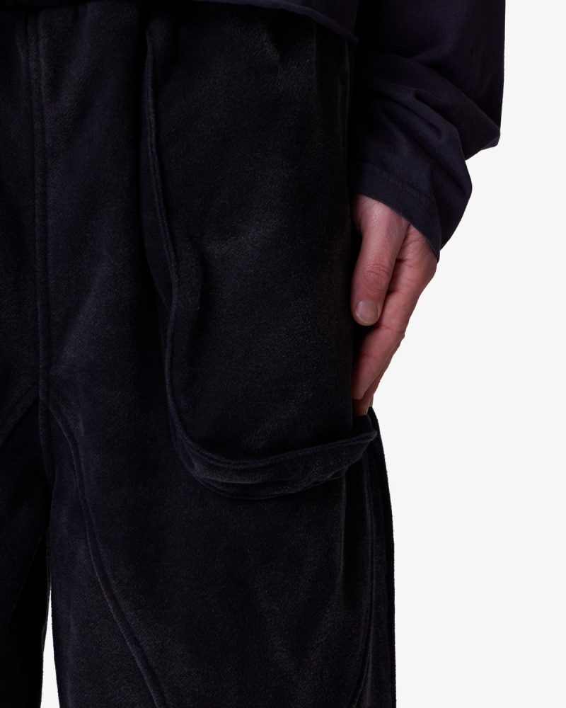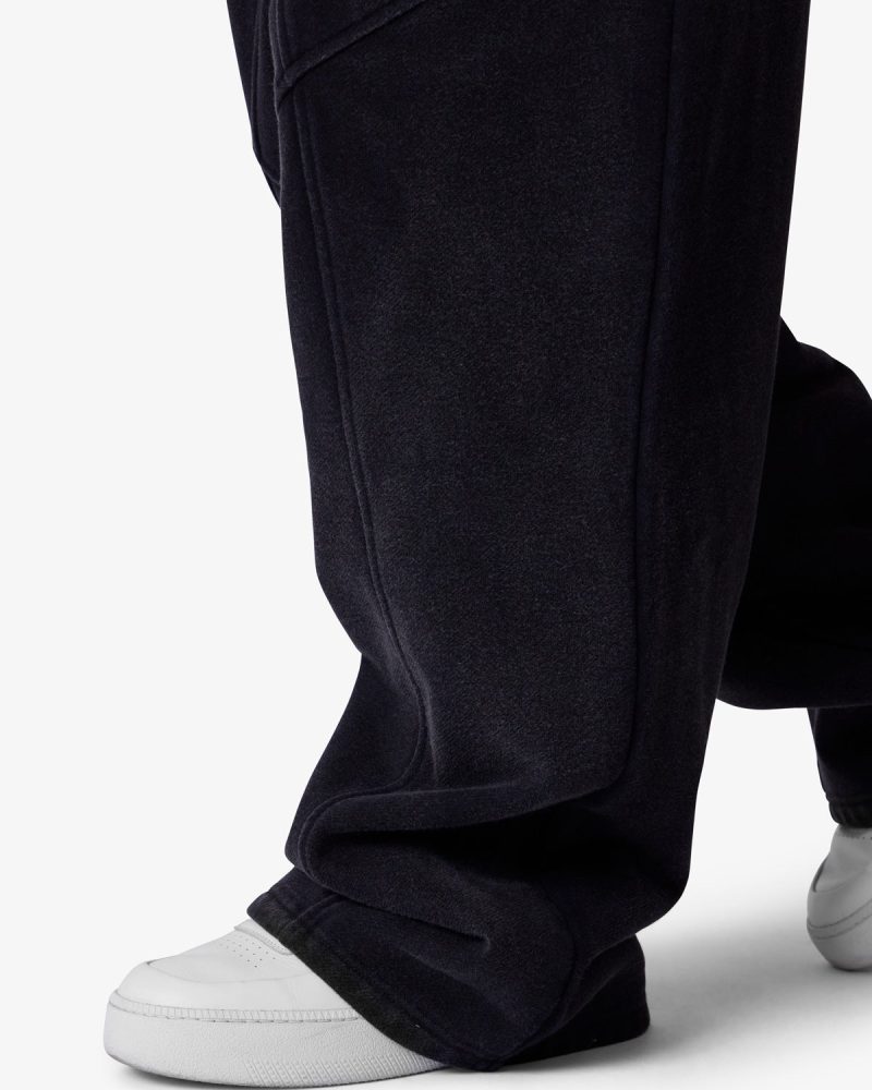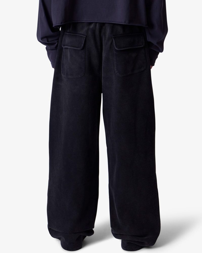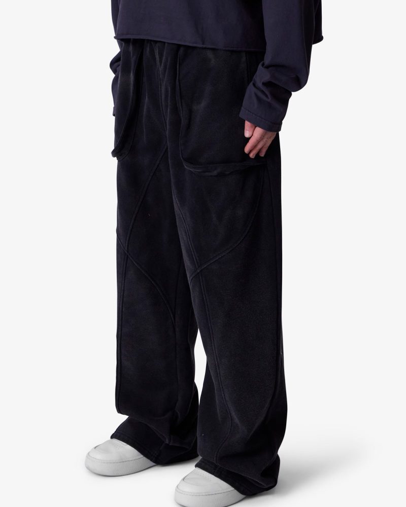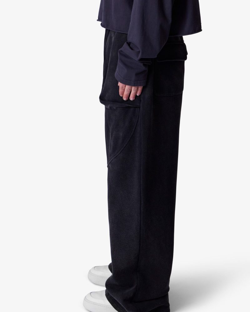 the Cross Seamed Sweatpants features a baggy fit with gusseted patch pockets at the waist. elasticized self at the waist. finished seam details throughout. and finished in both a washed and brushed fleece fabric.