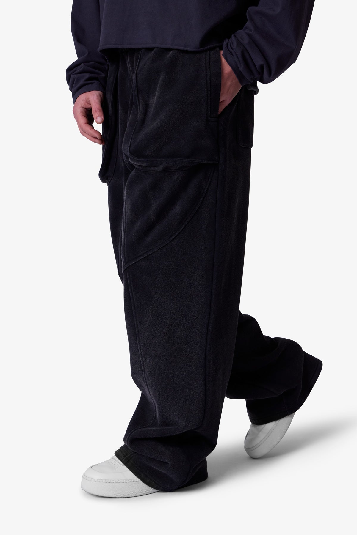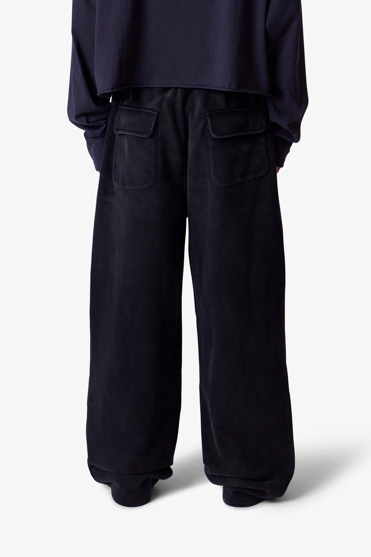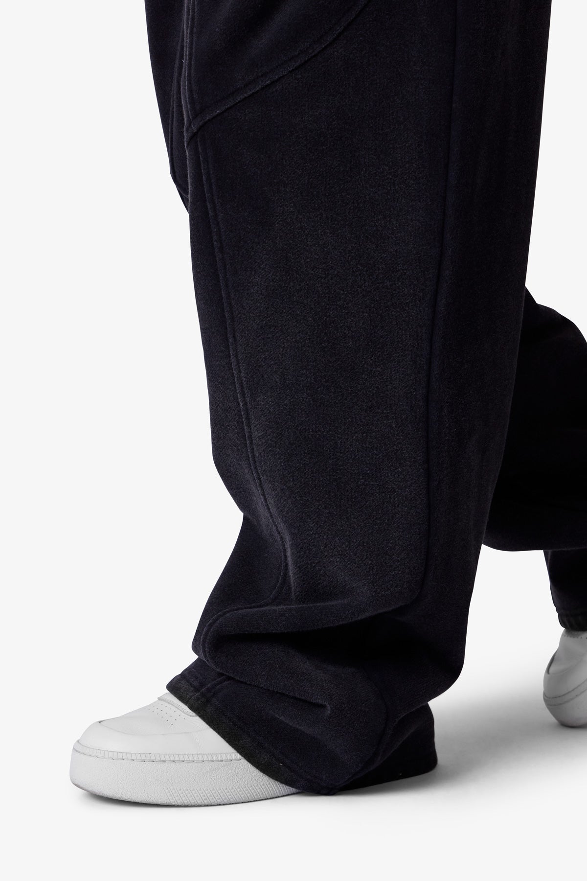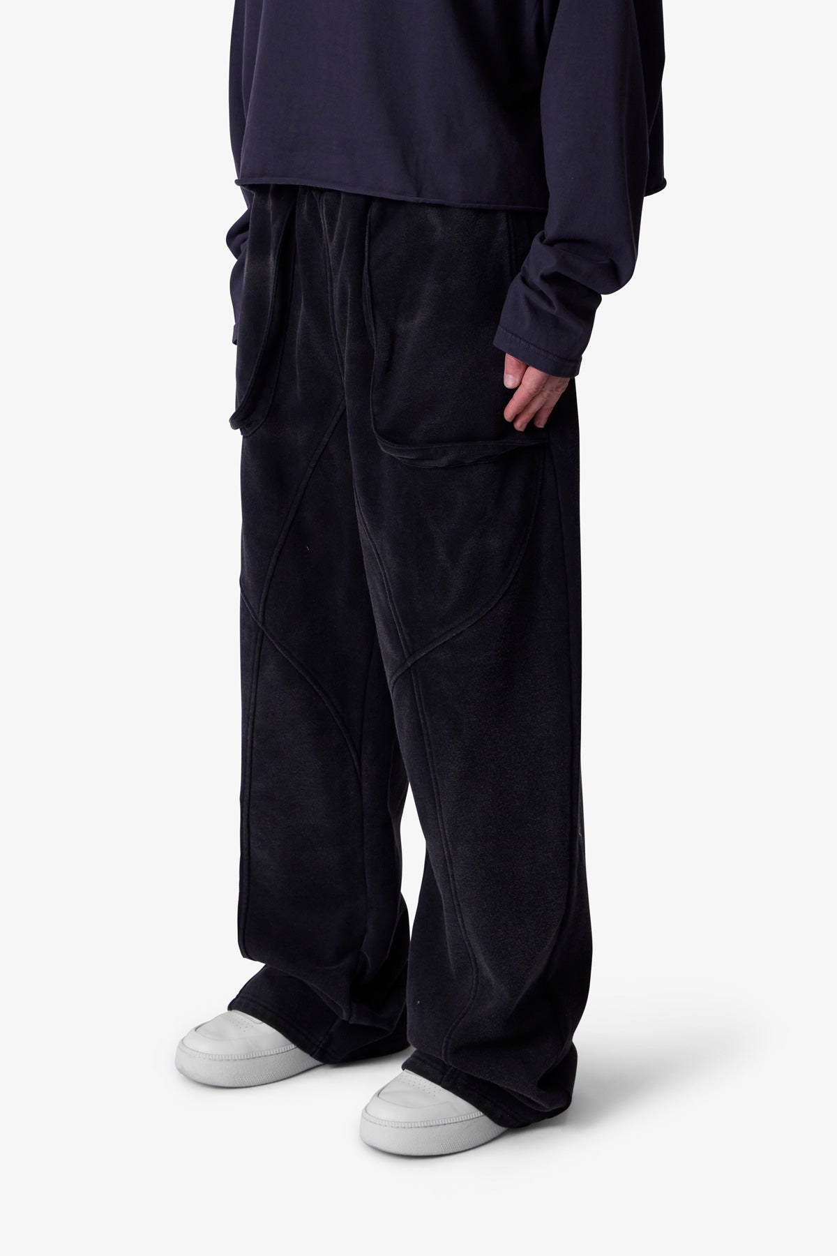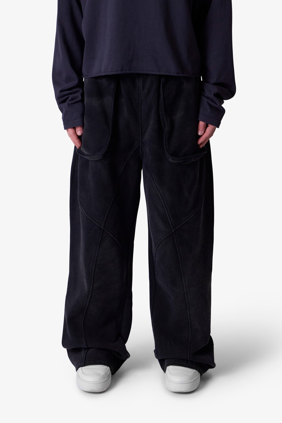 the Cross Seamed Sweatpants features a baggy fit with gusseted patch pockets at the waist. elasticized self at the waist. finished seam details throughout. and finished in both a washed and brushed fleece fabric.