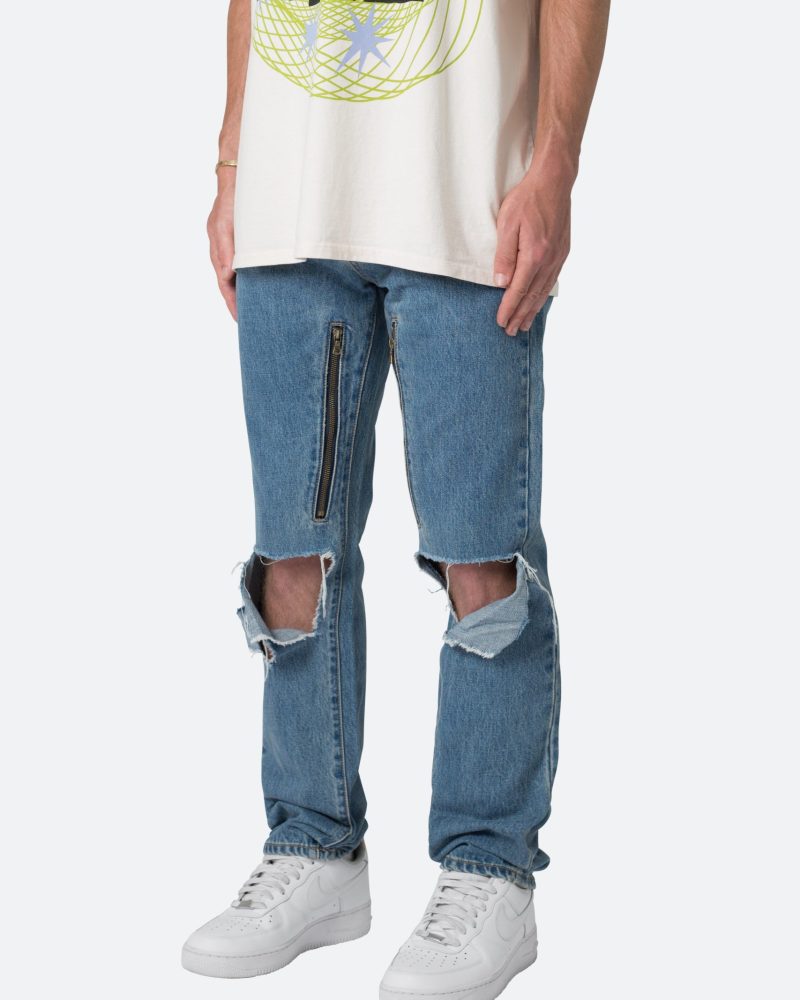 the D530 Zipper Straight Denim is designed with our new D fit which is relaxed throughout with an extended inseam for stacking and features a medium vintage wash. distressing details at the knees. and finished with zipper details at the thigh.