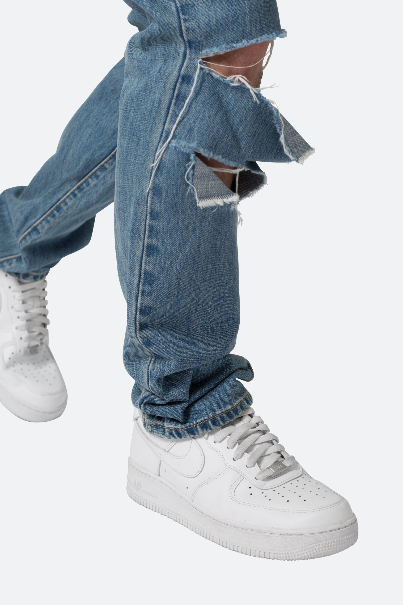 the D530 Zipper Straight Denim is designed with our new D fit which is relaxed throughout with an extended inseam for stacking and features a medium vintage wash. distressing details at the knees. and finished with zipper details at the thigh.