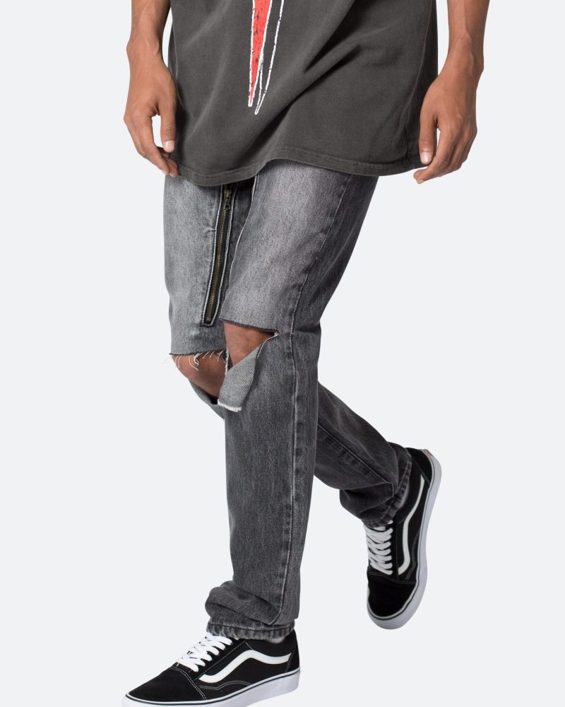 the D530 Zipper Straight Denim is designed with our new D fit which is relaxed throughout with an extended inseam for stacking and features a medium vintage wash. distressing details at the knees. and finished with zipper details at the thigh.