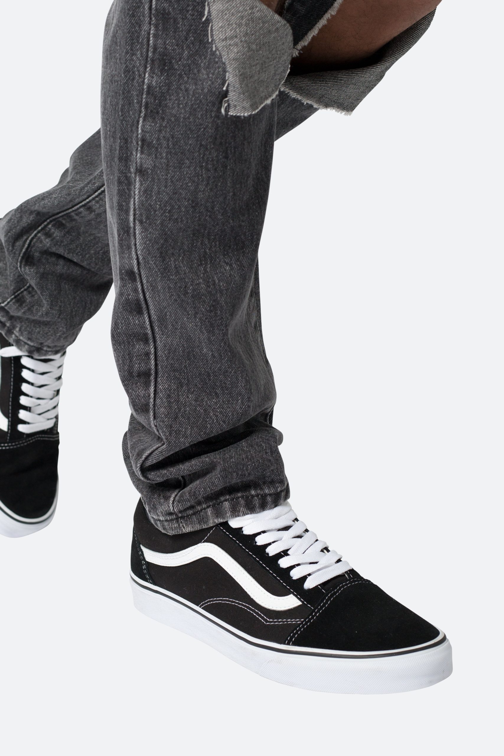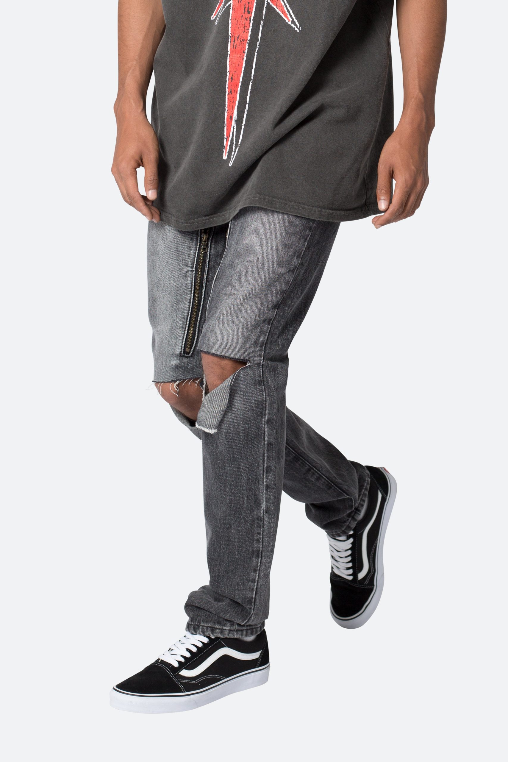 the D530 Zipper Straight Denim is designed with our new D fit which is relaxed throughout with an extended inseam for stacking and features a medium vintage wash. distressing details at the knees. and finished with zipper details at the thigh.