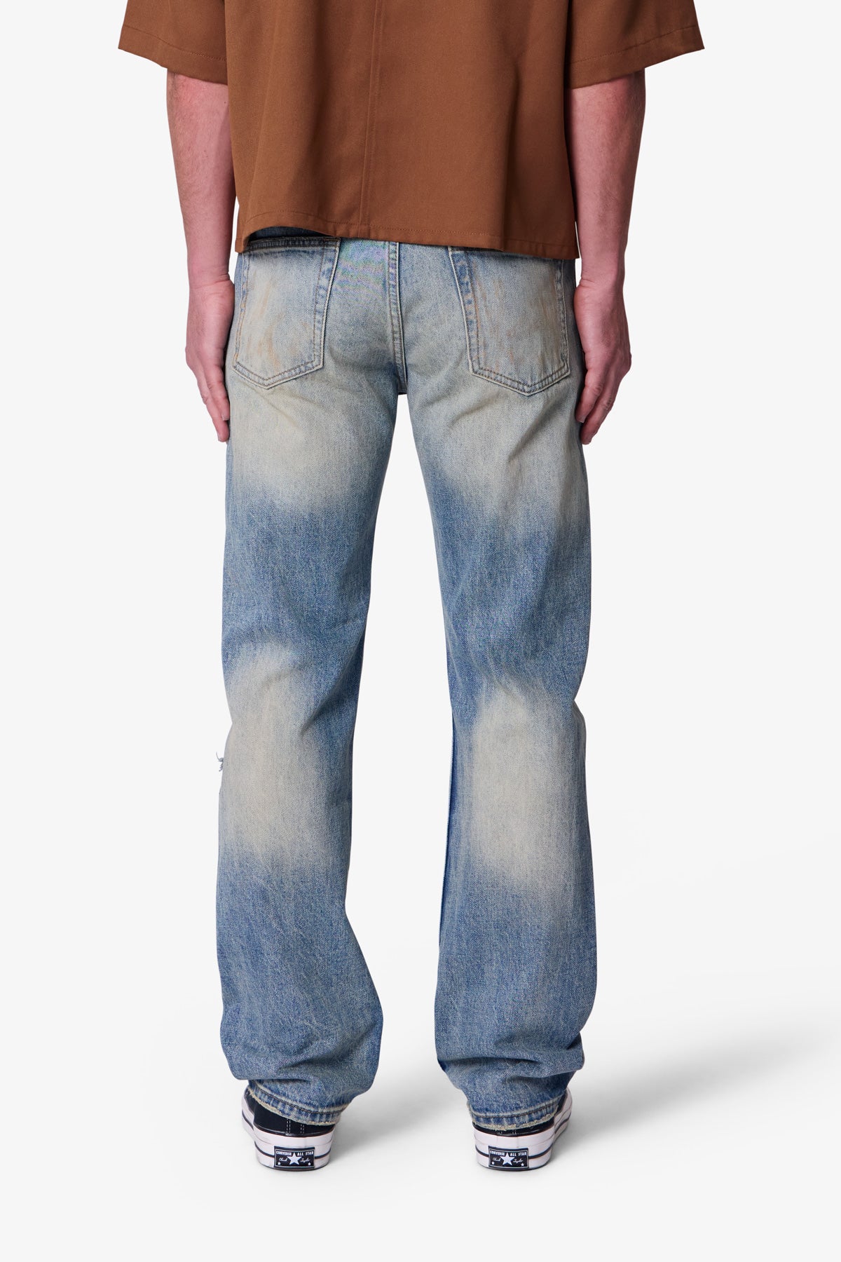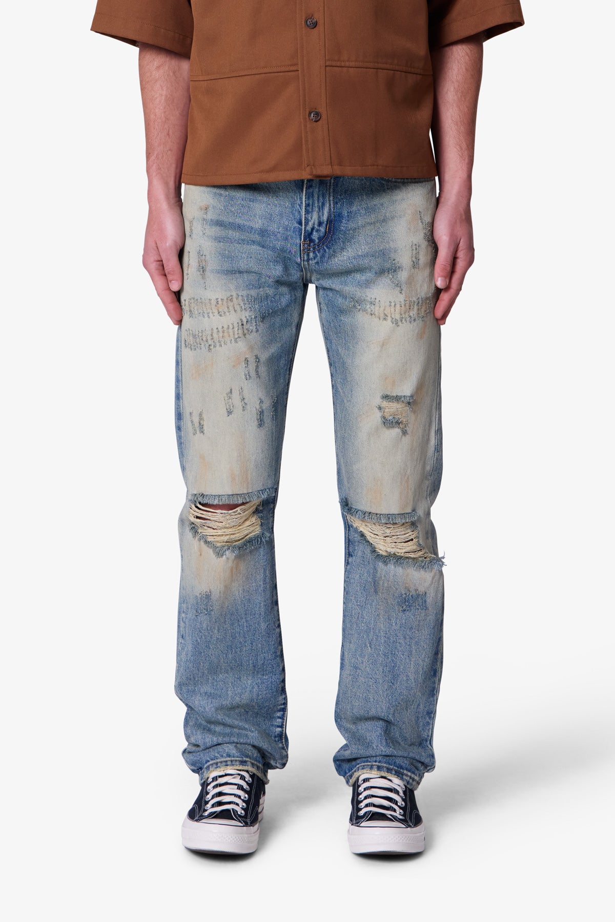 The D737 Down in the Dirt Denim is constructed from 100% cotton in a vintage blue wash. This straight fit style features knee blowouts. dremmel distressing. and oil stain wash details throughout. Finished with a 5-pocket configuration inspired by vintage workwear silhouettes.