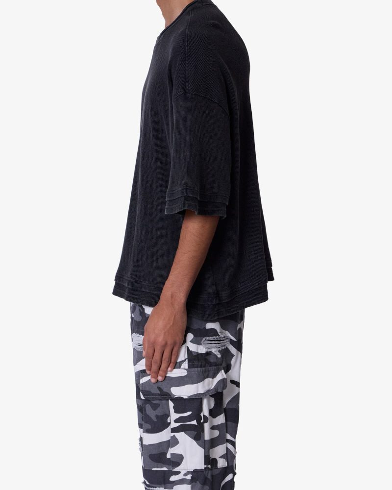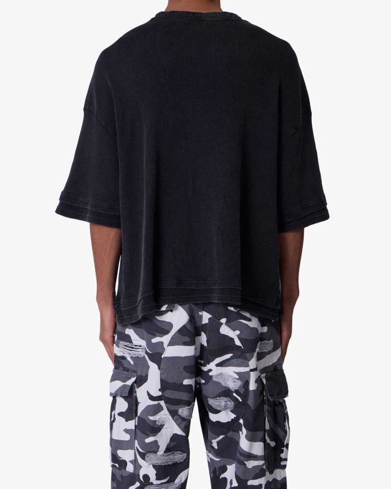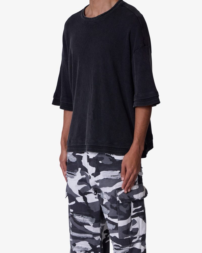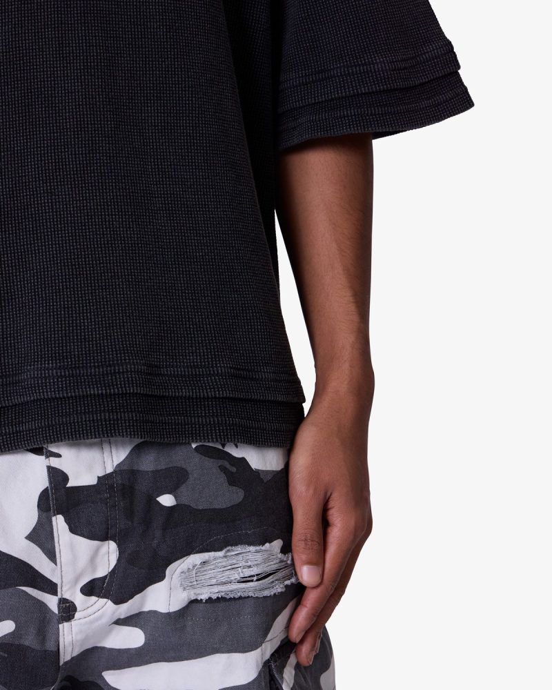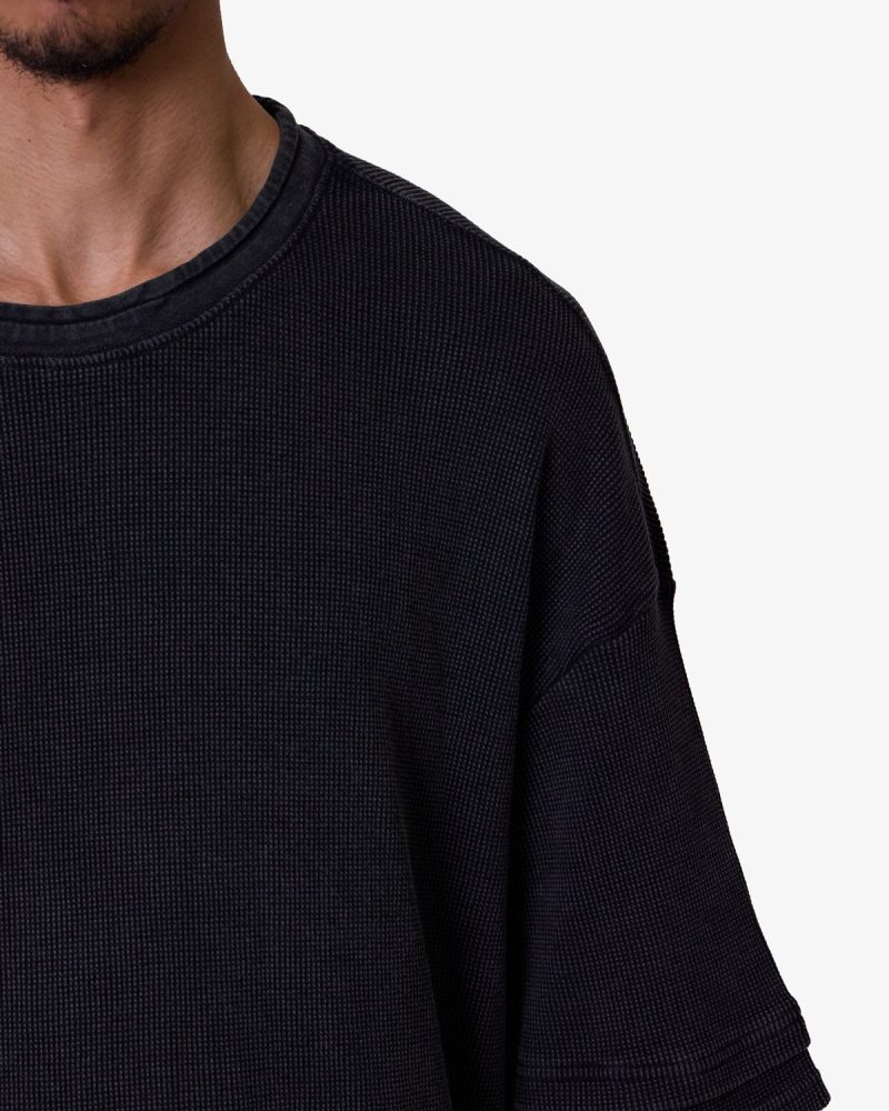 the Double Layer Acid Washed Tee is constructed from a custom developed cotton thermal fabric and features a relaxed tee layered with 2 short sleeves. and finished with a vintage wash throughout for improved hand feel.