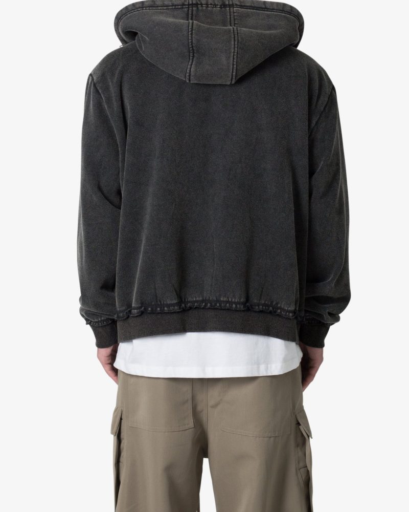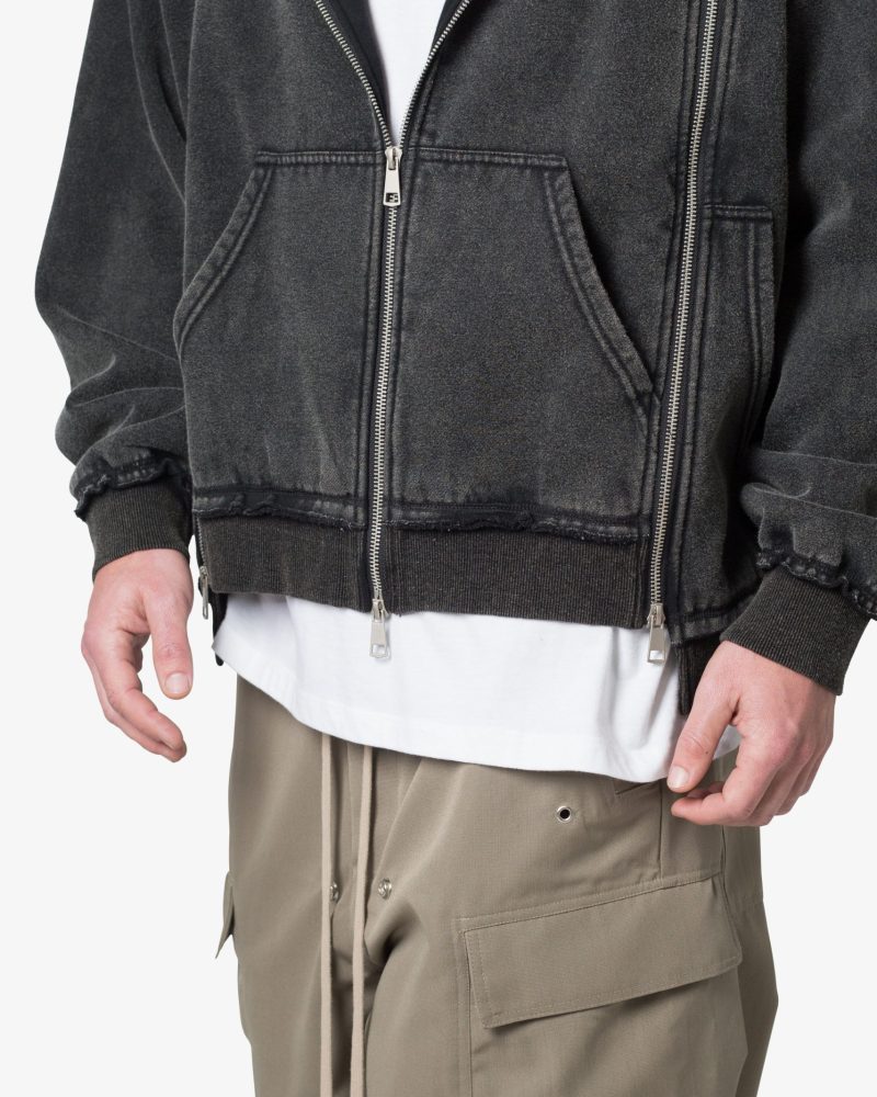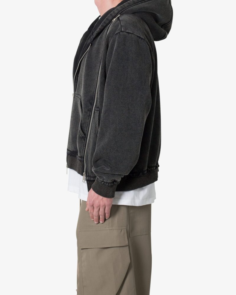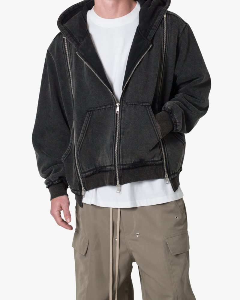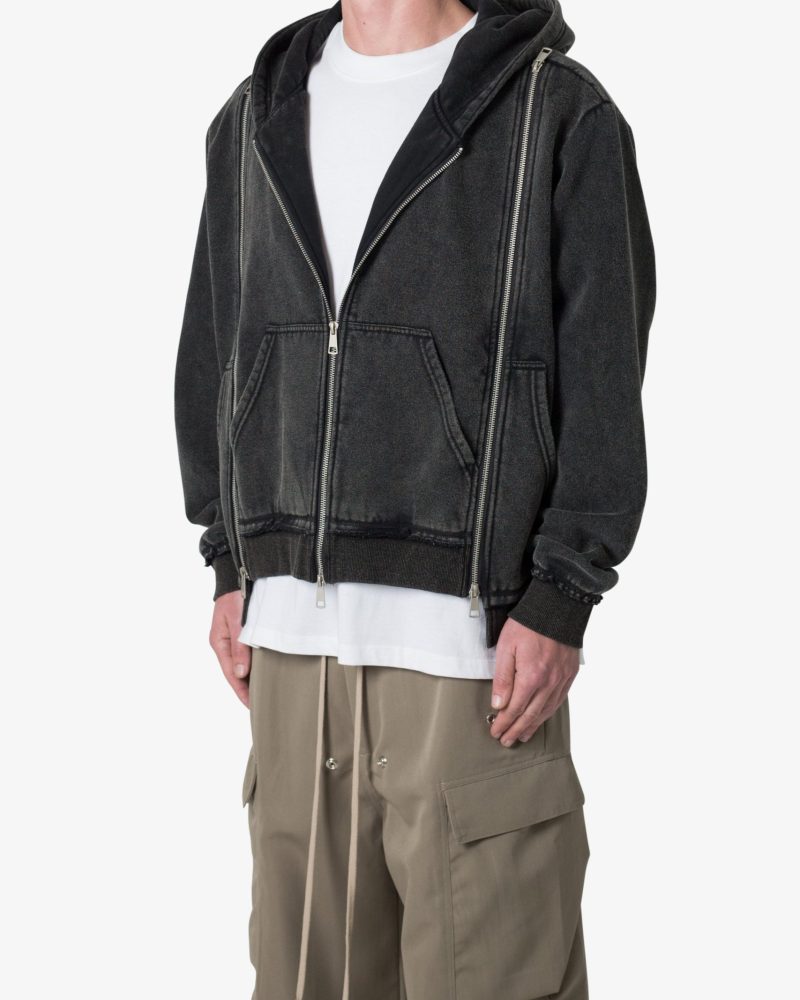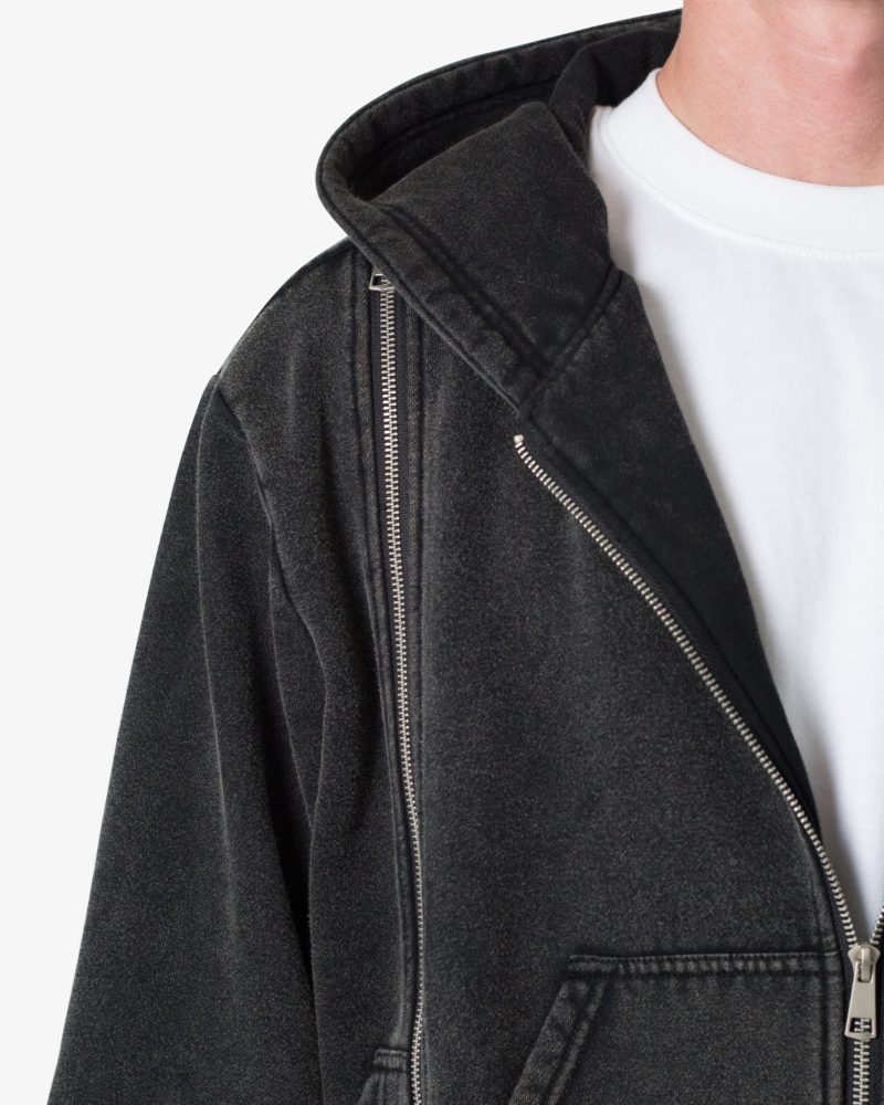 the Dual Zipper Hoodie is designed from 100% cotton french terry. with a T8 metal zipper at the chest. a kangaroo pocket that is split onto both sides. additional zippers on the wearer’s front. and is finished with a garment wash.