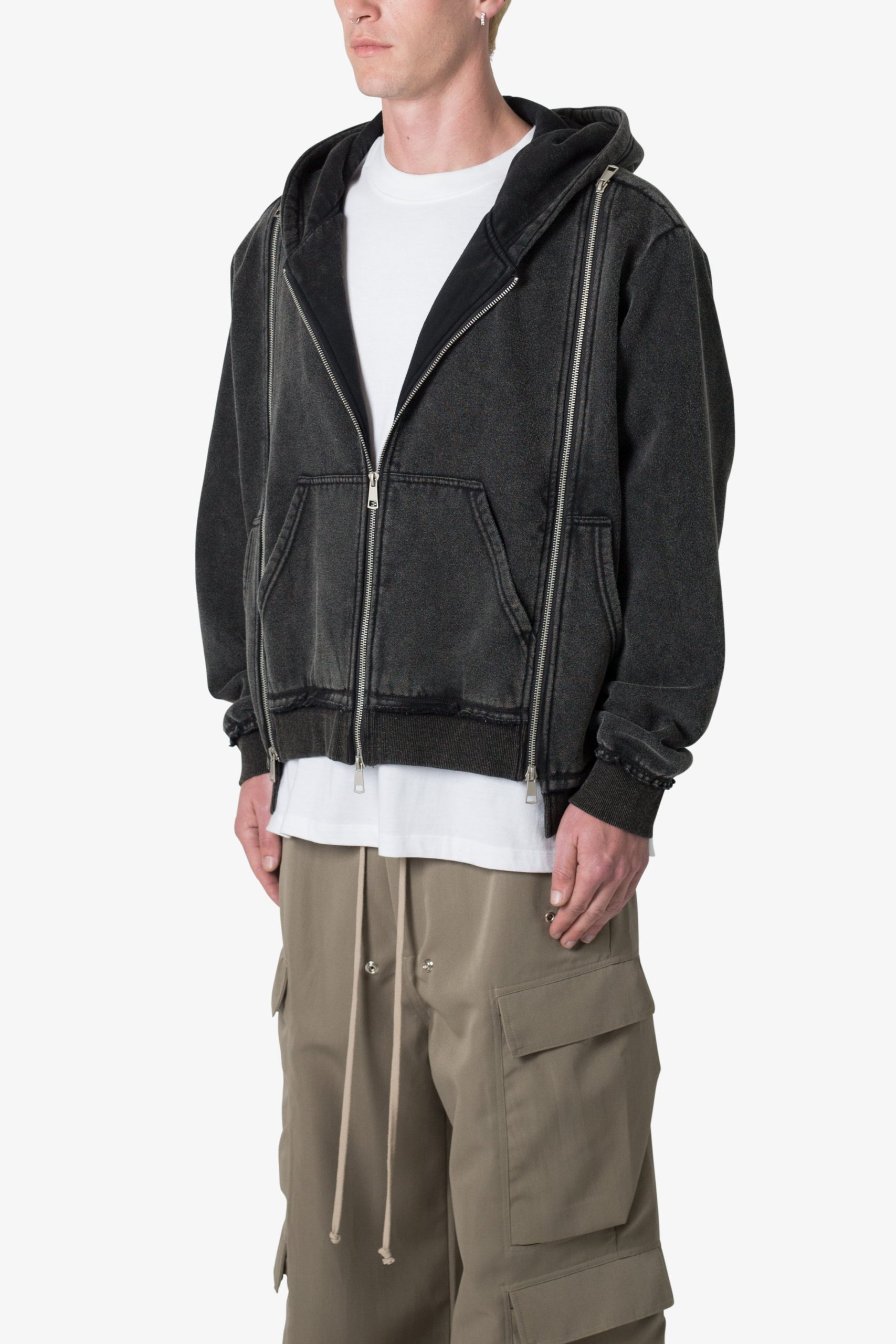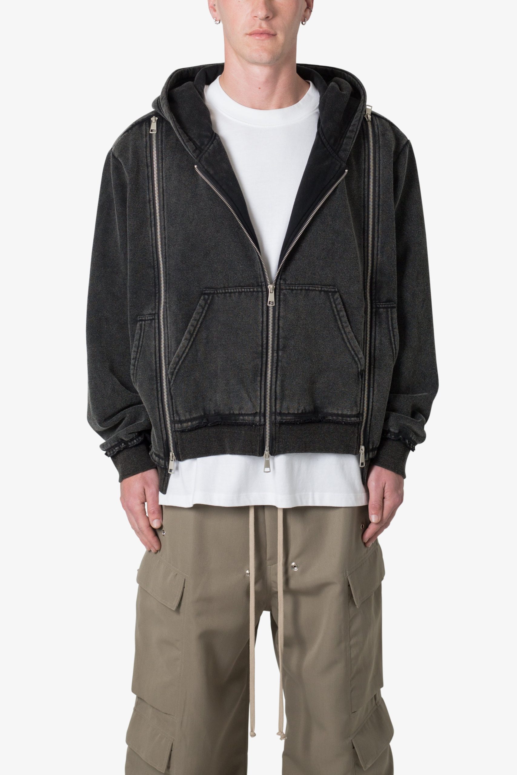the Dual Zipper Hoodie is designed from 100% cotton french terry. with a T8 metal zipper at the chest. a kangaroo pocket that is split onto both sides. additional zippers on the wearer’s front. and is finished with a garment wash.