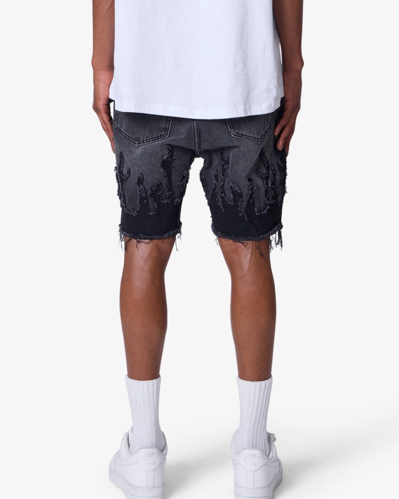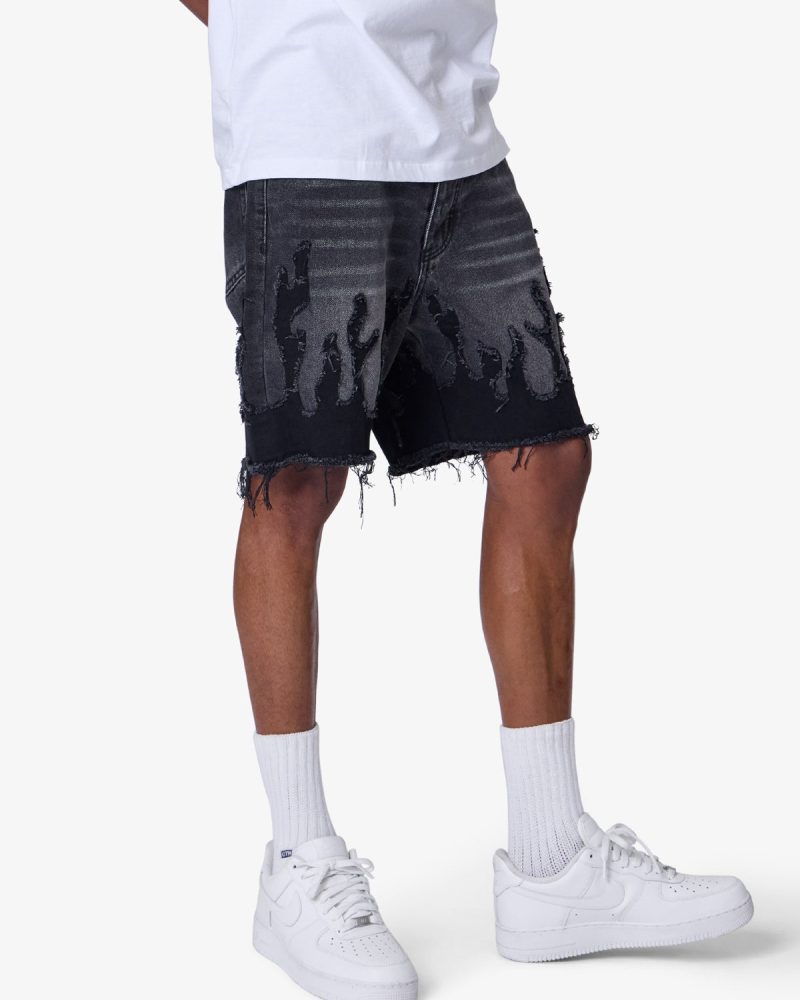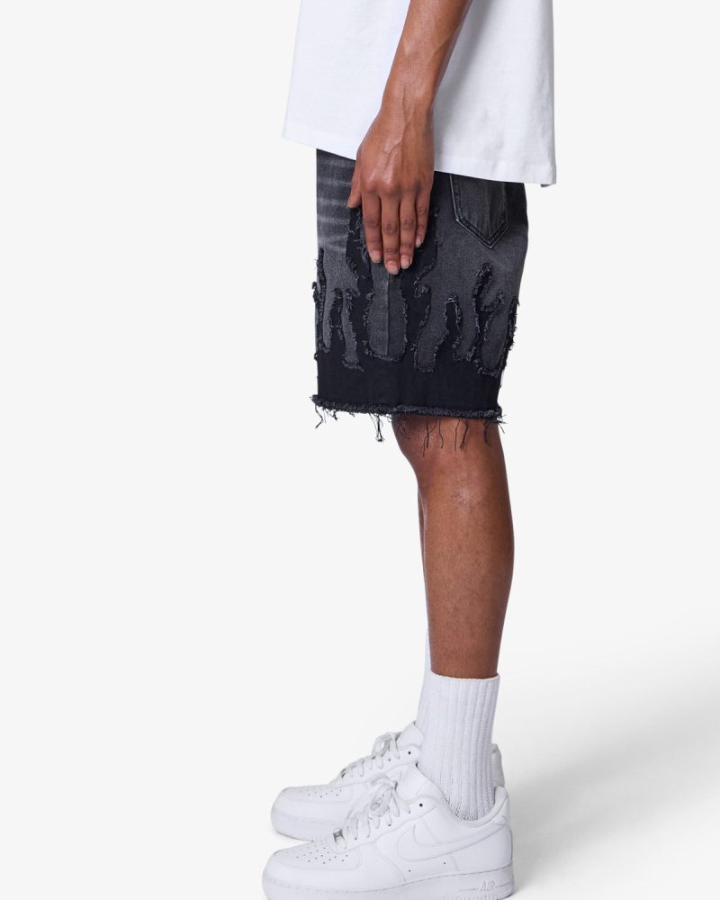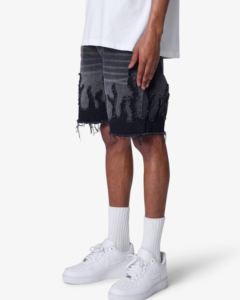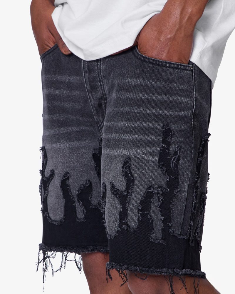 Introducing our Flame Denim Shorts. crafted from 100% cotton denim for ultimate comfort. These shorts feature a standard fit. ensuring a timeless silhouette. With intricate flame and dual-tone detailing. along with a distressed finish. they exude a bold and edgy style.