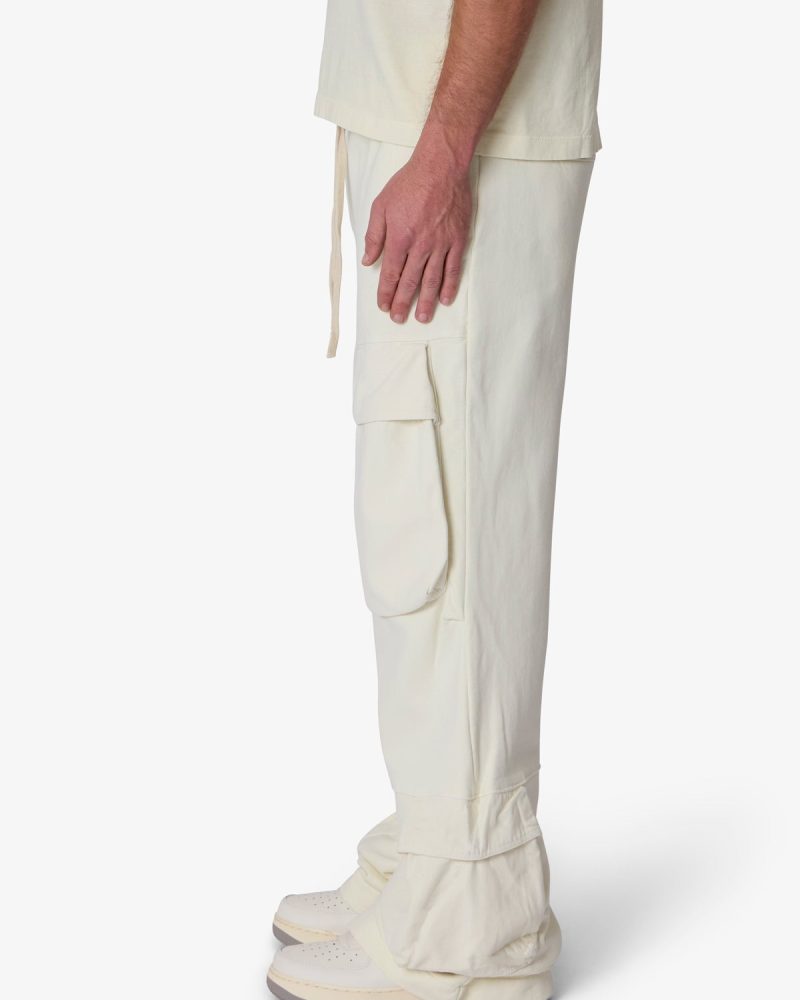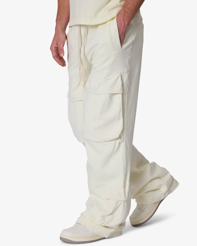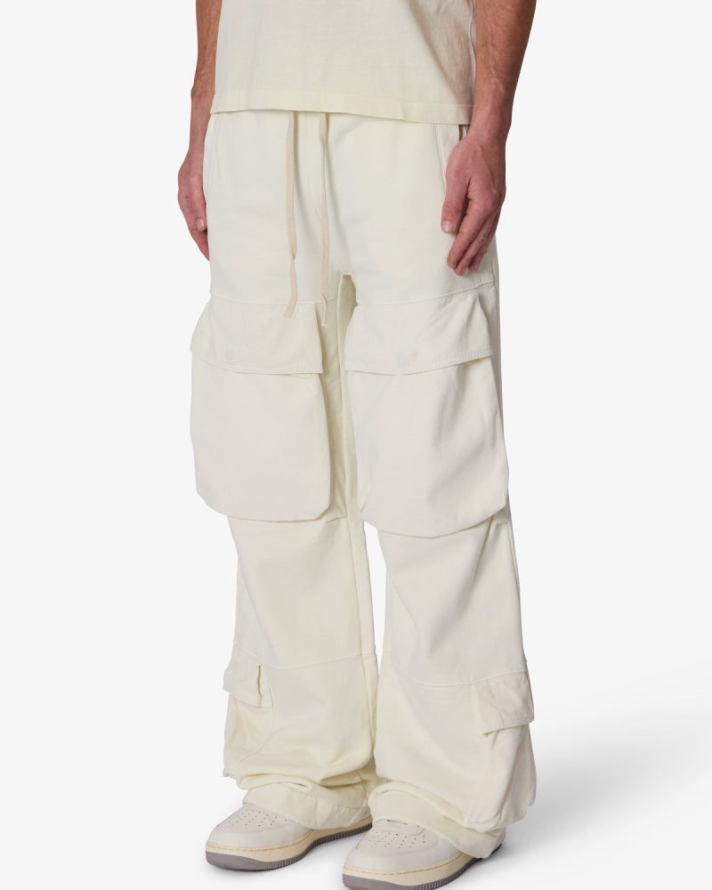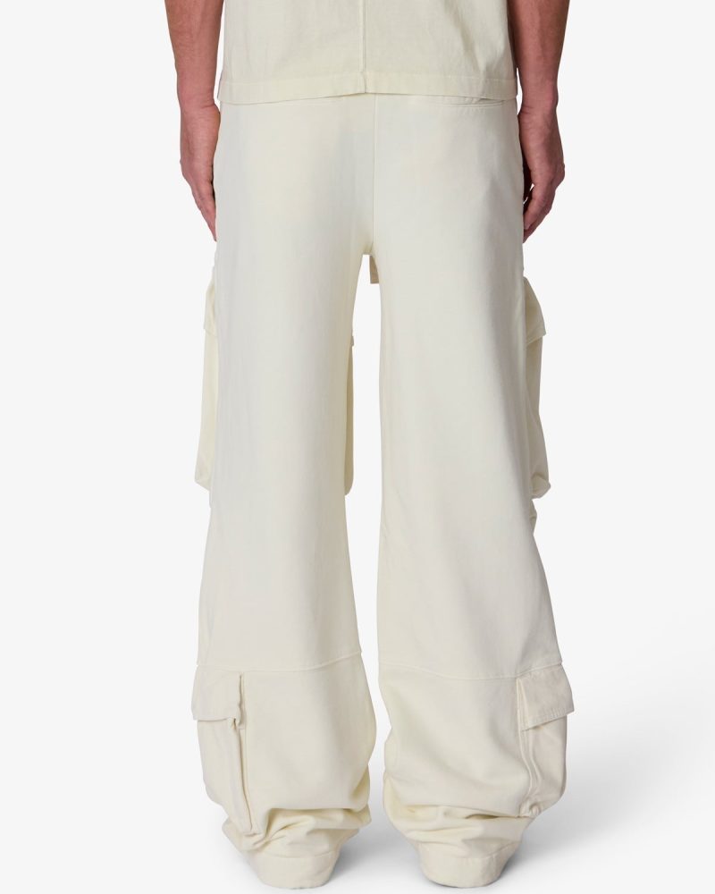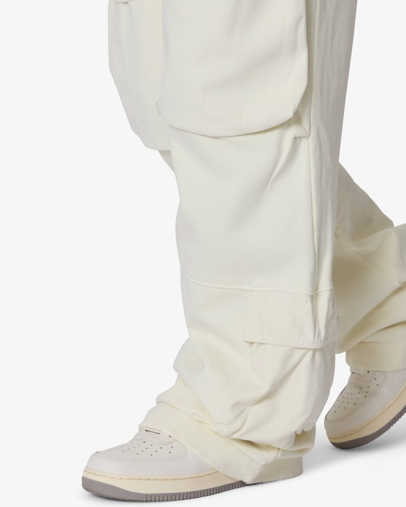 the Front Cargo Sweatpants are designed with a relaxed fit throughout with cargo pockets at the wearer’s front. welt pockets at the hip. internal drawcord. and finishing off with a garment wash.
