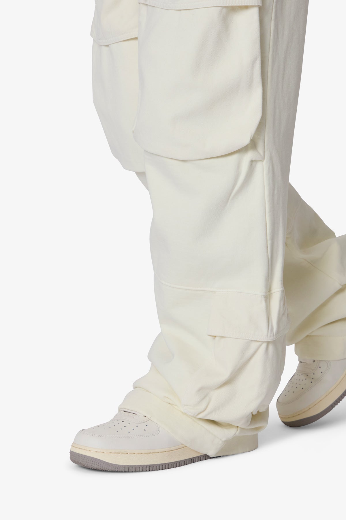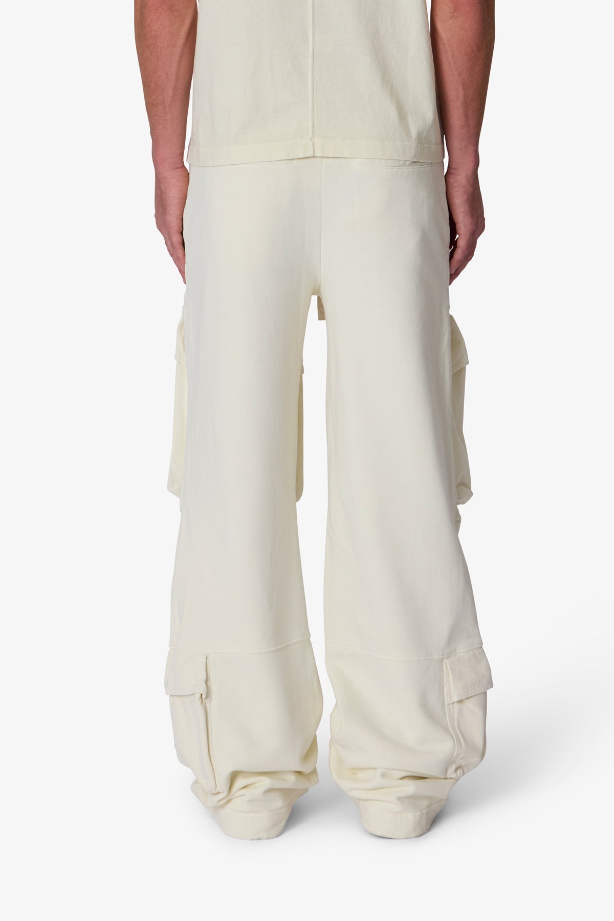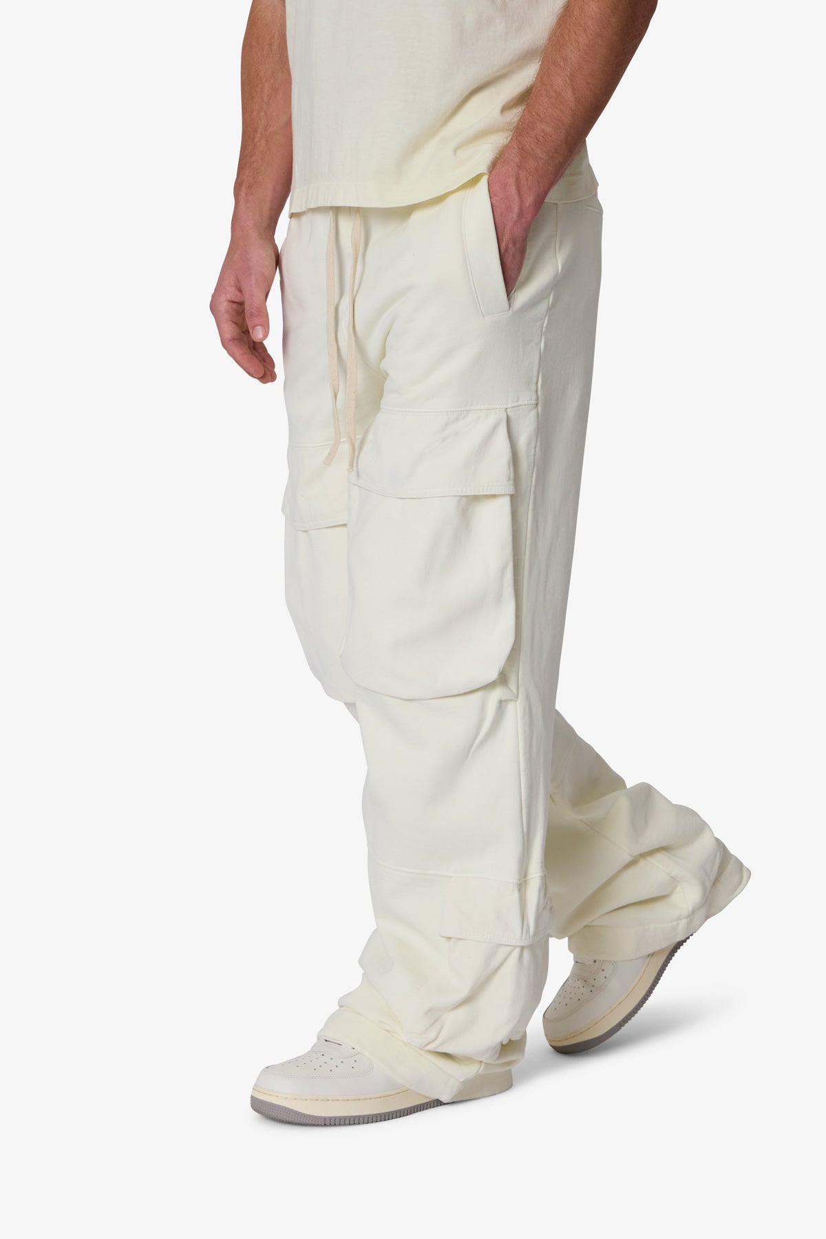 the Front Cargo Sweatpants are designed with a relaxed fit throughout with cargo pockets at the wearer’s front. welt pockets at the hip. internal drawcord. and finishing off with a garment wash.