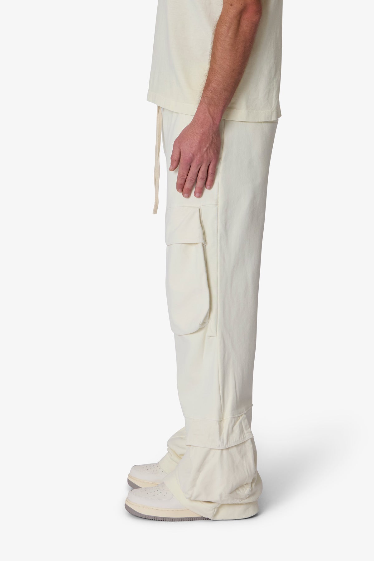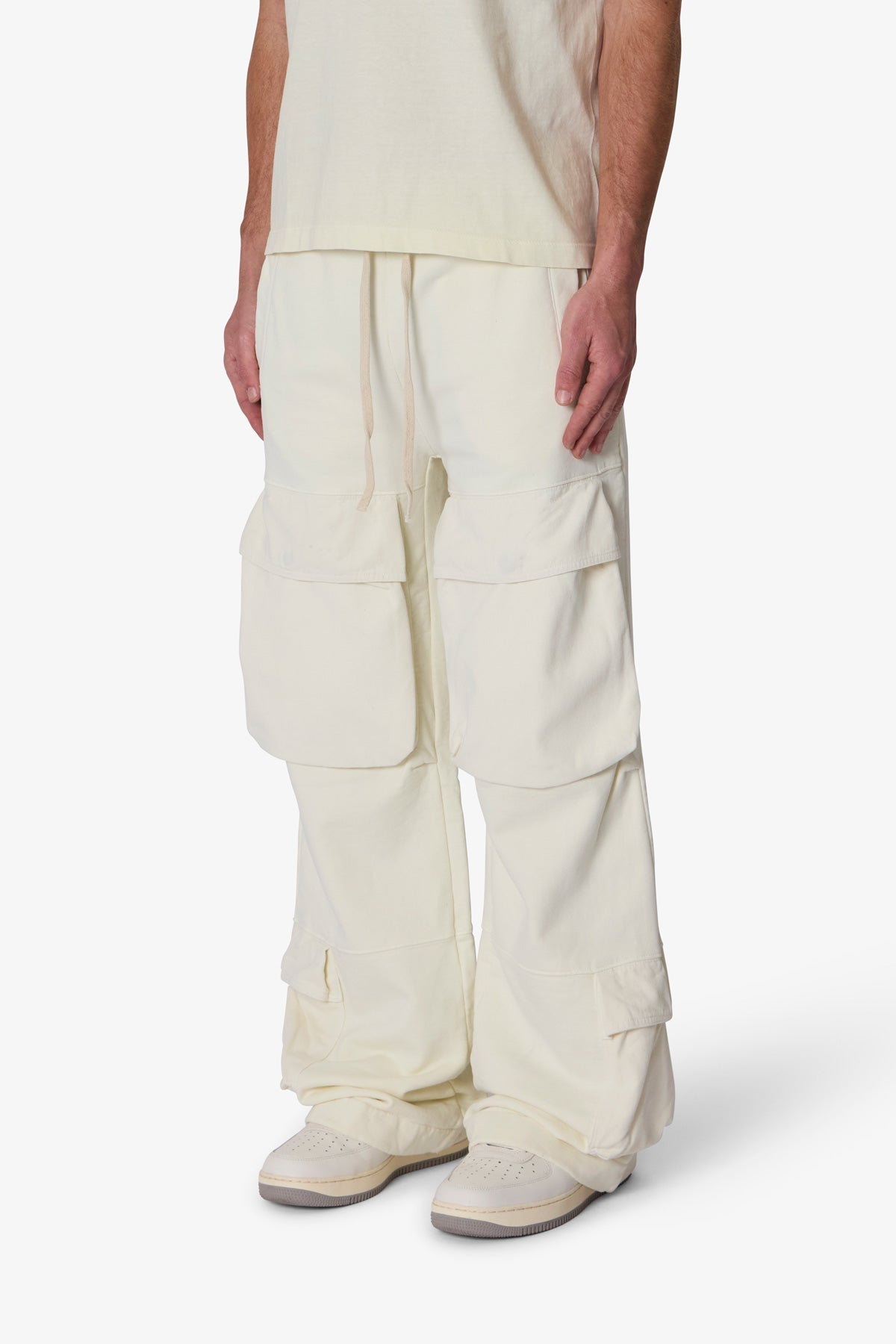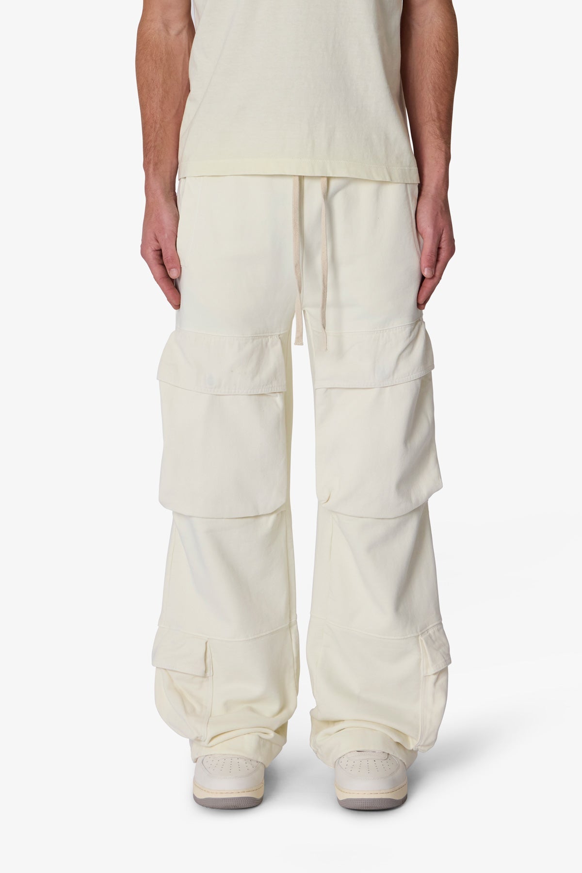 the Front Cargo Sweatpants are designed with a relaxed fit throughout with cargo pockets at the wearer’s front. welt pockets at the hip. internal drawcord. and finishing off with a garment wash.
