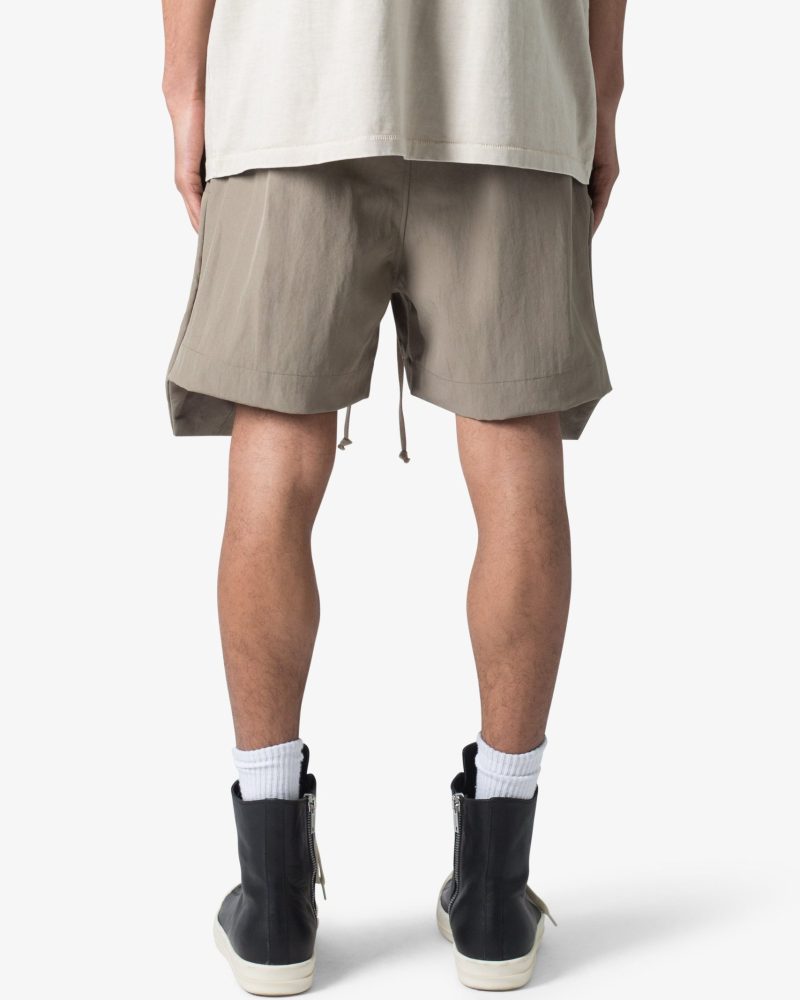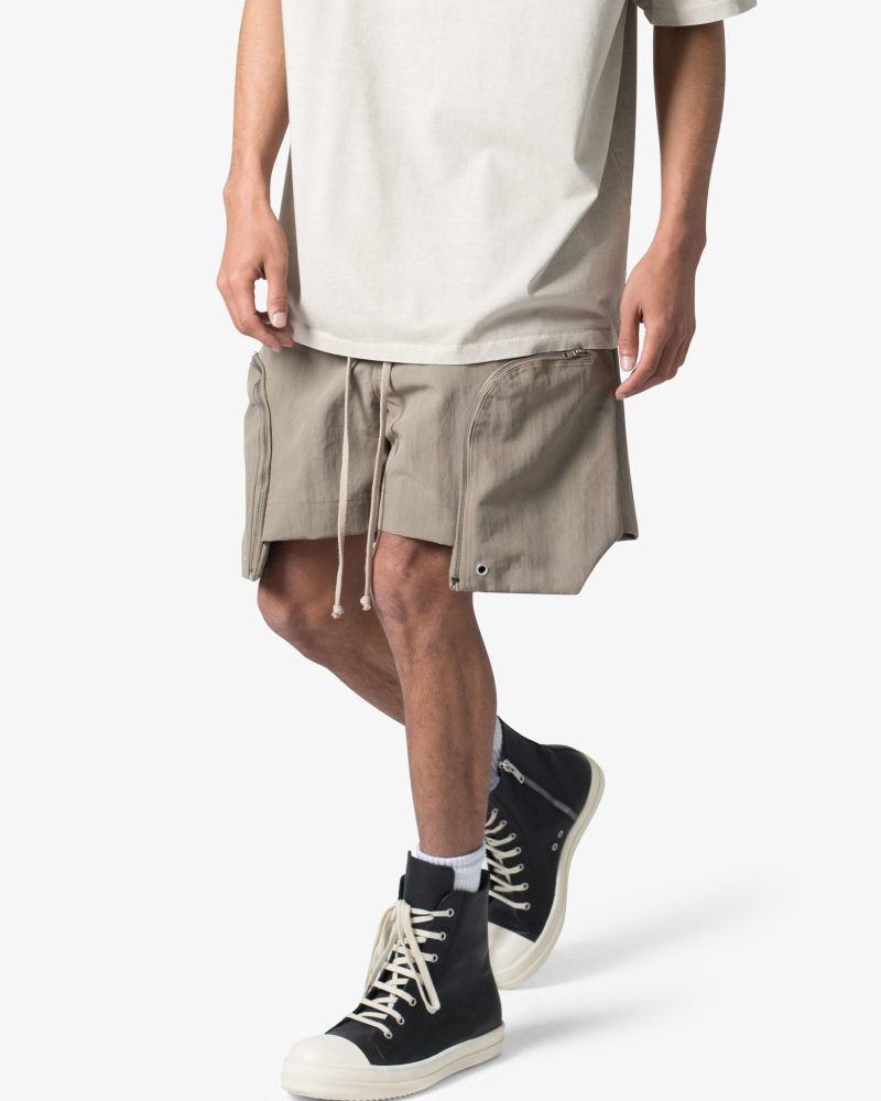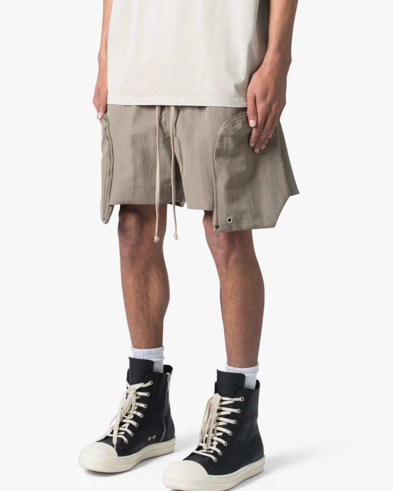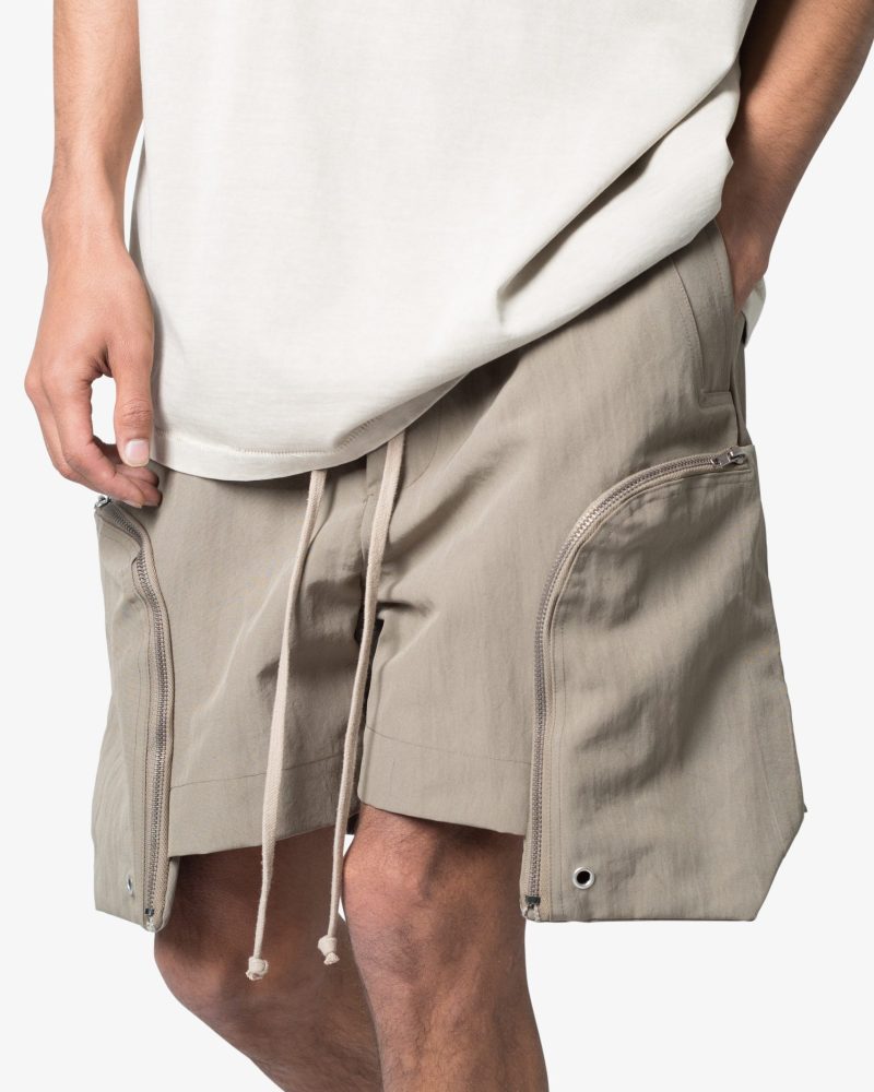 the Front Pocket Geo Shorts are constructed from a polyester fabric in a baggy fit. The shorts feature an elasticized waist. welt pockets. exaggerated zipper pockets that extend past the leg opening with grommet details. and finished with a contrasting cotton drawcords.