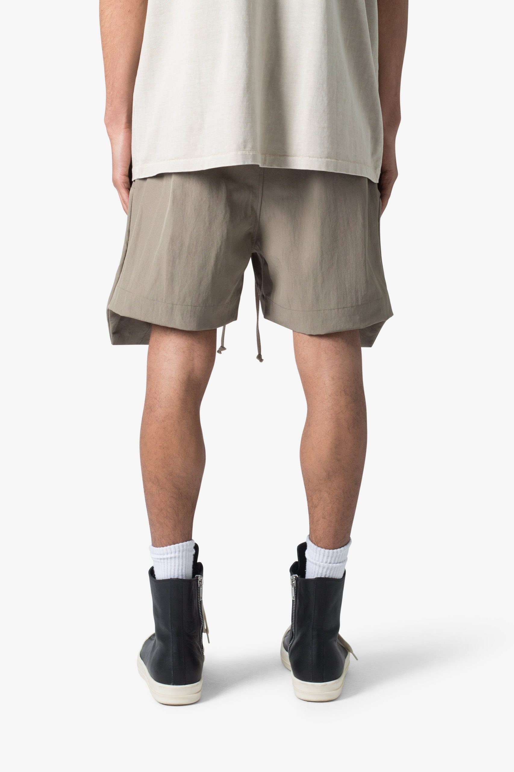 the Front Pocket Geo Shorts are constructed from a polyester fabric in a baggy fit. The shorts feature an elasticized waist. welt pockets. exaggerated zipper pockets that extend past the leg opening with grommet details. and finished with a contrasting cotton drawcords.