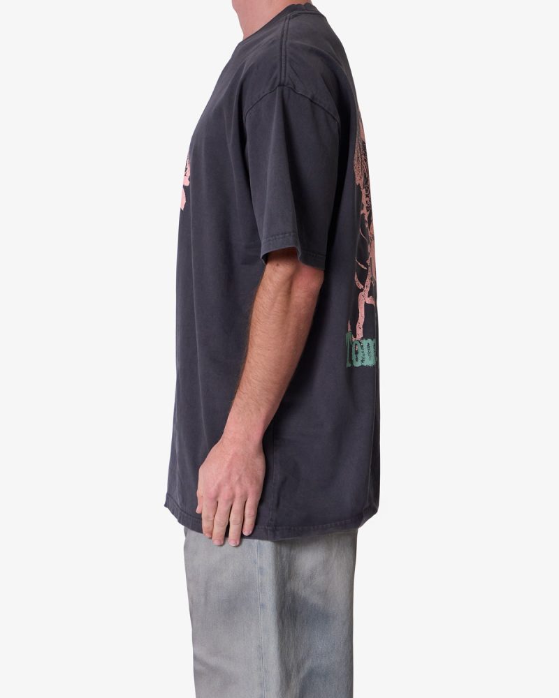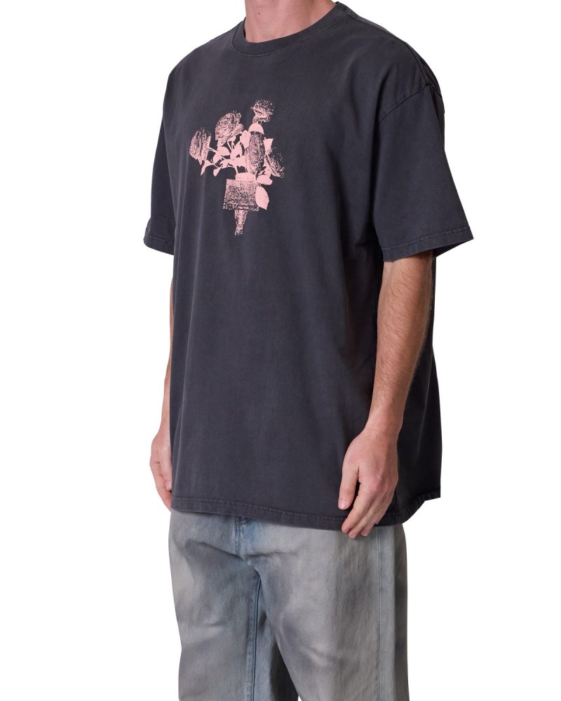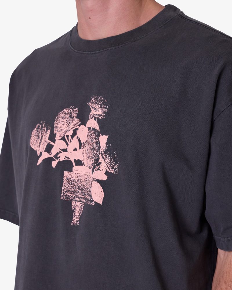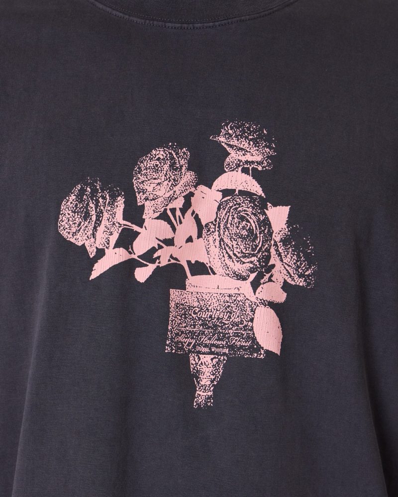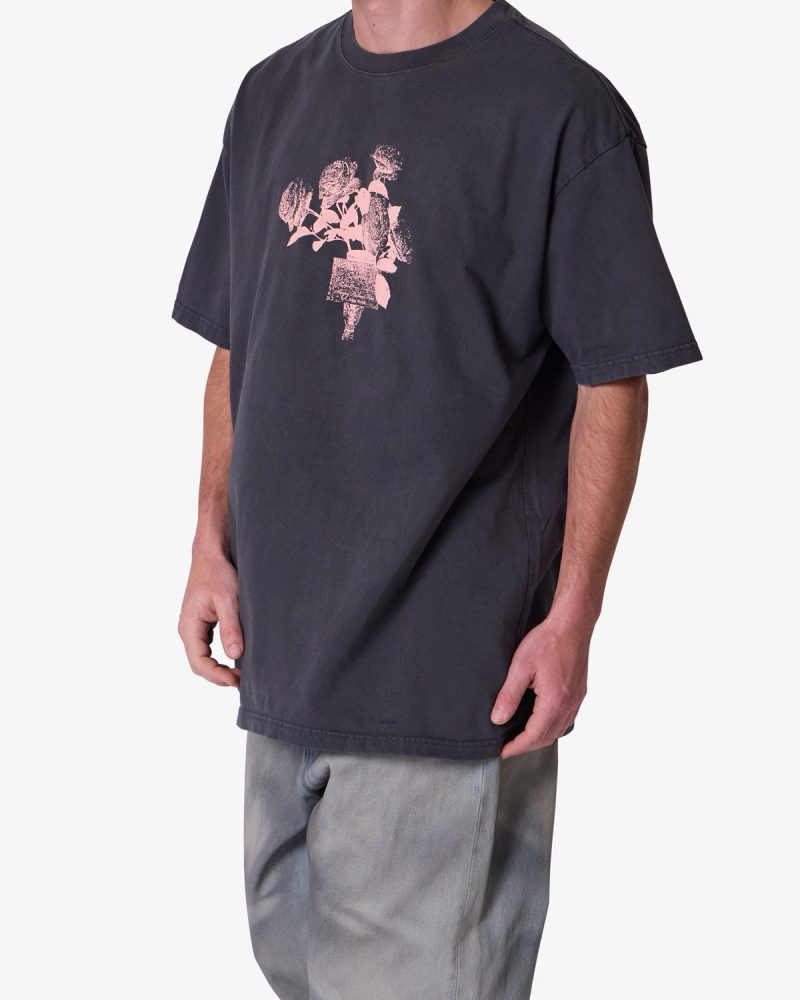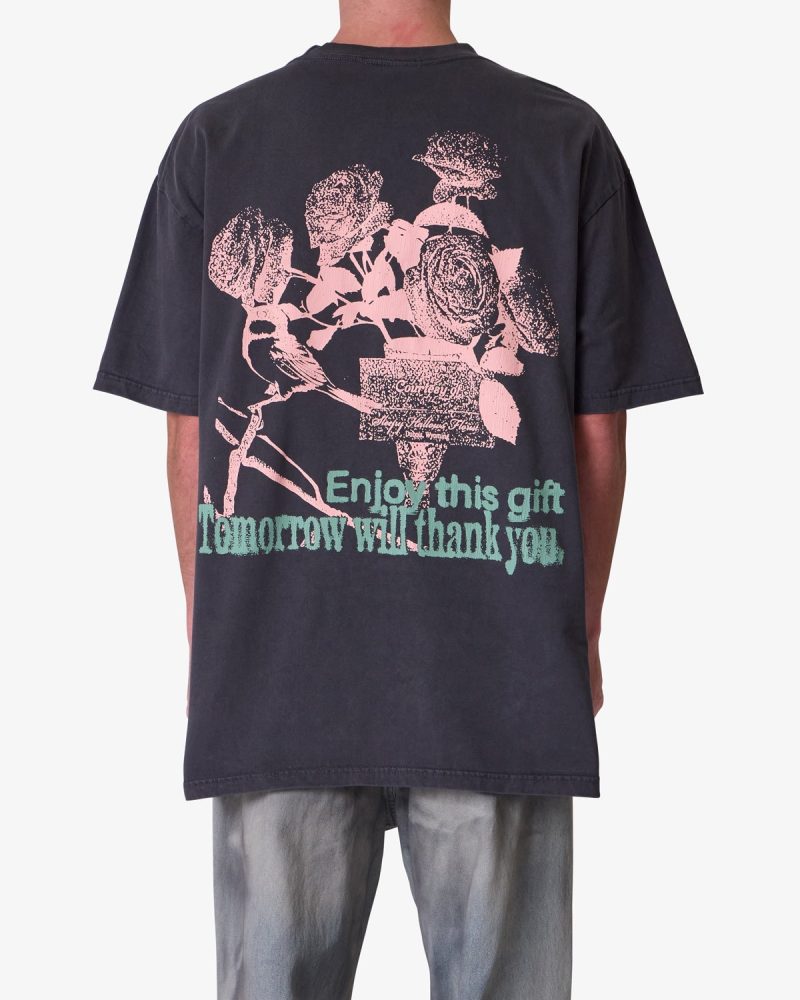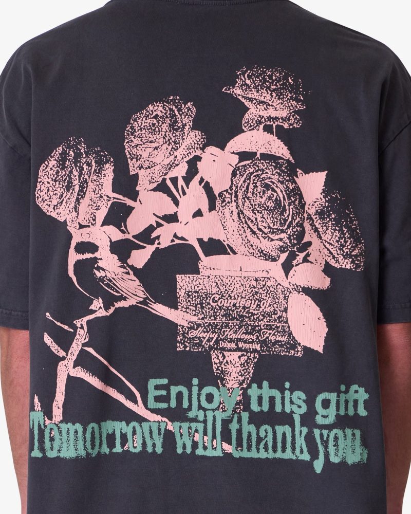 the Gift Tee features a relaxed and boxy fit. ribbing at the neck. a standard hem. printed graphics on the front and back. and finished with a garment dye for a vintage feel.