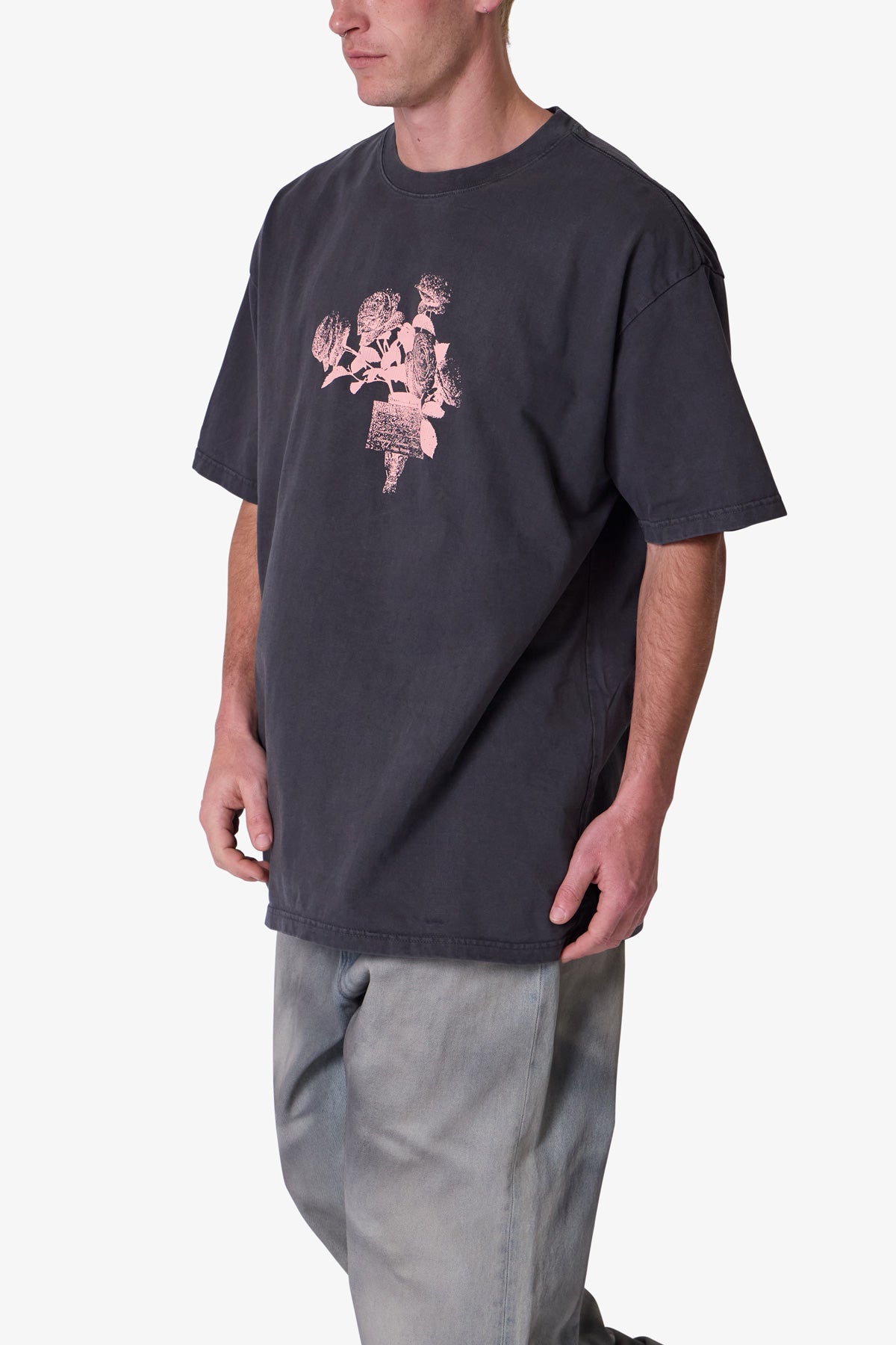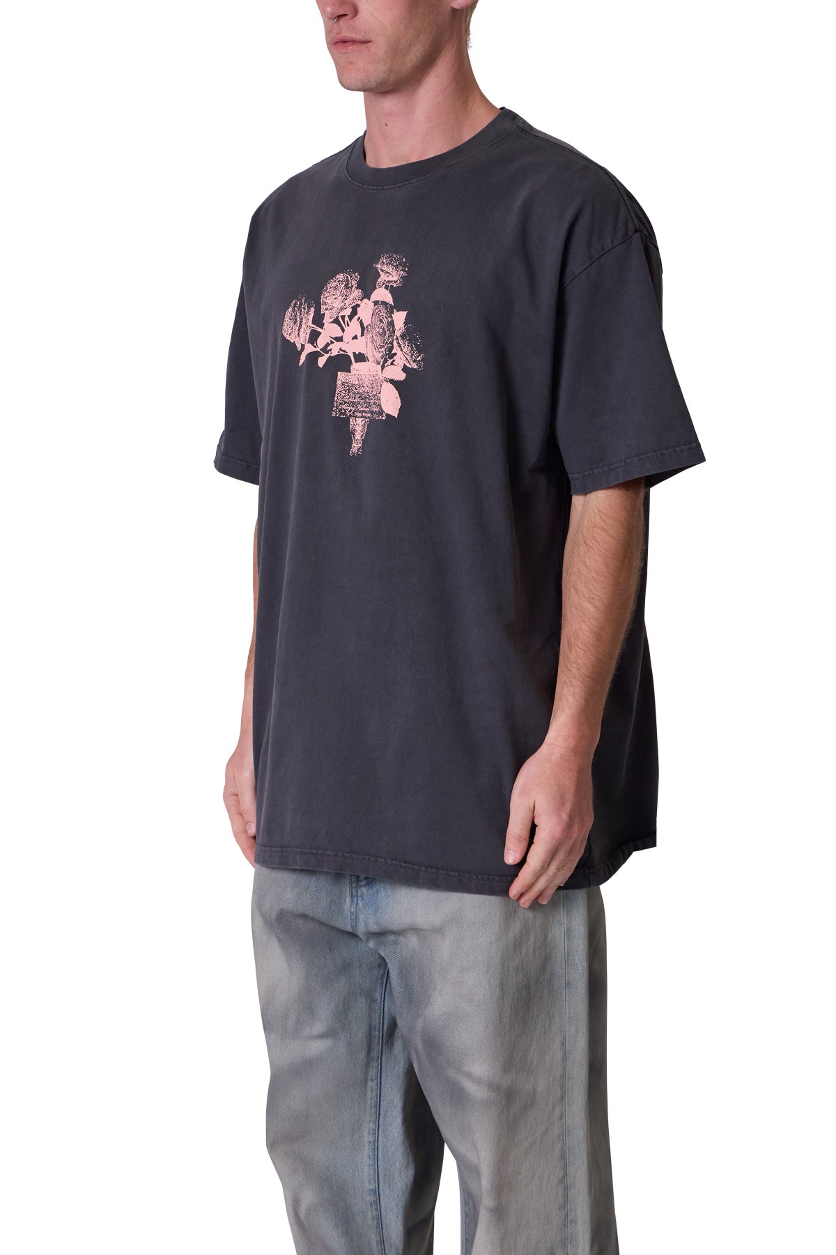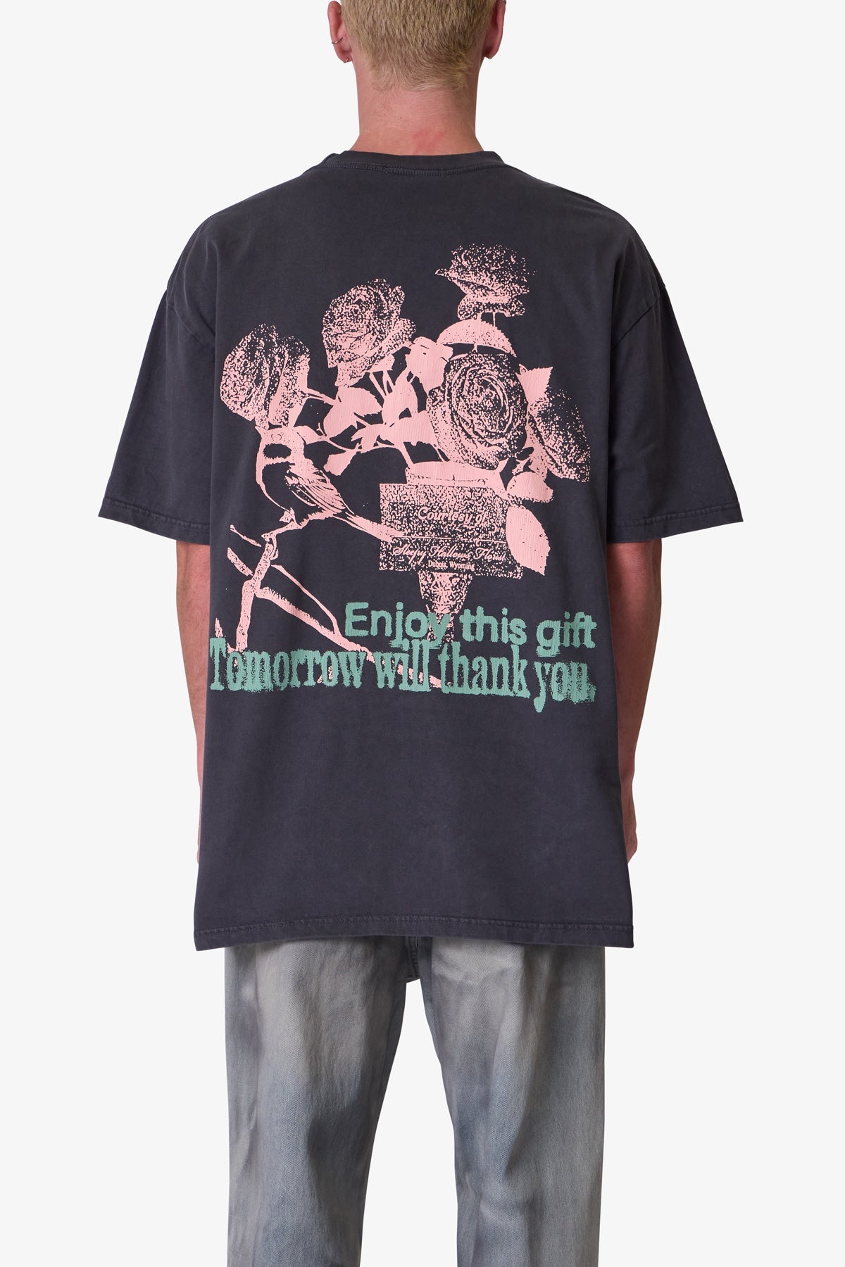the Gift Tee features a relaxed and boxy fit. ribbing at the neck. a standard hem. printed graphics on the front and back. and finished with a garment dye for a vintage feel.