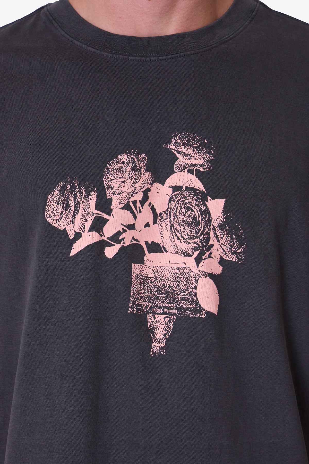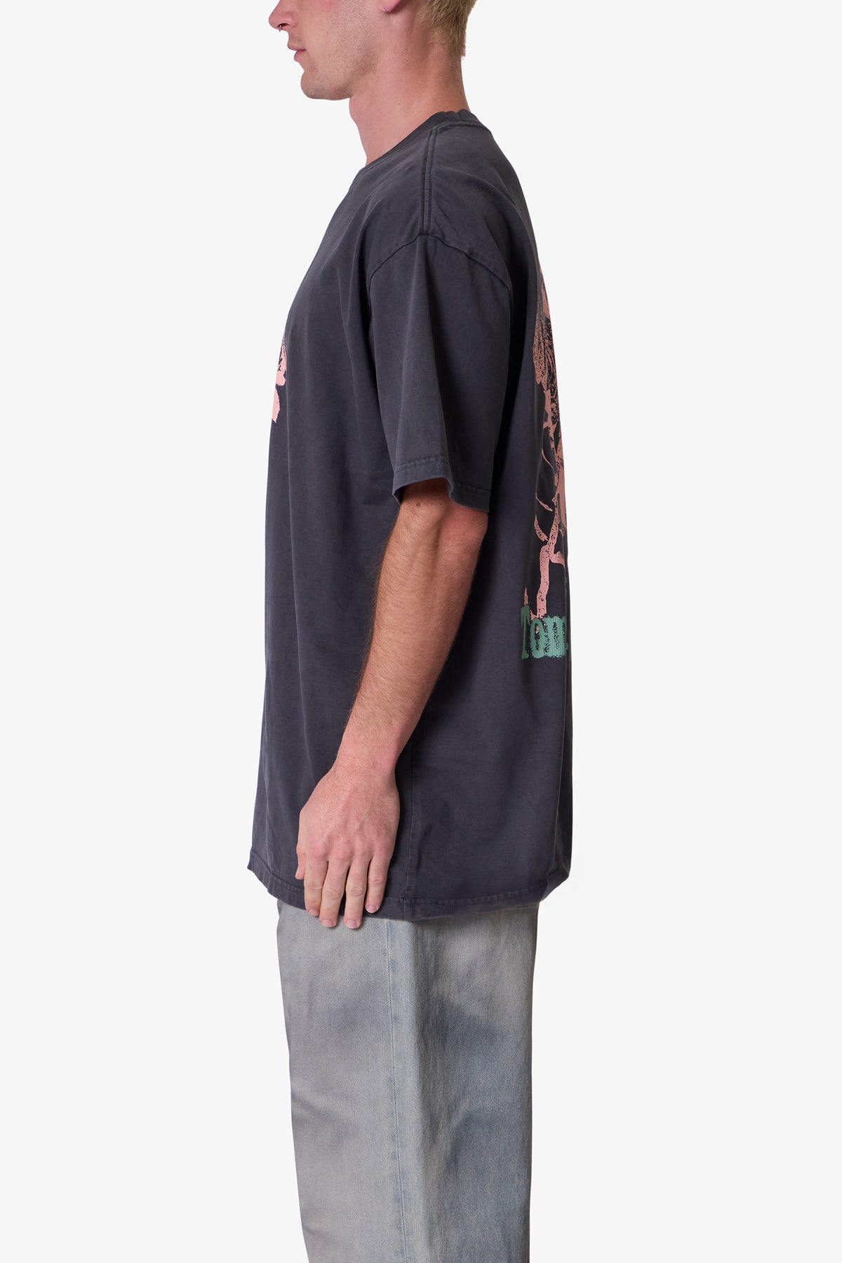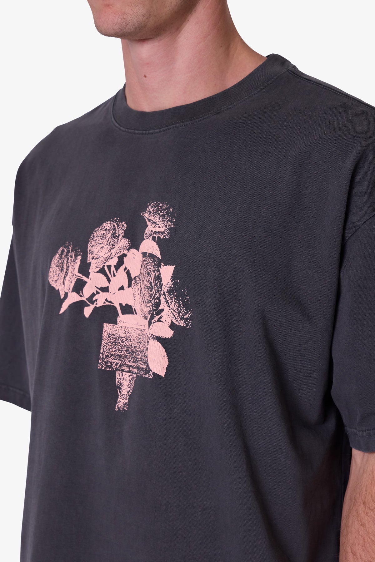 the Gift Tee features a relaxed and boxy fit. ribbing at the neck. a standard hem. printed graphics on the front and back. and finished with a garment dye for a vintage feel.